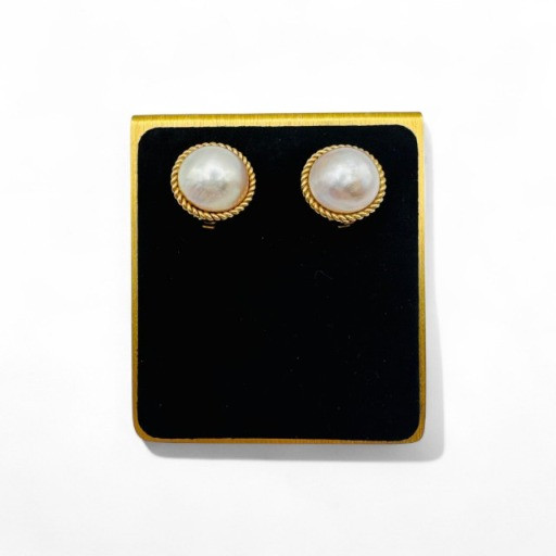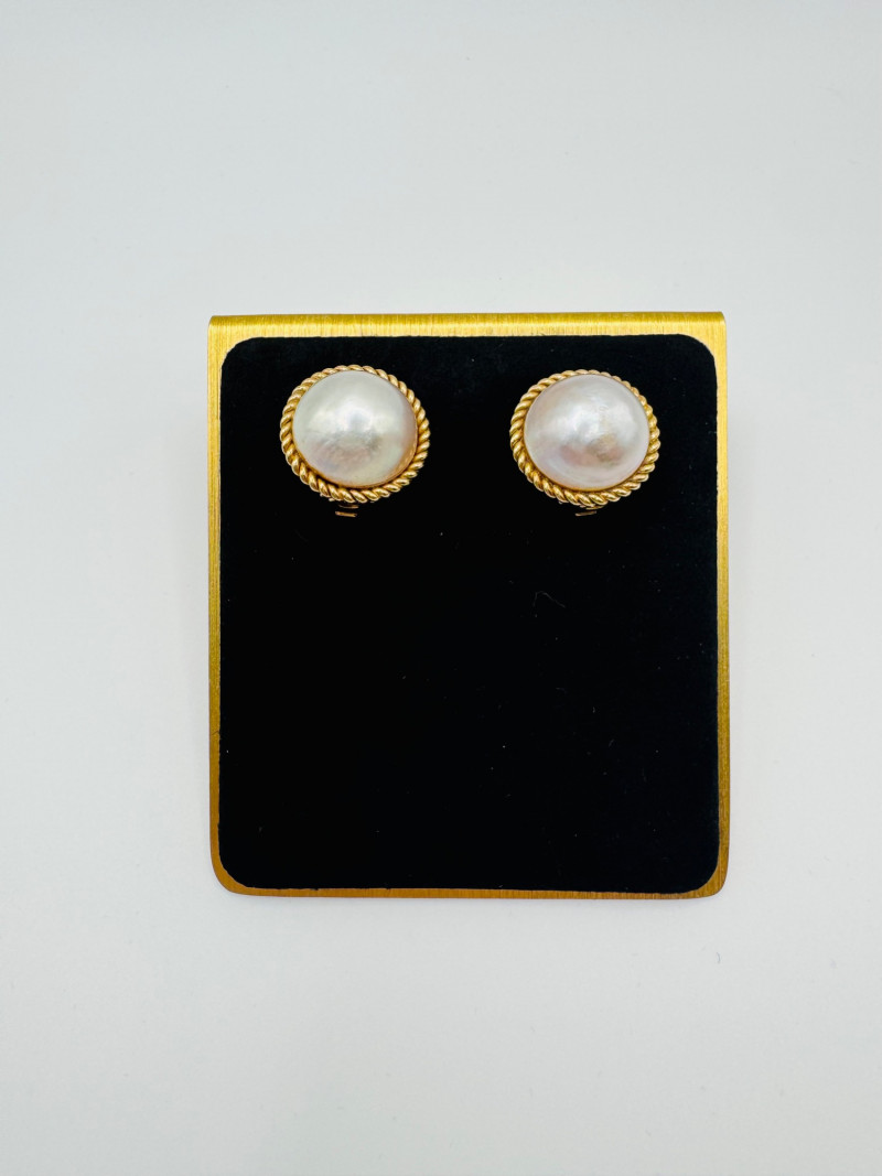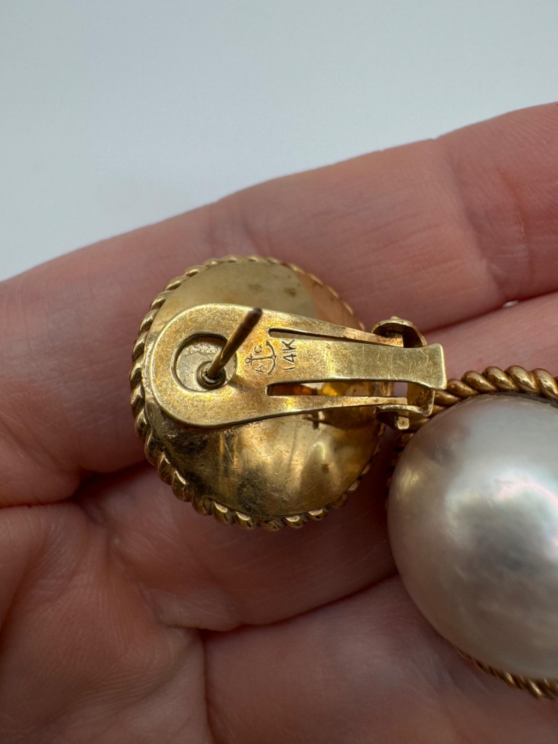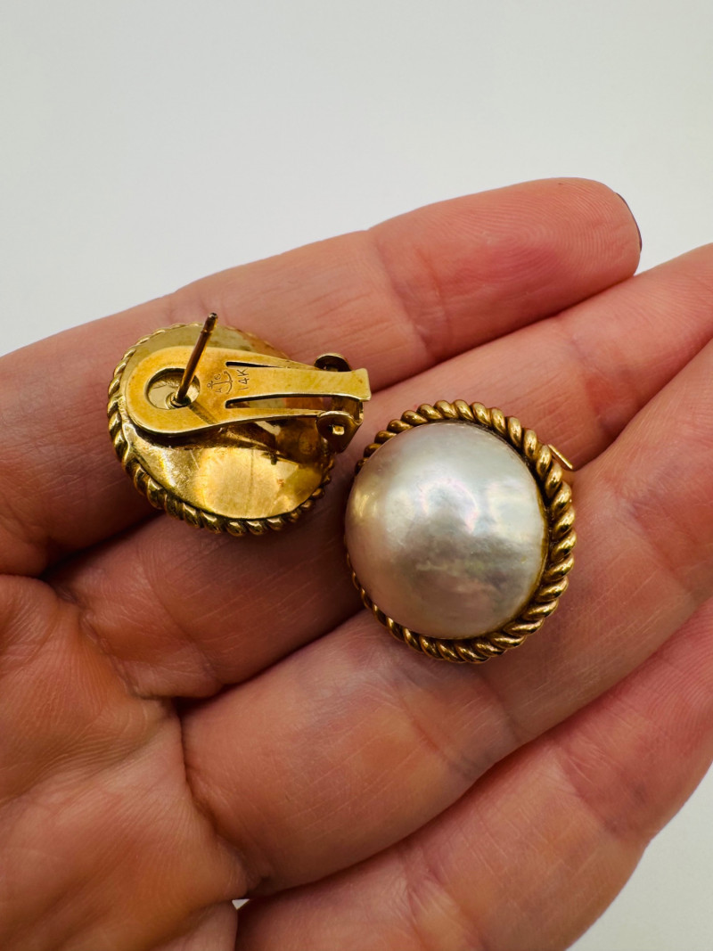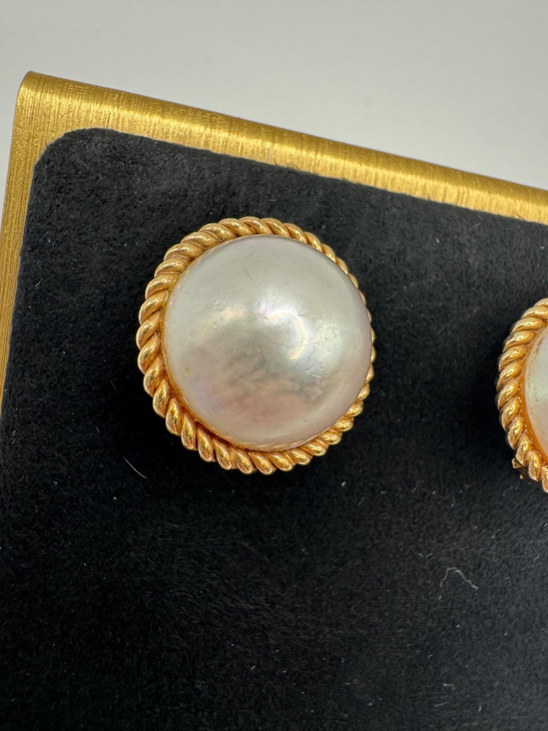 14K Gold Mabe-Like Pearl Earrings – Rope Edge Design, 13g.