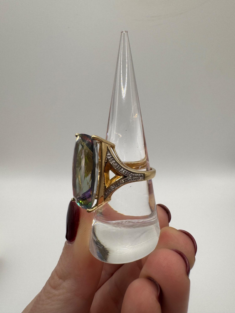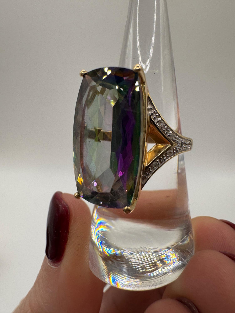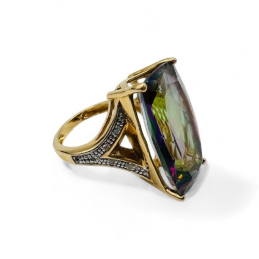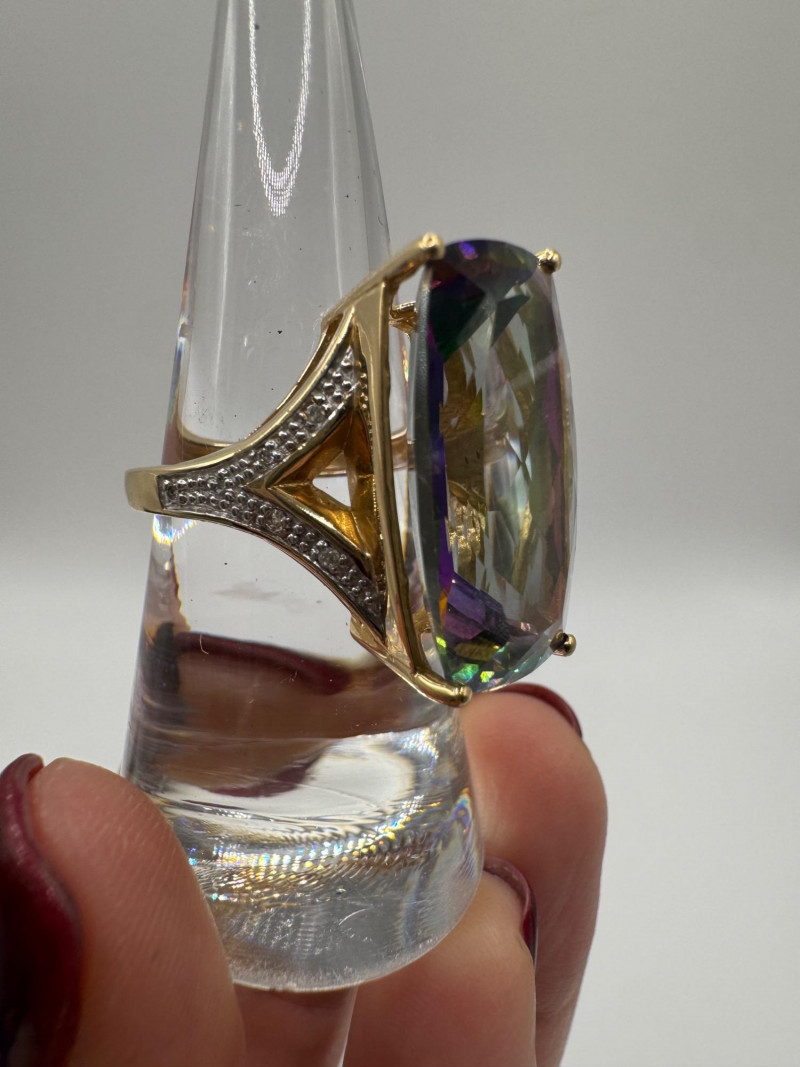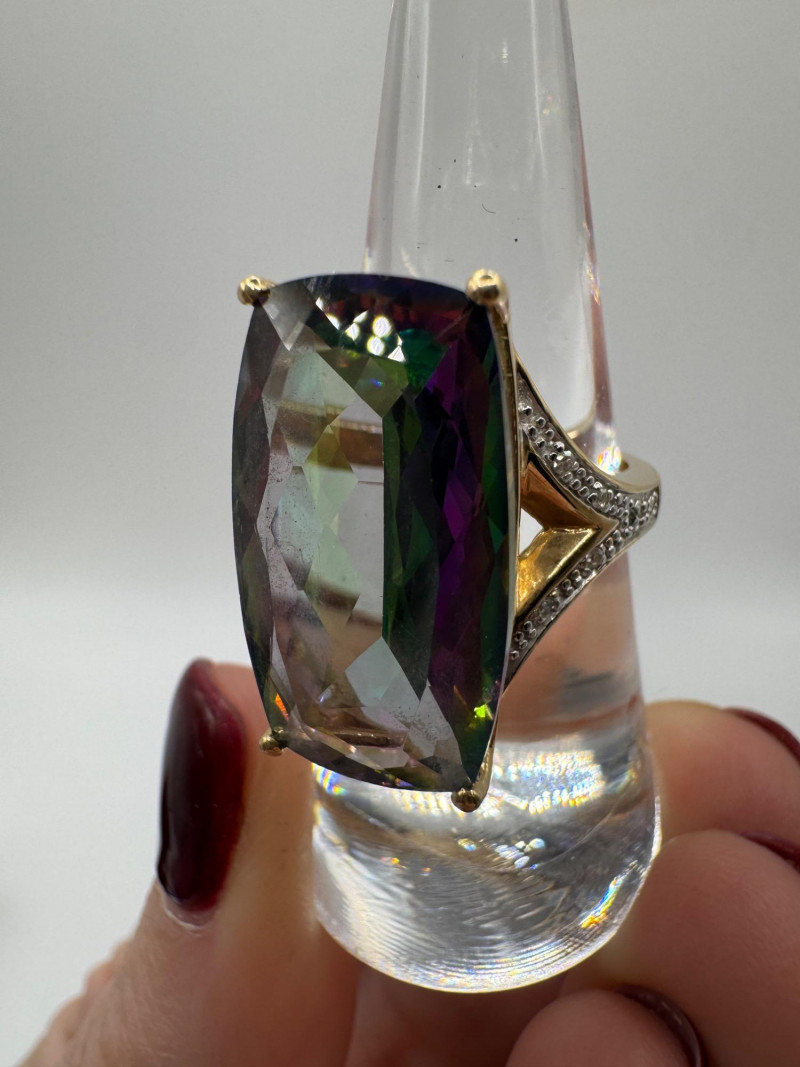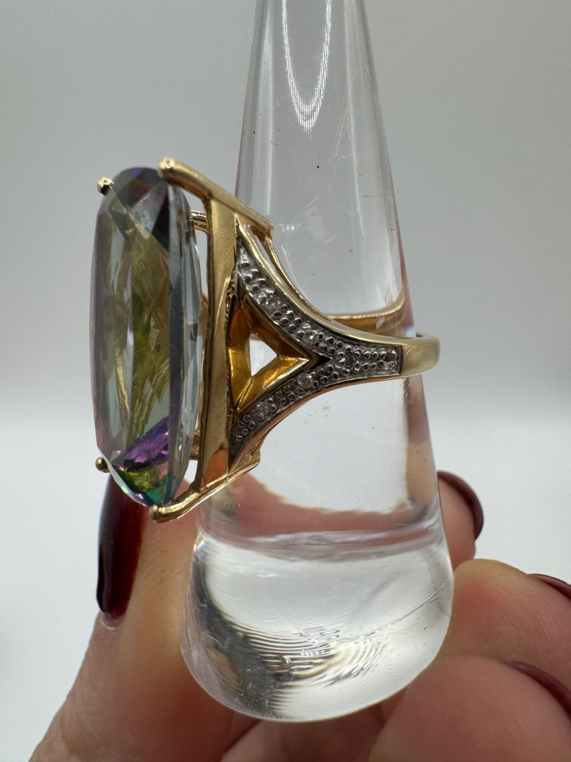 10K Gold Ring w/ Large Mystic Topaz & Diamond Accents – Size 7, 7.84g.