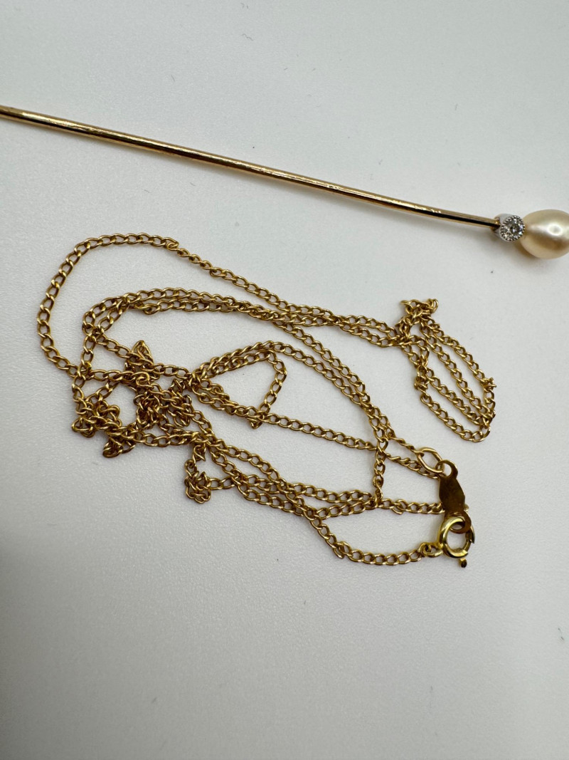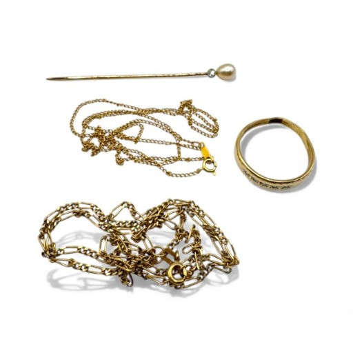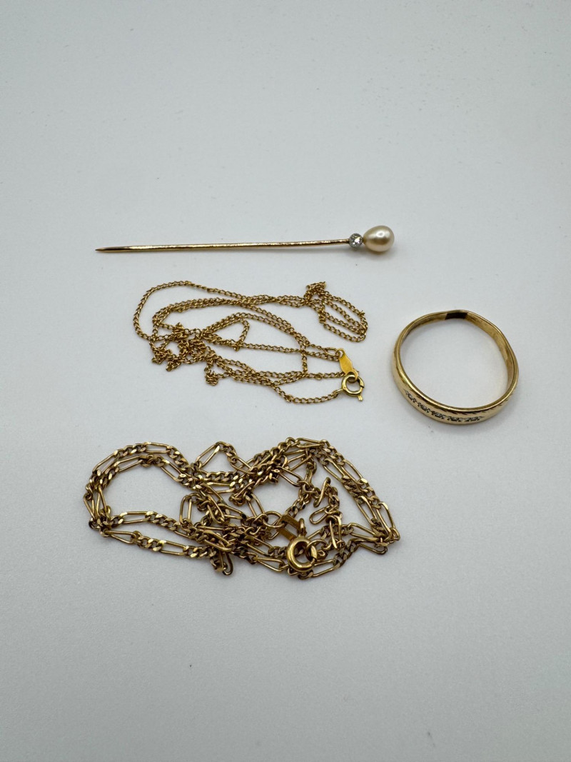 Includes: (1) 18" 9K gold chain, approx. 3.48g (3) 14K gold pieces with diamond accents, combined approx. 6.34g Mixed lot includes ring, chain, and stick pin. Total weight: approx. 9.82 grams General Disclaimer for This Auction: Select precious metal pieces have been tested and are individually marked. All diamonds have been tested. Other stones (e.g., rubies, sapphires, etc.) have NOT been examined by a professional jeweler. These item details were provided by the jewelry owner. By bidding, you agree to purchase the items as is, with no guarantees regarding metal purity, gemstone authenticity, or content. No refunds will be issued on these factors.