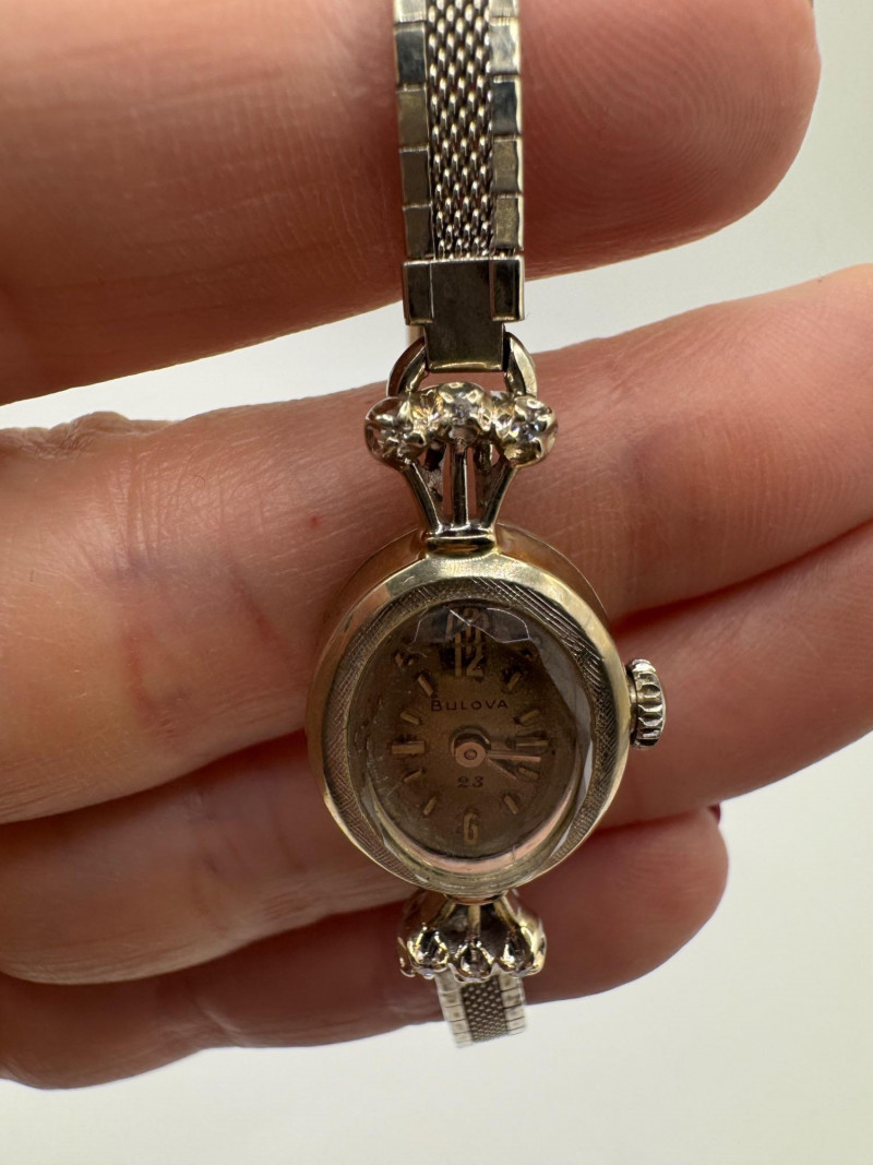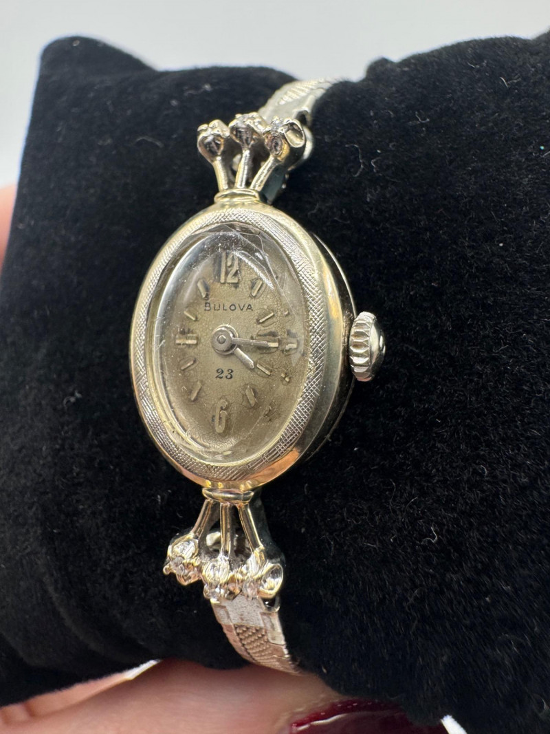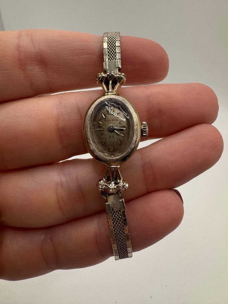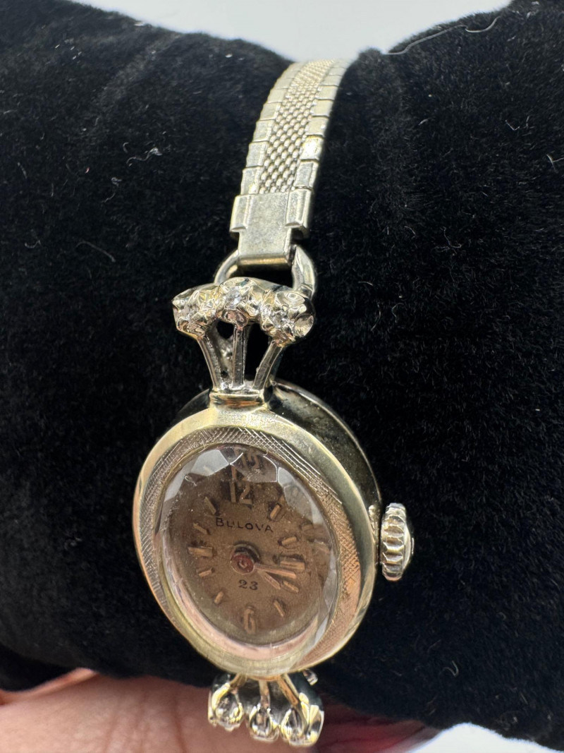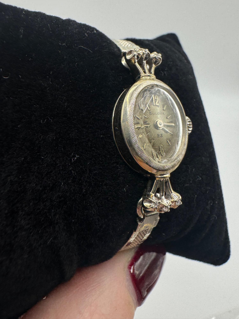 14K Gold Bulova Ladies Watch w/ Diamonds – 11.36g. General Disclaimer for This Auction: Select precious metal pieces have been tested and are individually marked. All diamonds have been tested. Other stones (e.g., rubies, sapphires, etc.) have NOT been examined by a professional jeweler. These item details were provided by the jewelry owner. By bidding, you agree to purchase the items as is, with no guarantees regarding metal purity, gemstone authenticity, or content. No refunds will be issued on these factors.