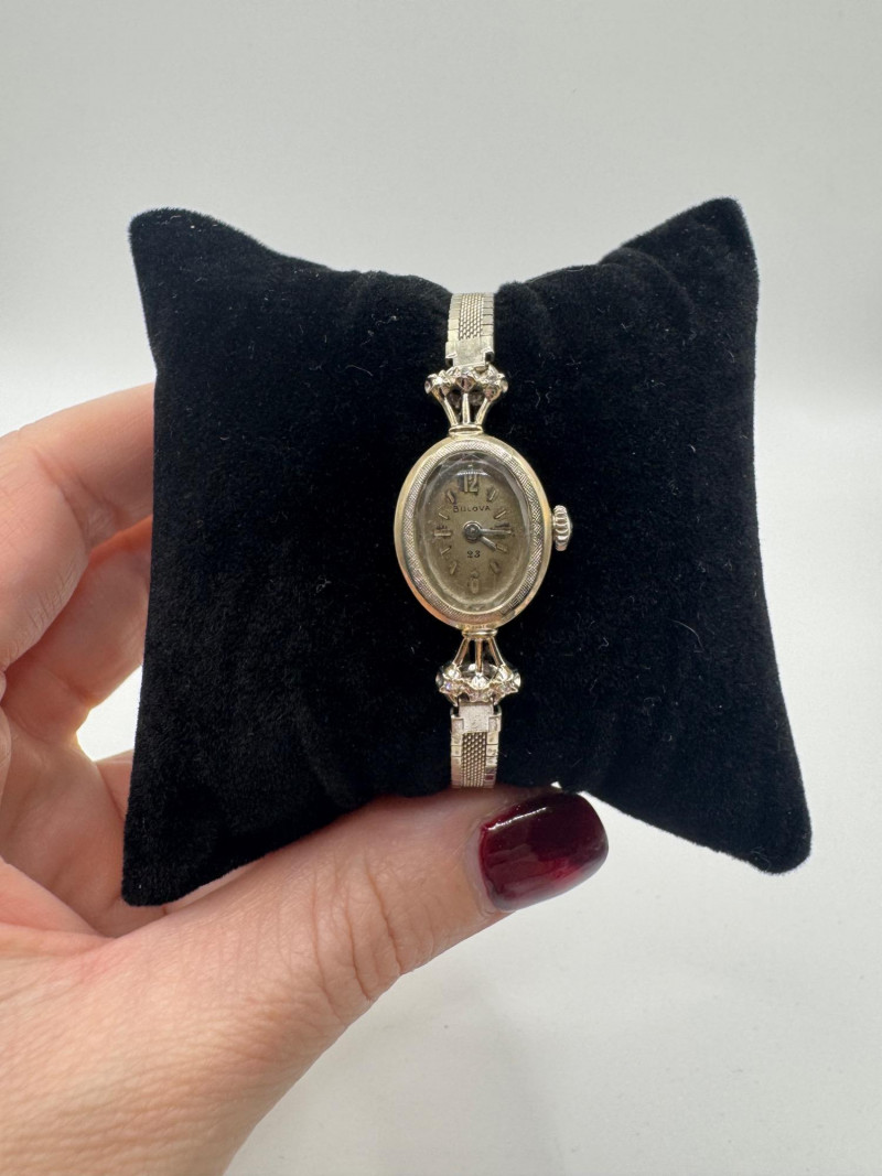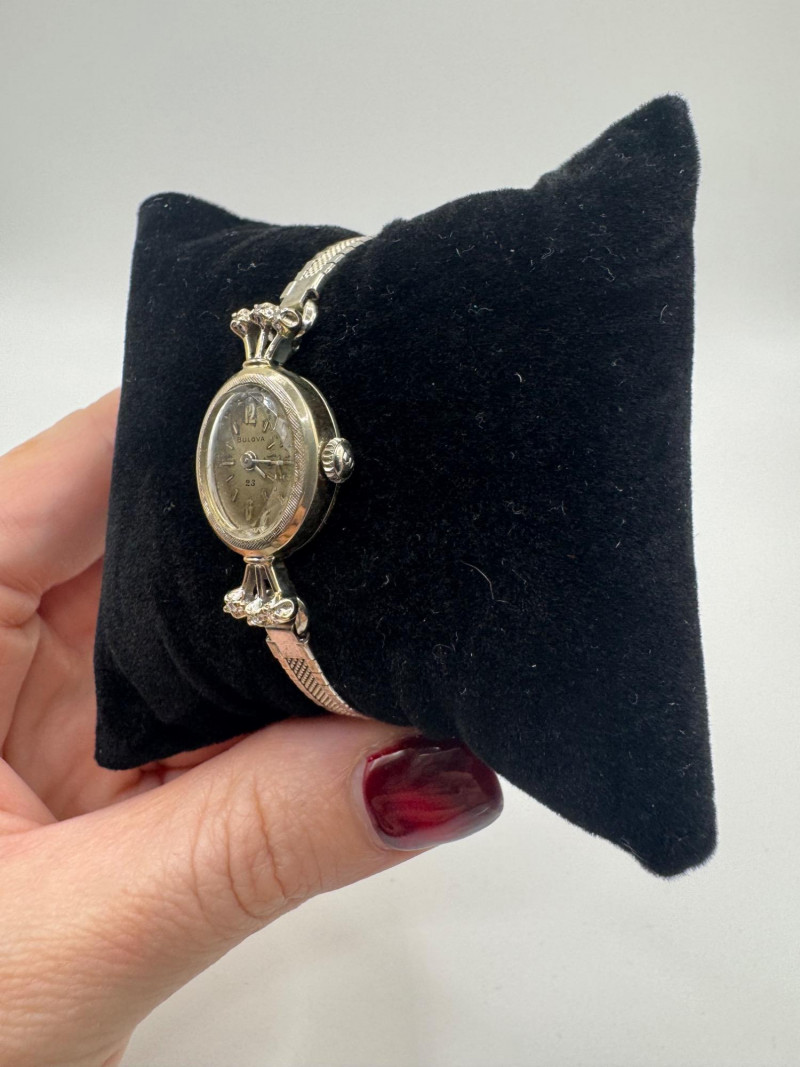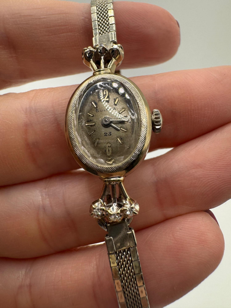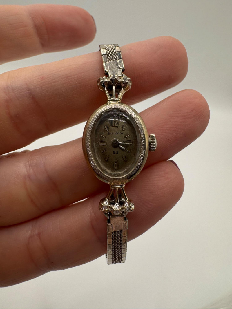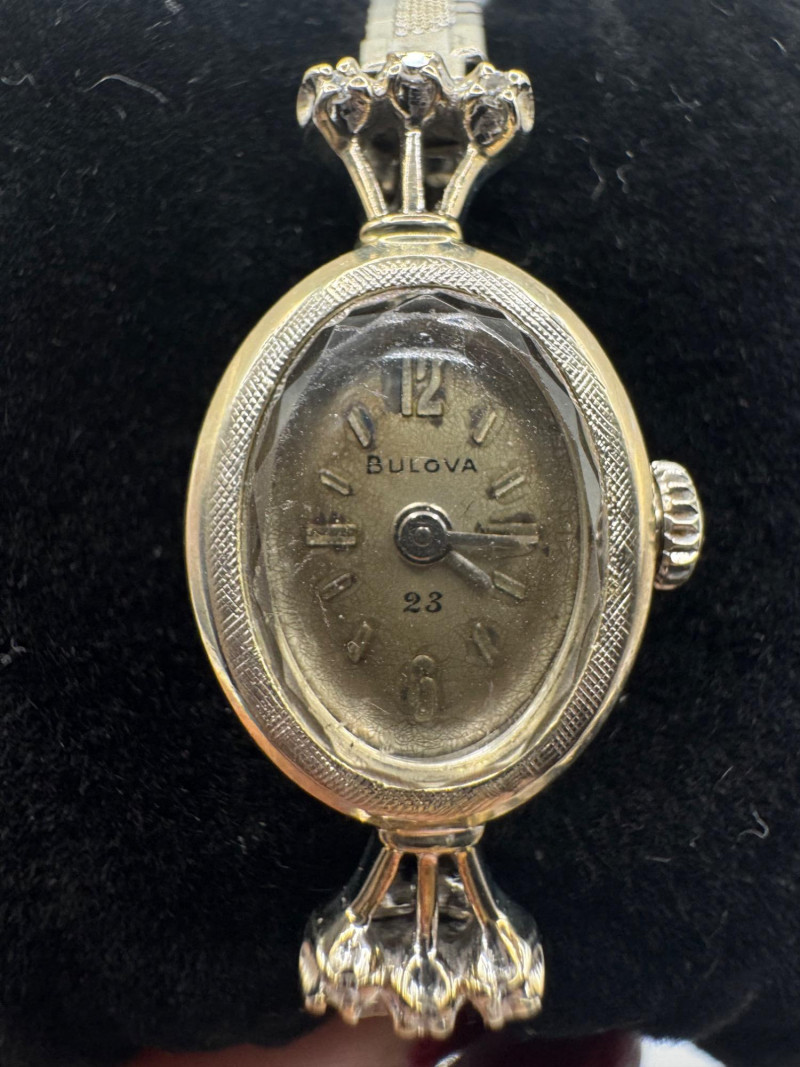 14K Gold Bulova Ladies Watch w/ Diamonds – 11.36g. General Disclaimer for This Auction: Select precious metal pieces have been tested and are individually marked. All diamonds have been tested. Other stones (e.g., rubies, sapphires, etc.) have NOT been examined by a professional jeweler. These item details were provided by the jewelry owner. By bidding, you agree to purchase the items as is, with no guarantees regarding metal purity, gemstone authenticity, or content. No refunds will be issued on these factors.