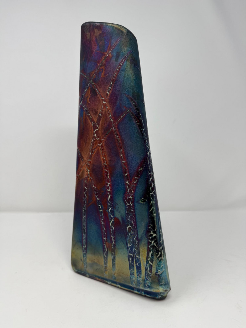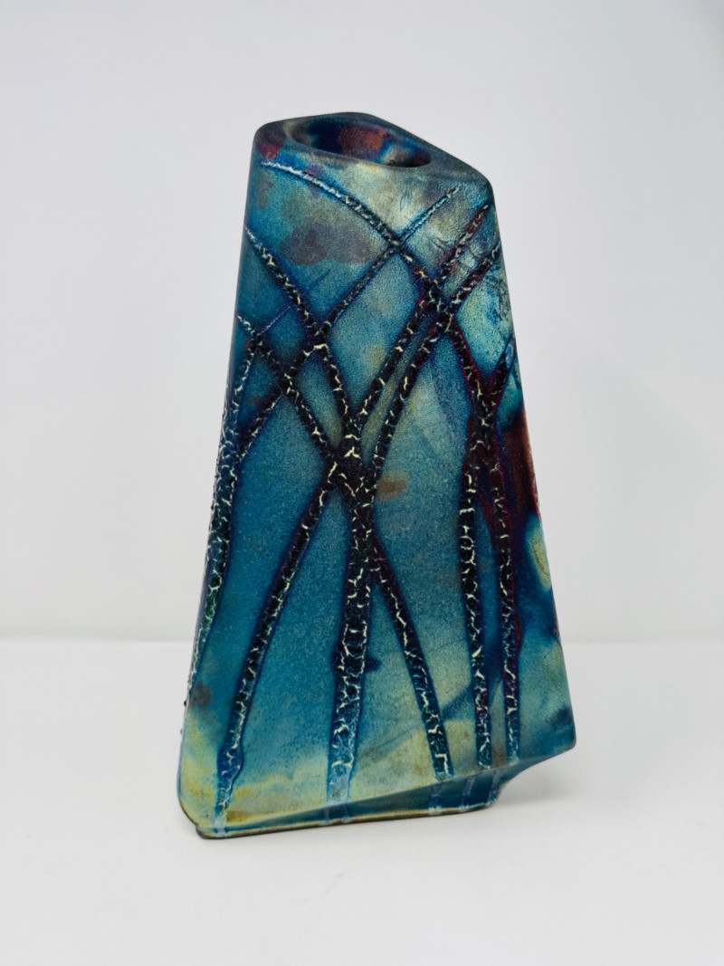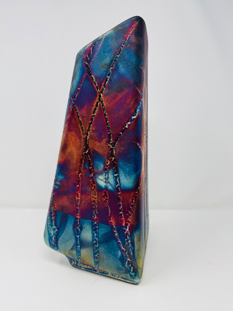 William K. Turner Signed Raku Vase – Triangular Iridescent Form $200.
