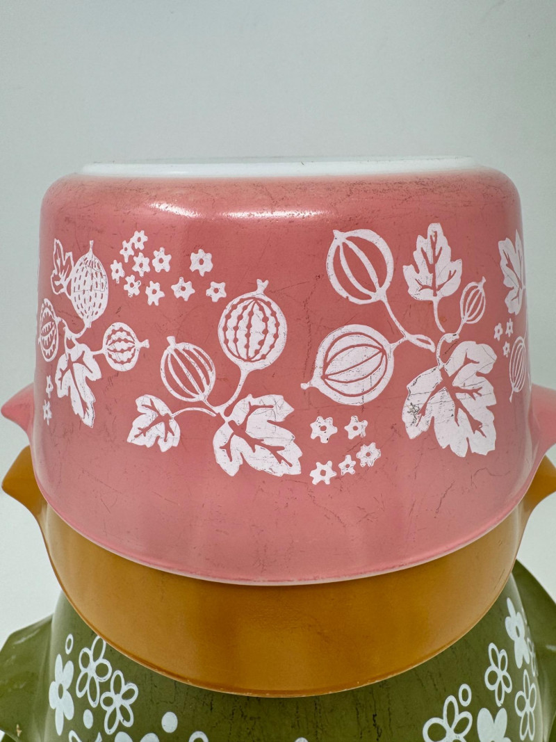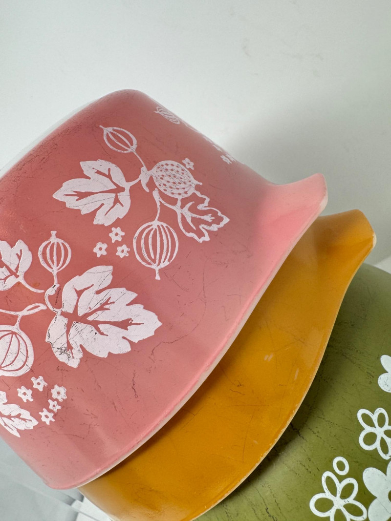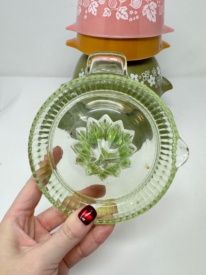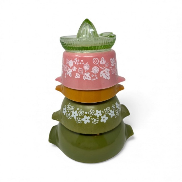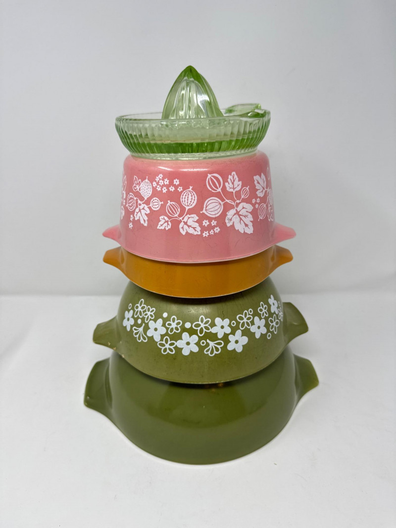 Vintage Pyrex Mixing Bowls & Green Glass Juicer – 5 Pc Lot.