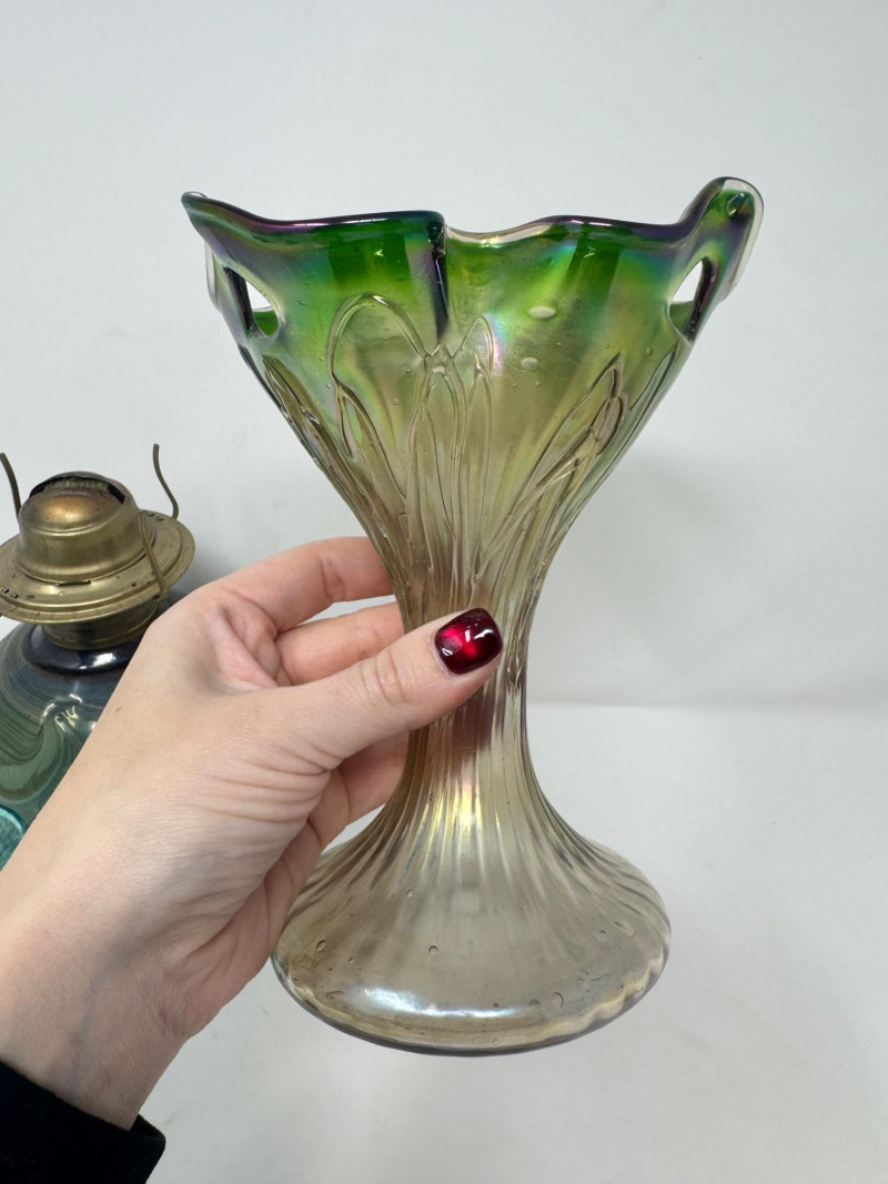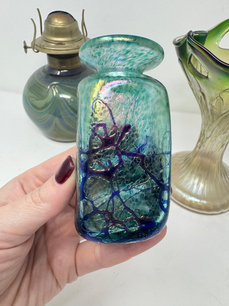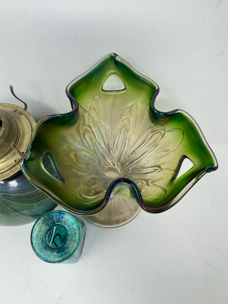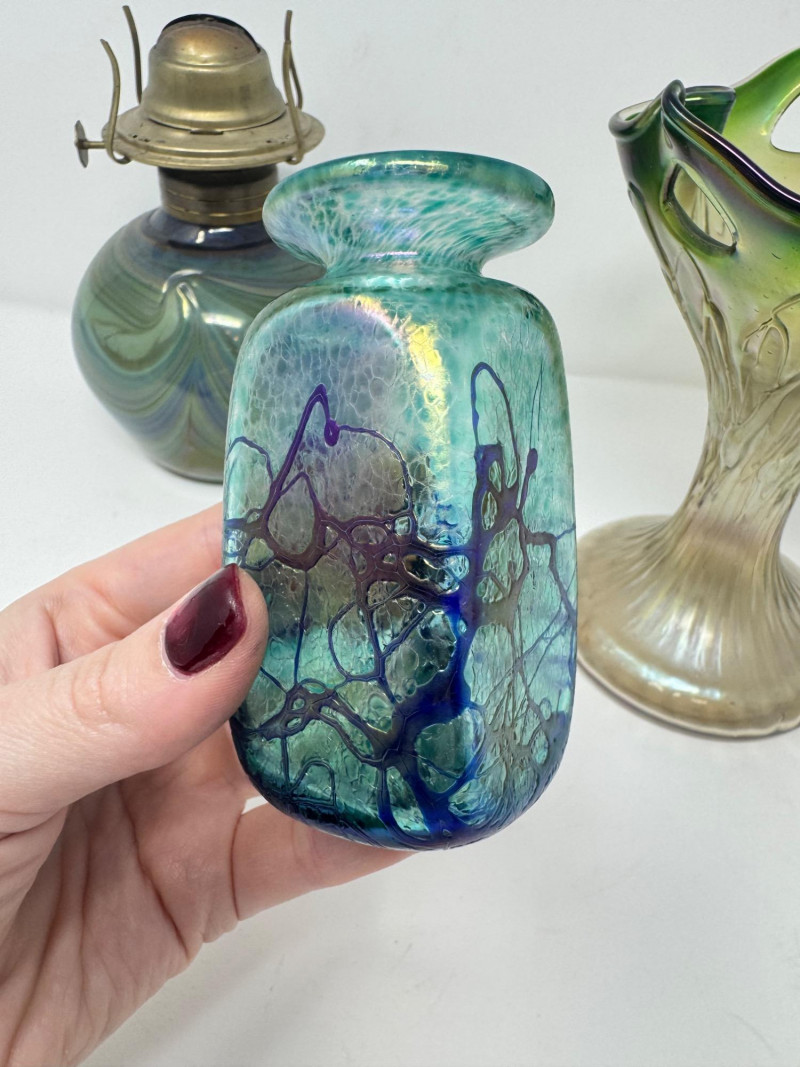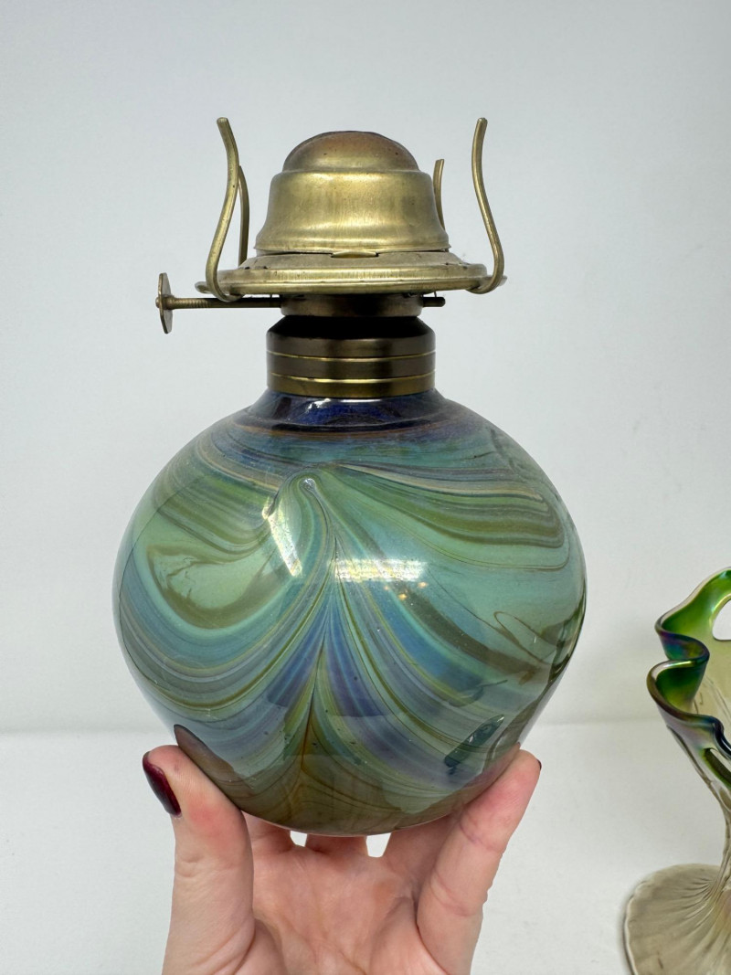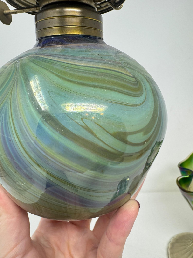 Lot # 43 - Vintage Iridescent & Blown Glass Trio – Vase, Oil Lamp, Art Glass