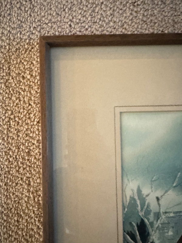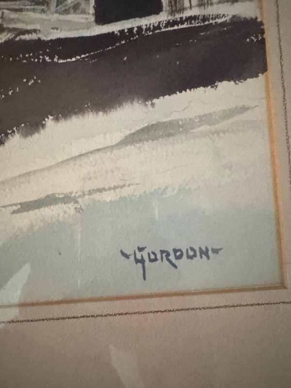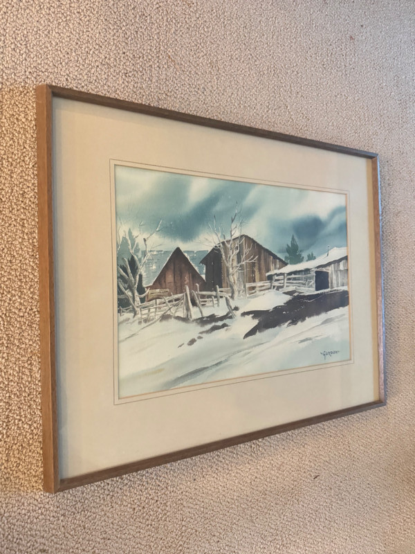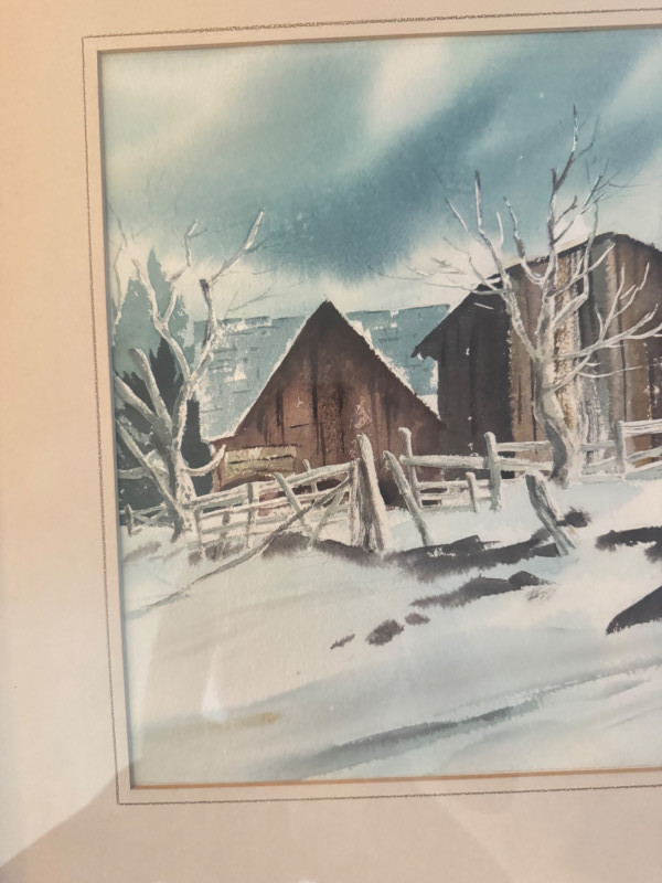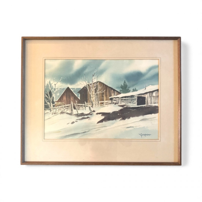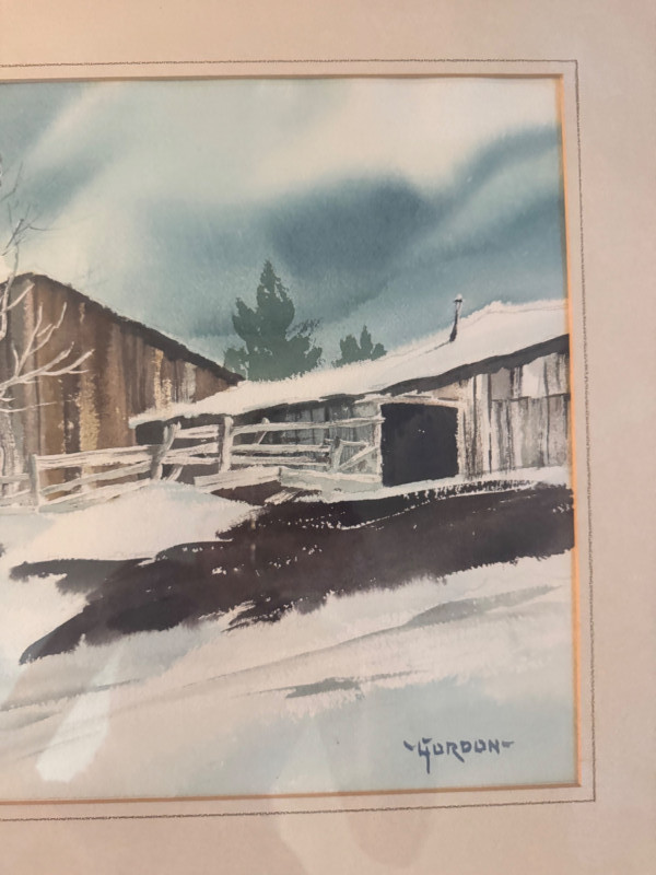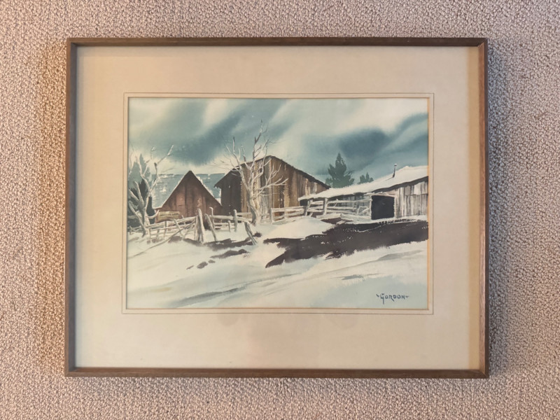 Framed Original Watercolor Winter Barn Scene Signed “Gordon”.