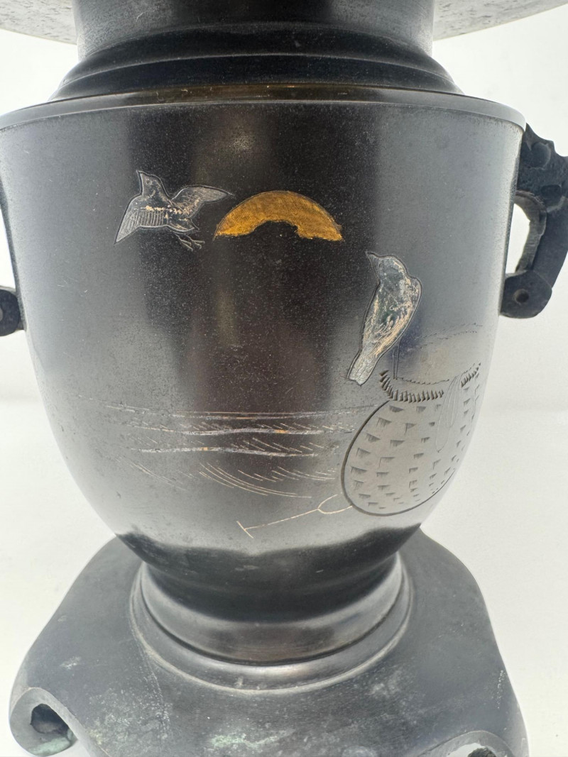 Lot # 52 - Pair of Metal Ikebana Usubata Style Vases – Bird & Sun Design