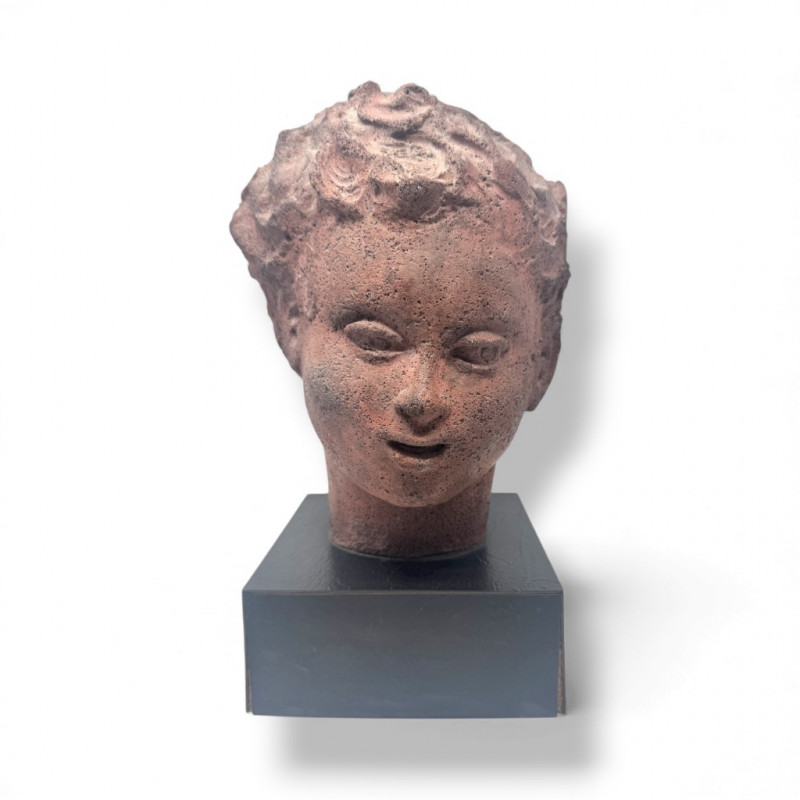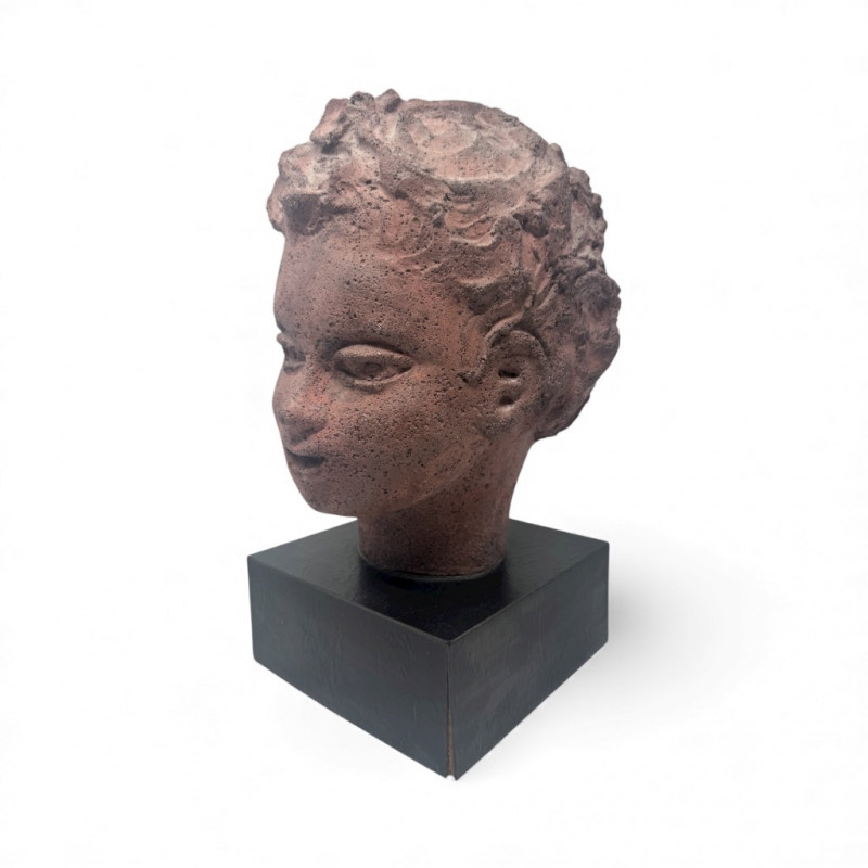 Heavy Stone Bust Sculpture of Child on Wood Base.