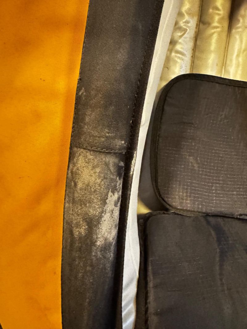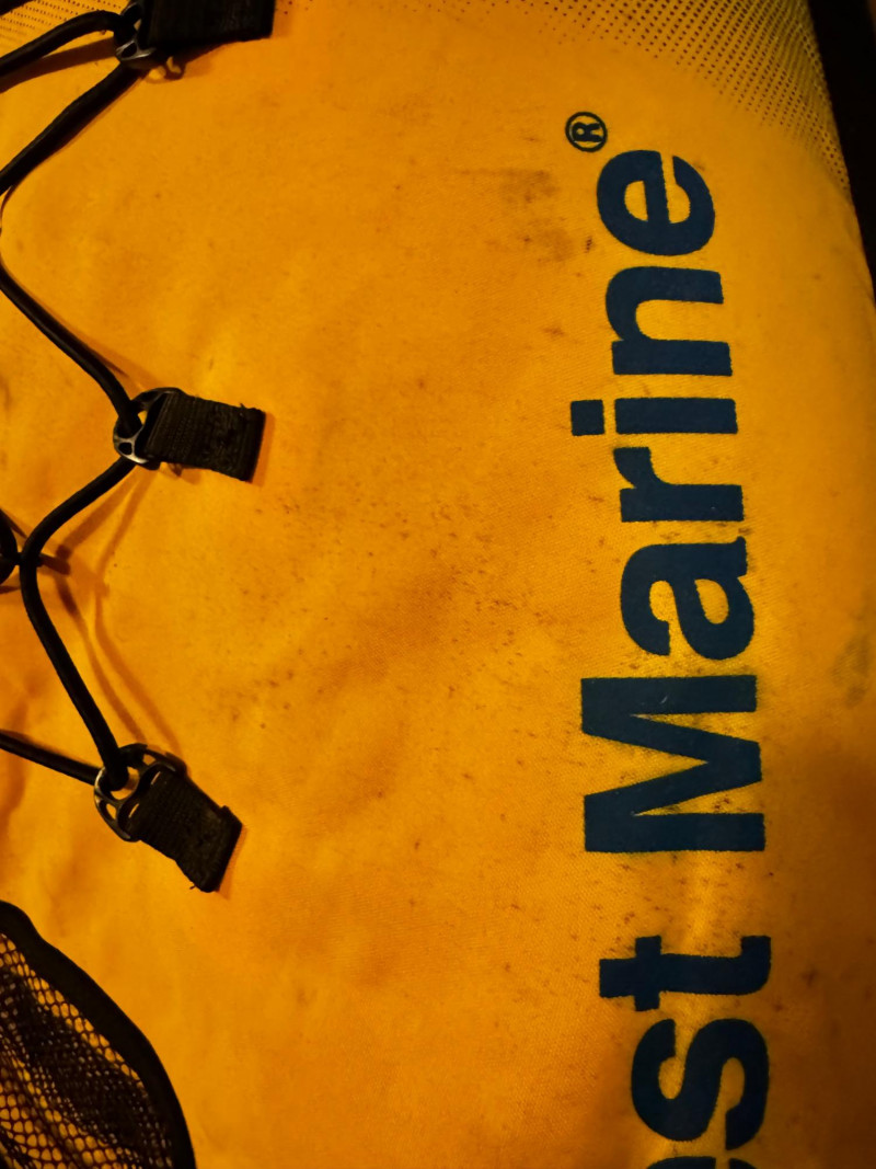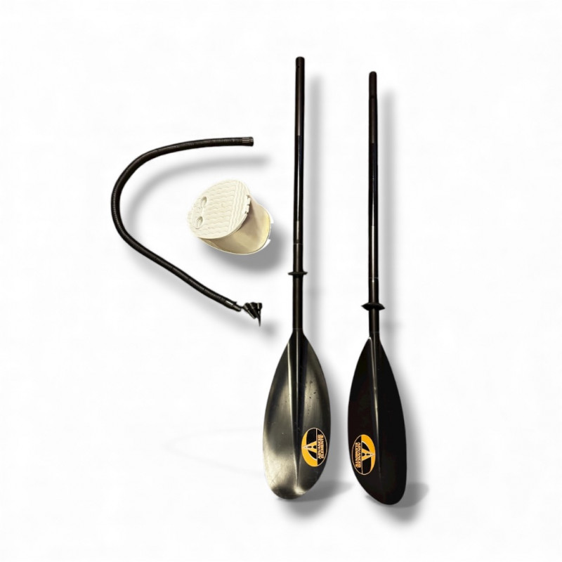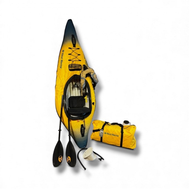 West Marine Inflatable Kayak w/ Paddle, Pump & Life Vest - Set 1. West Marine inflatable kayak, designed for one person Measures approximately 36” wide x 102” long Includes adjustable 2-piece paddle, high-back seat with storage, hand pump, and carry backpack Comes with a Cabela’s automatic inflatable life jacket Features 4 inflation chambers for stability and easy setup Shows some light wear and minor marks from use (see photos)