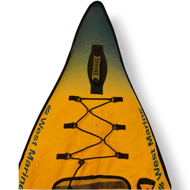 West Marine Inflatable Kayak w/ Paddle, Pump & Life Vest - Set 3. West Marine inflatable kayak, designed for one person Measures approximately 36” wide x 102” long Includes adjustable 2-piece paddle, high-back seat with storage, hand pump, and carry backpack Comes with a Cabela’s automatic inflatable life jacket