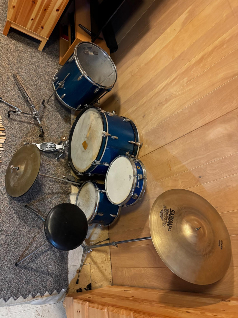 Blue Sparkle Drum Kit w/ Sabian Cymbal, Remo, Ludwig Heads + 33 Sticks. Drum kit in blue sparkle finish, showing visible use and wear. Components include: Bass drum with vintage Speed Pedal Two mounted toms (Remo Weather King Ambassador heads) Floor tom (Ludwig WeatherMaster CM-Batter head) Snare drum (brand unspecified) Sabian AA Sound Control crash/ride cymbal Hi-hat cymbals with stand Drum throne (seat) Assorted hardware and stands 33 drumsticks included Bass drum shows finish loss and scuffs (see photos for details) All pieces are functional, though cosmetically worn from use