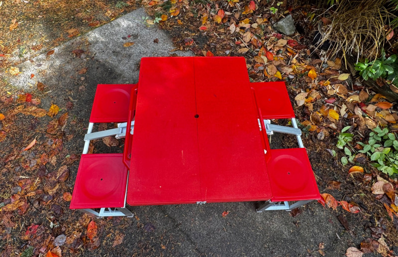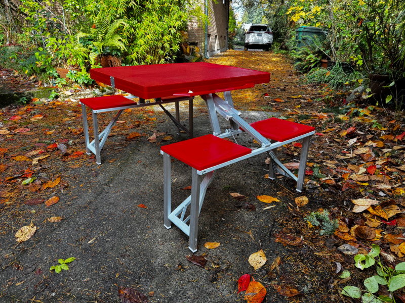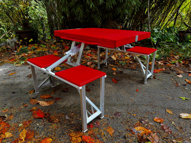 Red Foldable Picnic Table w/ 4 Seats – Children’s Size, Portable. Color: Red top and seats with aluminum frame Dimensions (open): 54” L x 34” W x 27” H Seat Dimensions: 32” L x 11” W x 17” H