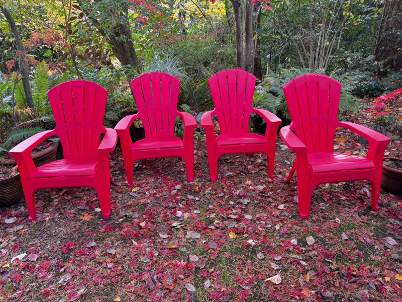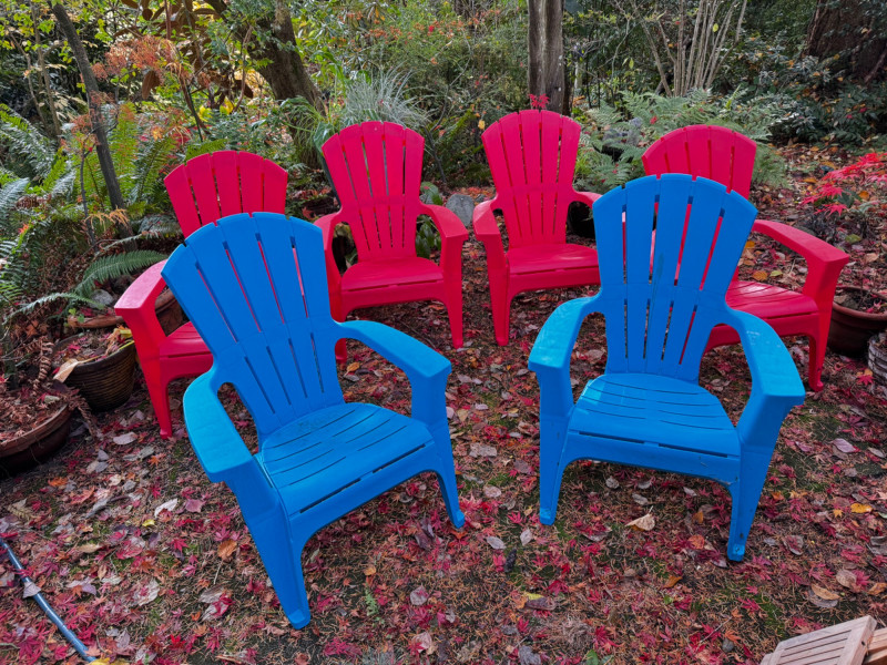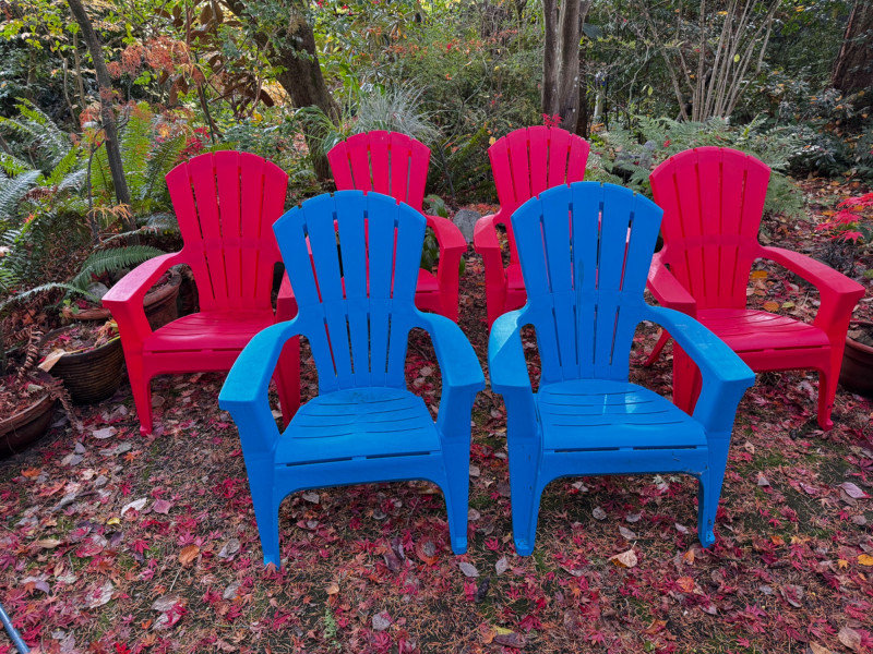 Set of 6 Outdoor Plastic Chairs – 4 Red & 2 Blue Adirondack Style.