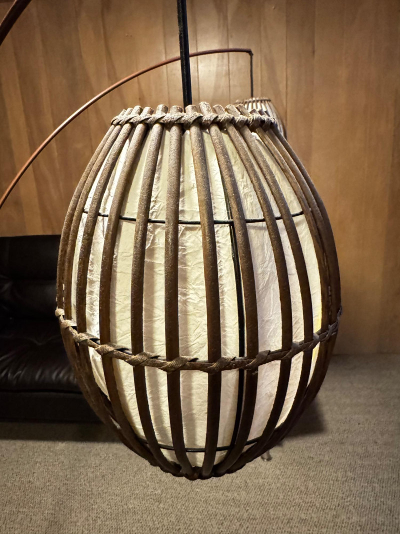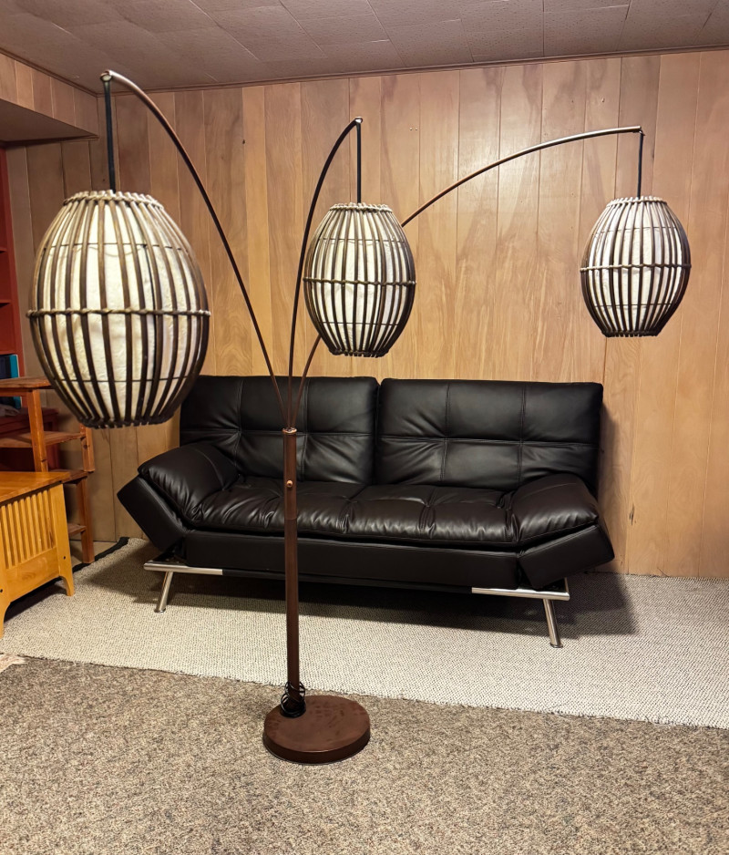 Vintage Tiki Bamboo Arc Floor Lamp – 3 Shade Copper Finish, Tested. Style: Vintage Tiki-inspired arc floor lamp with three adjustable bamboo cage shades Finish: Warm copper-tone metal frame and round base (12" diameter) Dimensions: Approx. 67" height; shades measure 8" x 9" each Features: Adjustable lamp heads that tilt and swivel in multiple directions Condition: Tested and working; slight lean from the base