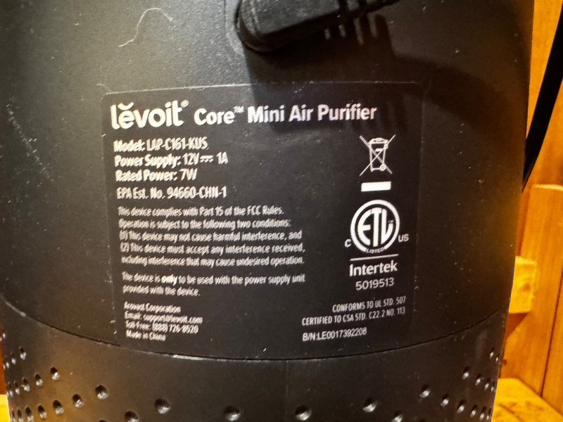 Lot of 2 Air Purifiers – TheraPure TPP540 & Levoit Core Mini Models. TheraPure TPP540 by Envion, 25” tall, 120V/55W, with UV light feature Levoit Core Mini (Model LVP-C151-KUS), compact Energy Star model, 12V/7W