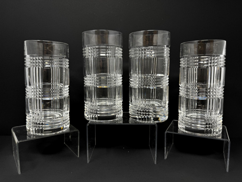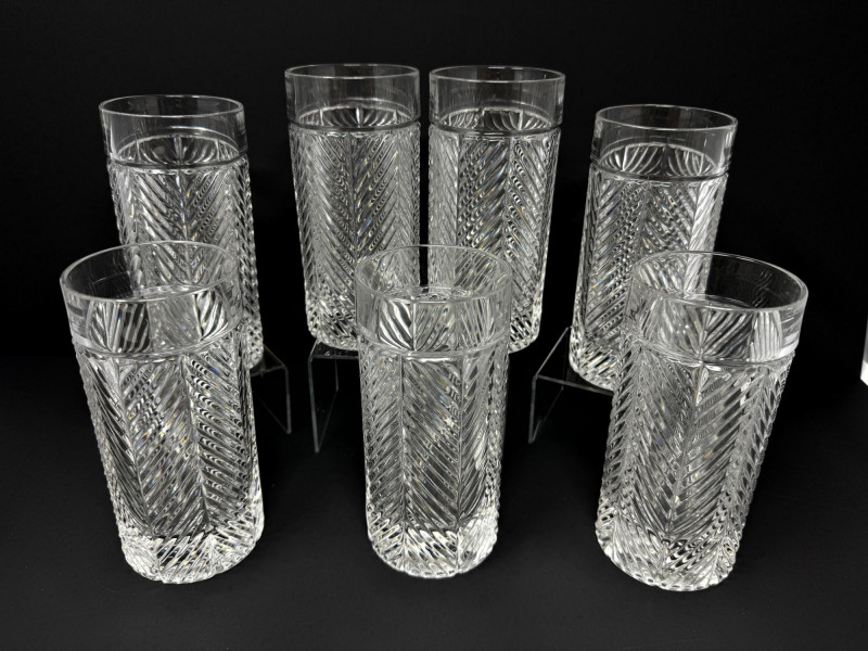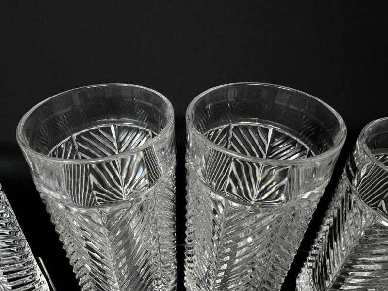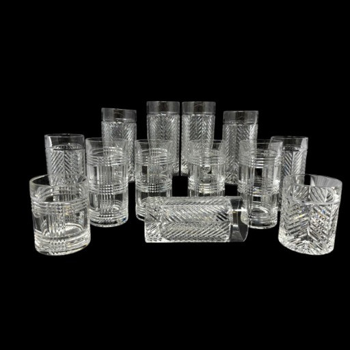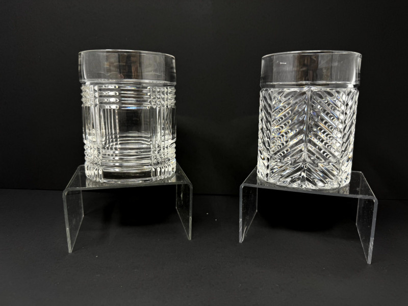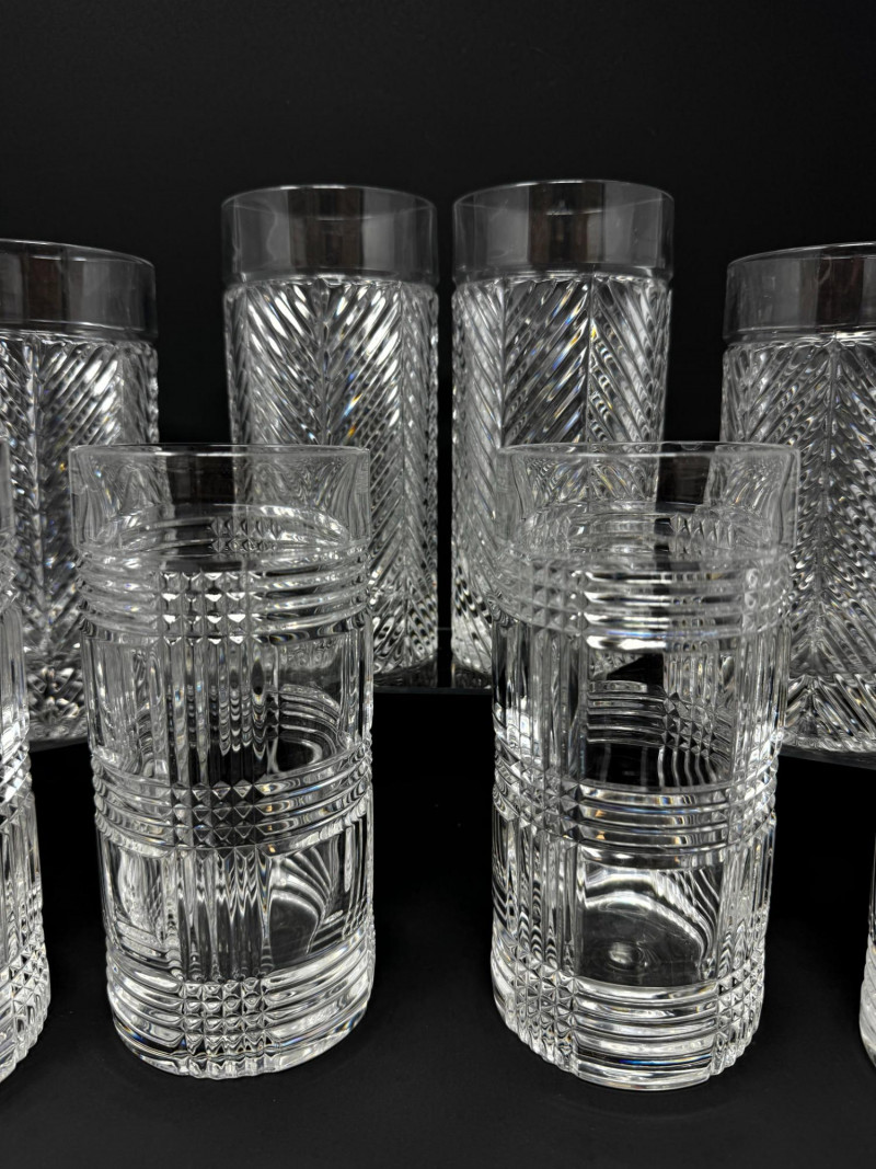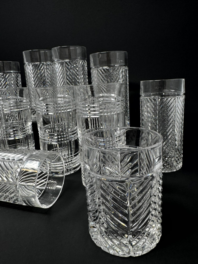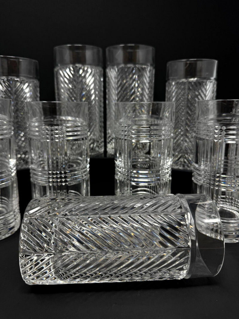 Set of 13 Crystal Glasses – Ralph Lauren Style, 2 Patterns. Total of 13 crystal glasses featuring two elegant cut designs. Includes: 7 highball glasses in Herringbone pattern – similar to Ralph Lauren Herringbone Highball Glasses 4 highball glasses in Glen Plaid pattern – similar to Ralph Lauren Glen Plaid Fine Crystal Highball Glasses 1 short tumbler in Herringbone pattern – similar to Ralph Lauren Herringbone Double Old Fashioned Tumbler Each tall glass approx. 6” tall, short glasses approx. 4” tall. Unmarked, but match Ralph Lauren crystal design and quality