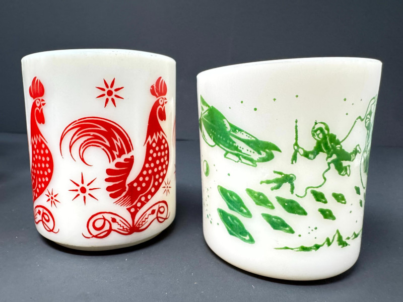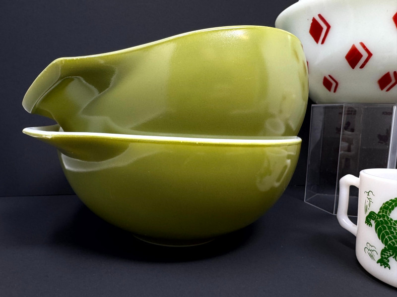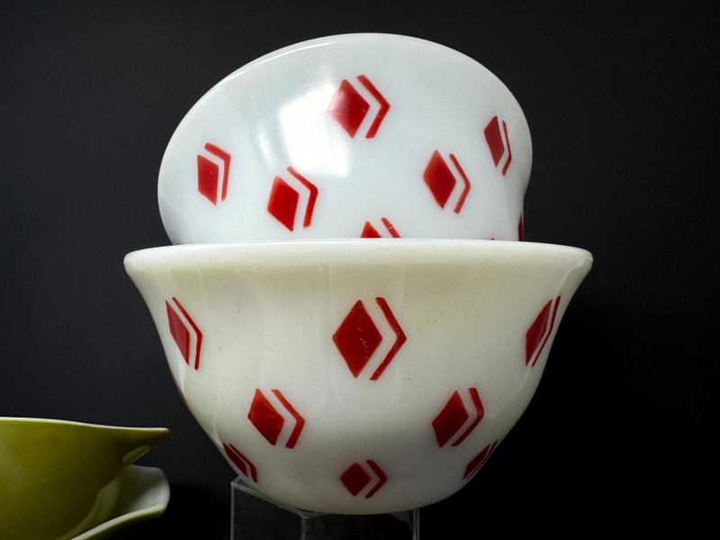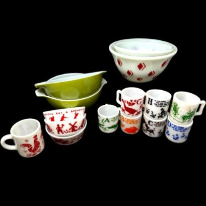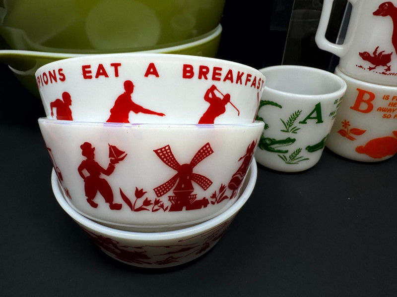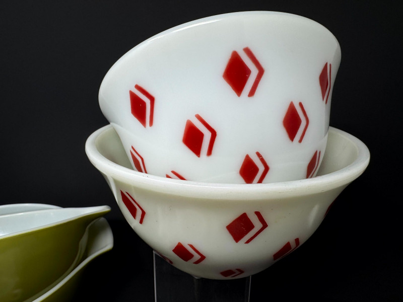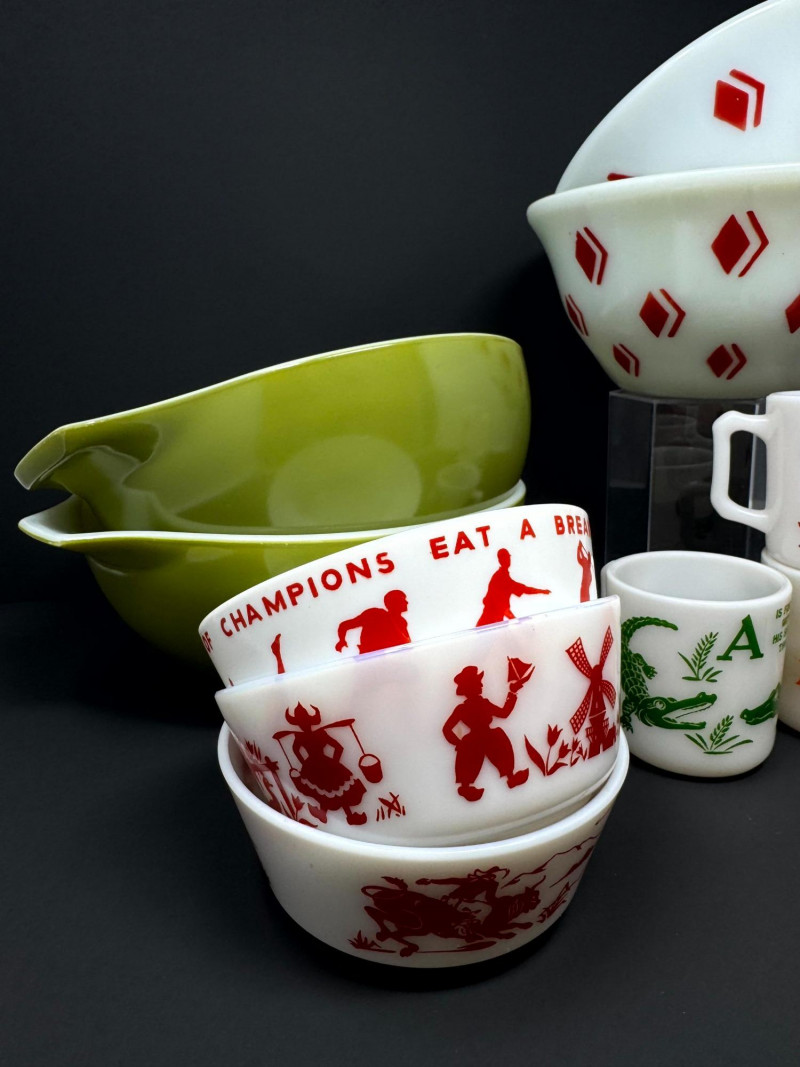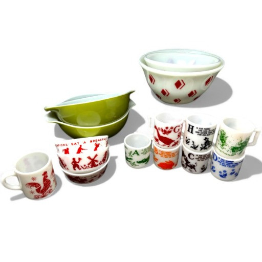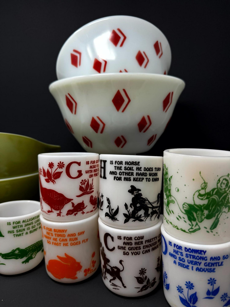 Vintage Pyrex & Hazel Atlas Milk Glass Lot – Bowls & Mugs. Assorted vintage milk glass and Pyrex pieces featuring bold retro patterns Includes: (2) Pyrex green nesting mixing bowls (approx. 11” x 9” x 4”) (2) McKee Red Diamond Check mixing bowls (approx. 4” tall) (3) Hazel Atlas-style Wheaties cereal bowls with red graphic motifs (approx. 5” x 2”) (8) Hazel Atlas-style alphabet child’s mugs, multicolor with animal illustrations (approx. 4” x 3”)