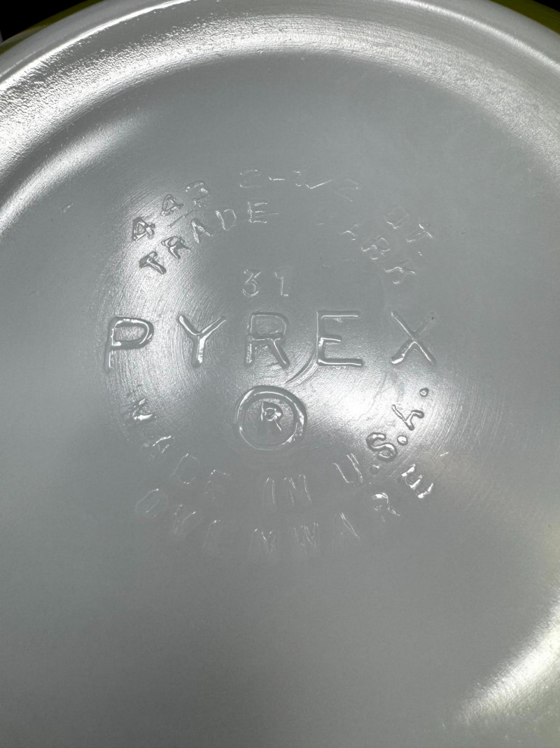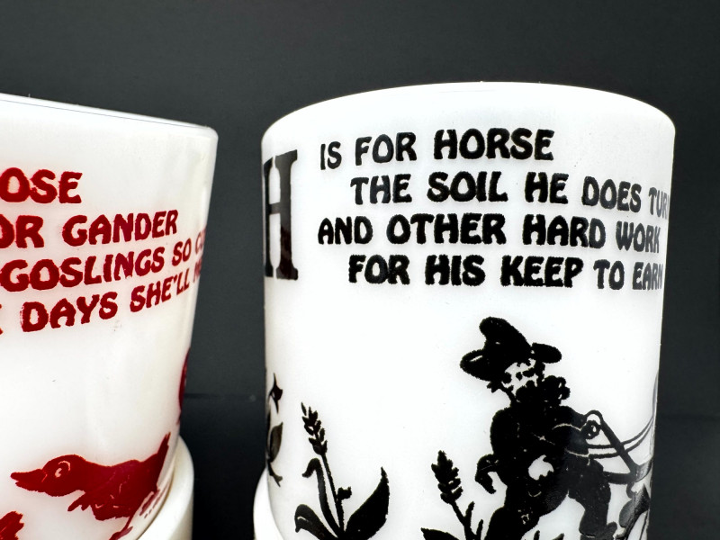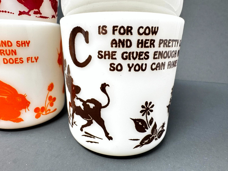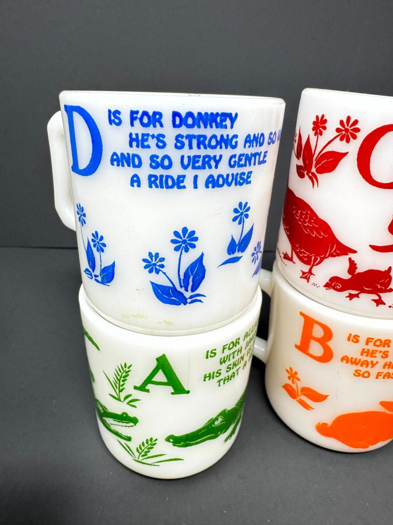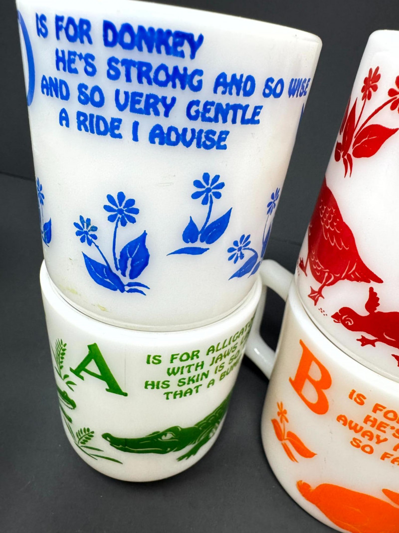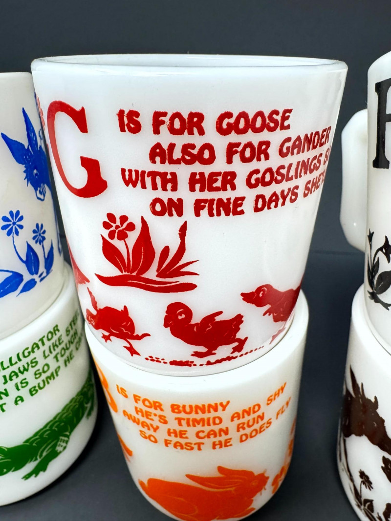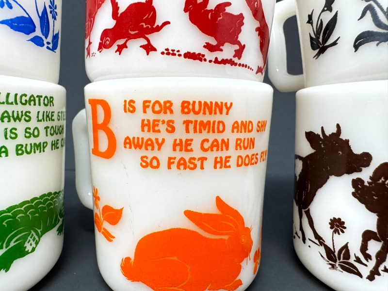 Vintage Pyrex & Hazel Atlas Milk Glass Lot – Bowls & Mugs. Assorted vintage milk glass and Pyrex pieces featuring bold retro patterns Includes: (2) Pyrex green nesting mixing bowls (approx. 11” x 9” x 4”) (2) McKee Red Diamond Check mixing bowls (approx. 4” tall) (3) Hazel Atlas-style Wheaties cereal bowls with red graphic motifs (approx. 5” x 2”) (8) Hazel Atlas-style alphabet child’s mugs, multicolor with animal illustrations (approx. 4” x 3”)
