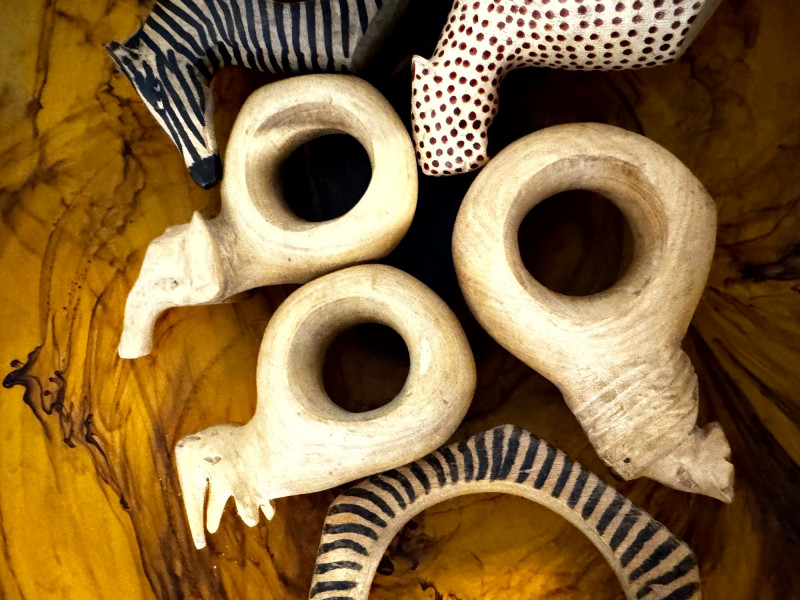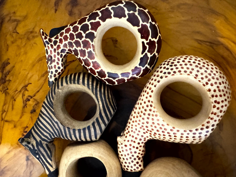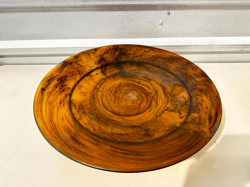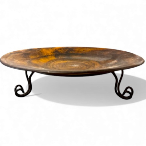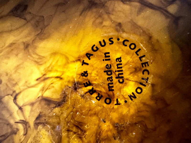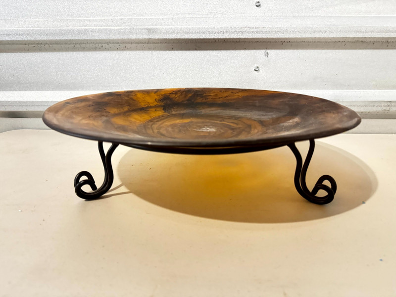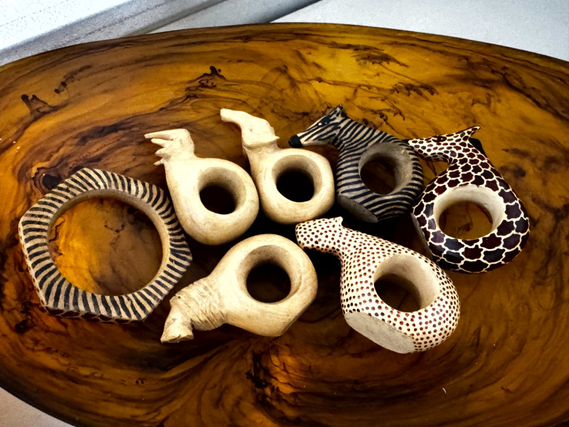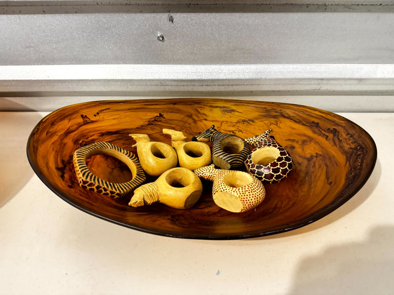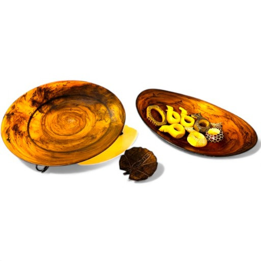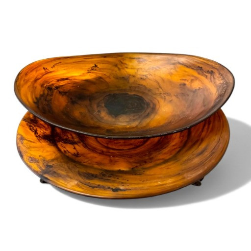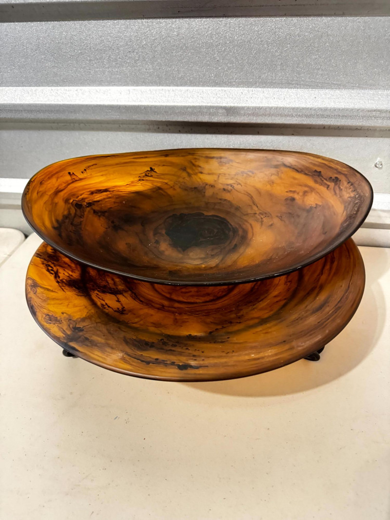 Torré & Tagus Amber Plastic Serving Bowls, Carved Wood Leaf Dish + Pair of Torré & Tagus Collection amber-toned plastic serving bowls Round bowl: 16” diameter, metal feet Oval bowl: 17½” x 11”, marbled amber resin finish Includes one carved leaf-form wooden dish, natural brown tone Light wear; marked “Torré & Tagus Collection, Made in China” on base. Set also includes seven assorted napkin holders in coordinated tones.