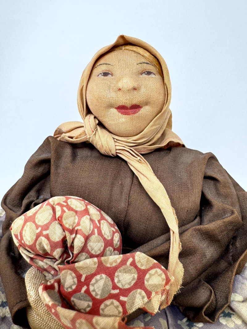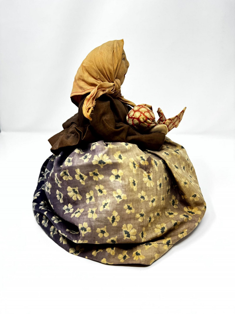 Vintage Cloth Folk Doll Teapot Cover– Seated Woman Holding Fabric Bundle.