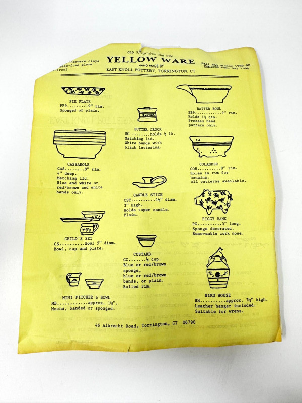 East Knoll Pottery Yellow Ware Set – Bowls, Pitchers & Mugs. Handmade yellow ware pottery by East Knoll Pottery, Torrington, Connecticut Includes: 2 pitchers (approx. 6½”–7” tall; one has visible handle cracks, see images) 1 large bowl 7½” diameter x 4¼” height Medium bowls (6” x 3”, set of 1) Small bowls (4½” x 2½”, set of 6) Large mugs (3½” height, set of 1) Small mug (2½” height, set of 1) Period catalog sheet included (for reference only)