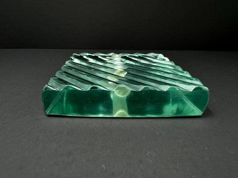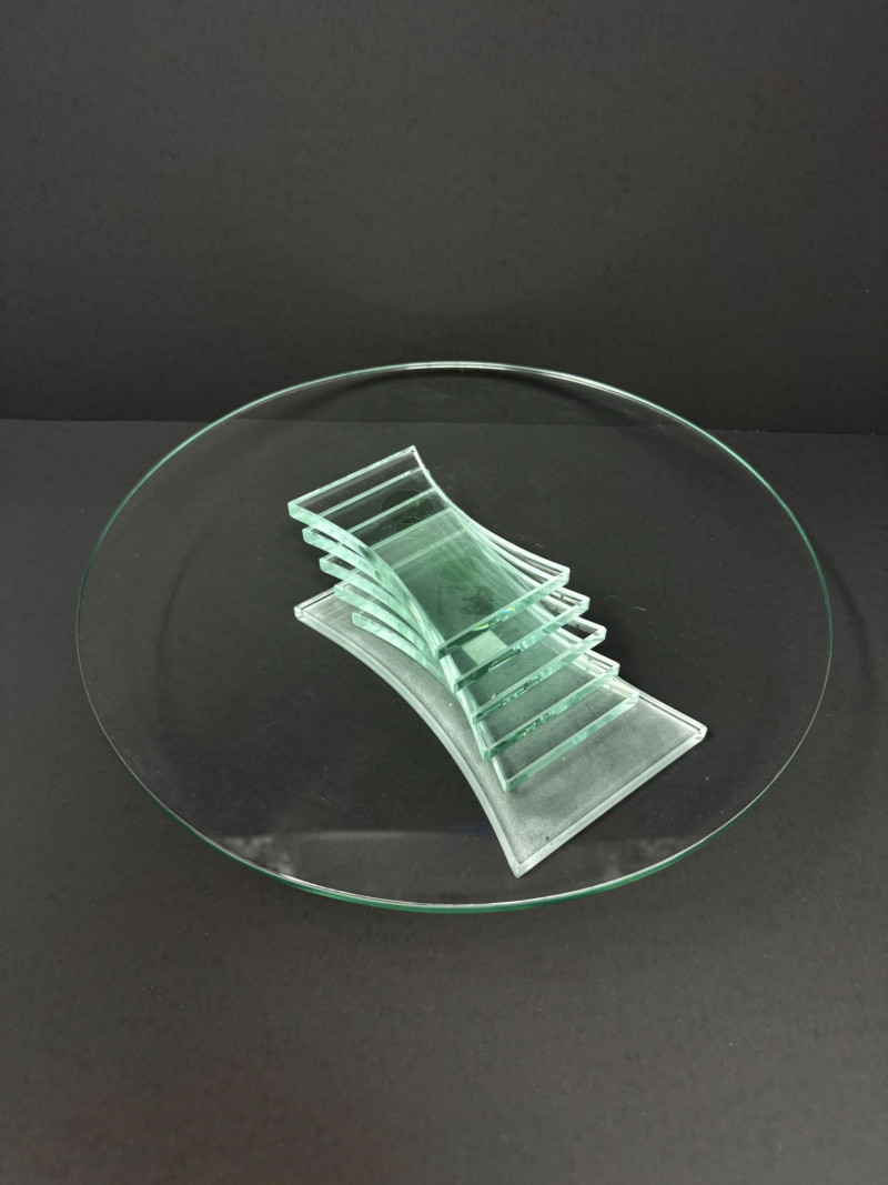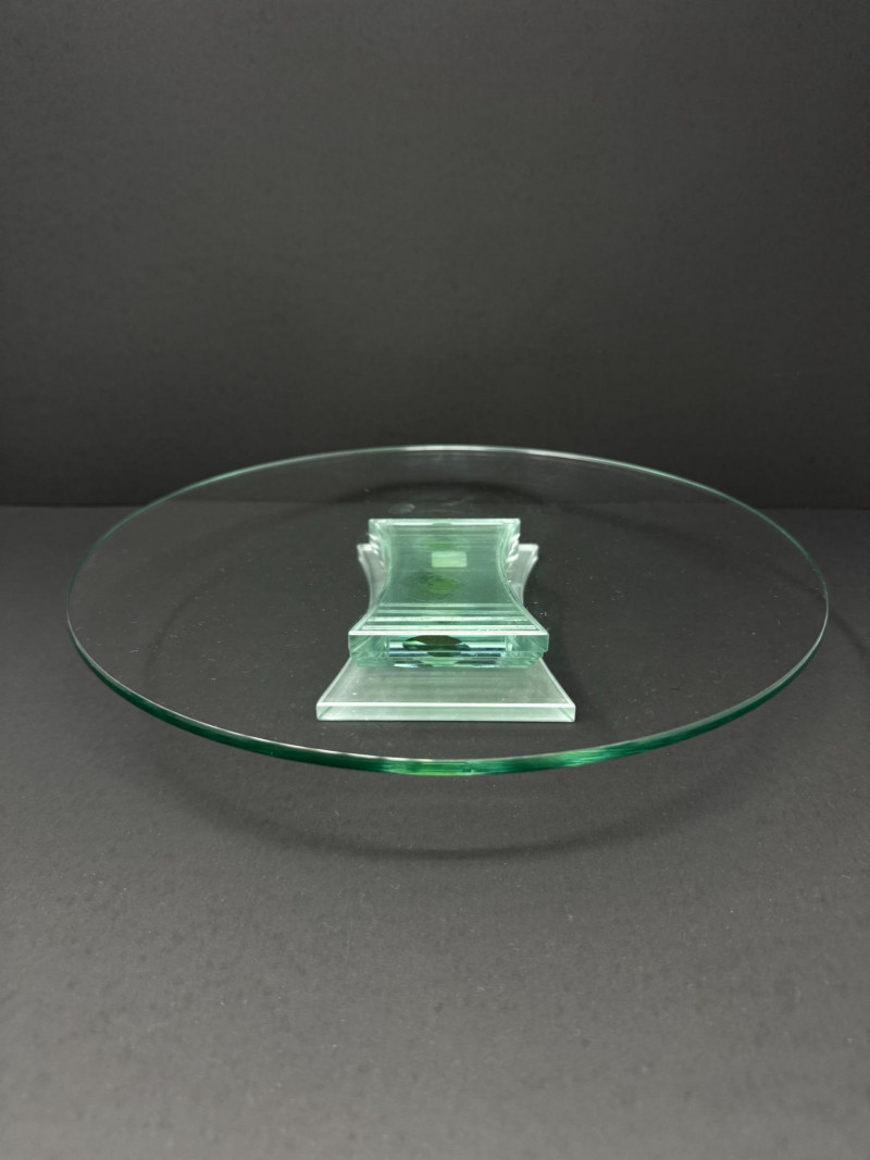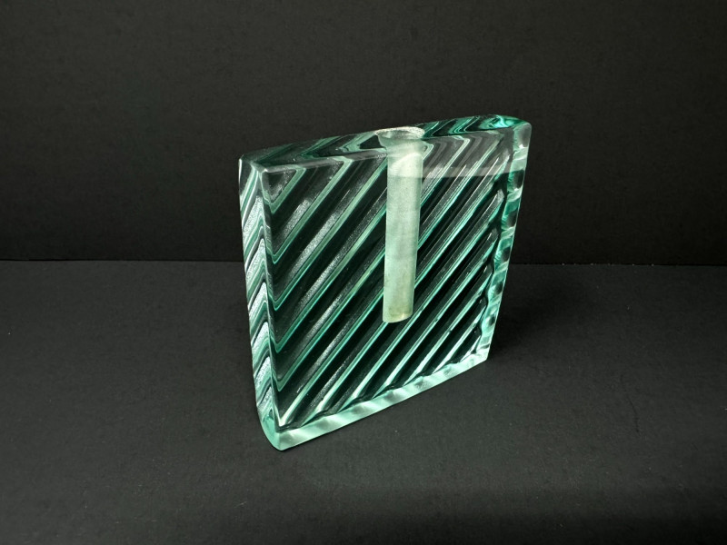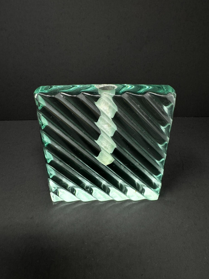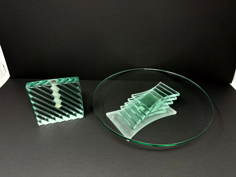 Green Art Glass Serving Plate & Ribbed Candle Holder Display Set. Contemporary green glass display pieces, matching ribbed style similar to Partylite designs. Includes: Round glass serving plate on stacked geometric base — approx. 11” diameter x 5” height Square glass candle holder, ribbed texture — approx. 4¼” x 1” x 4¼”
