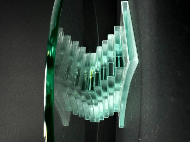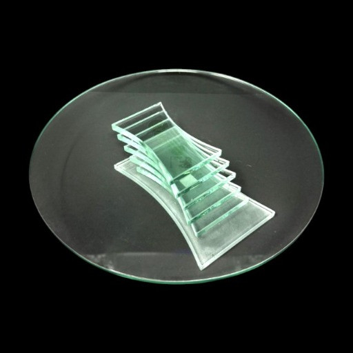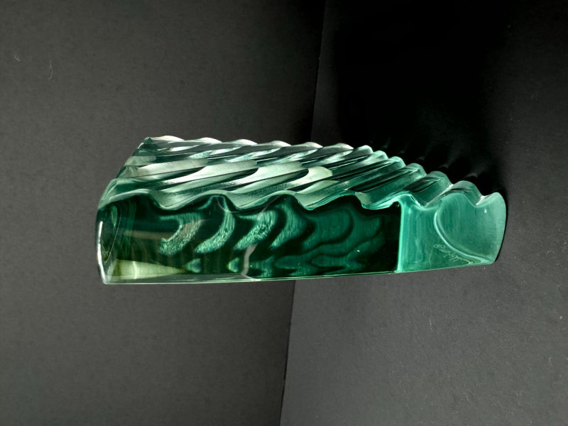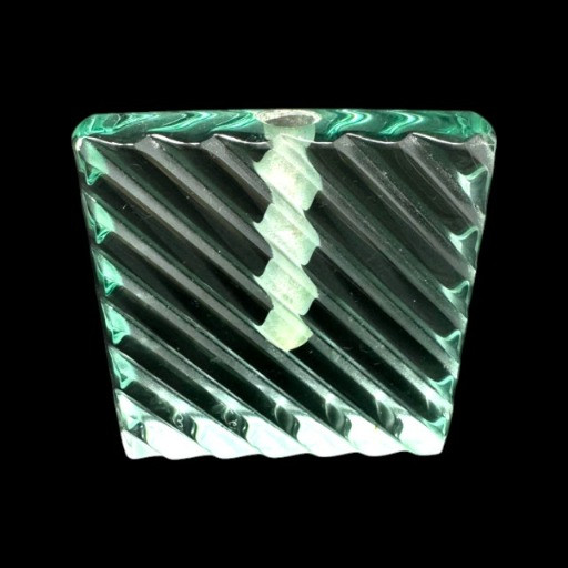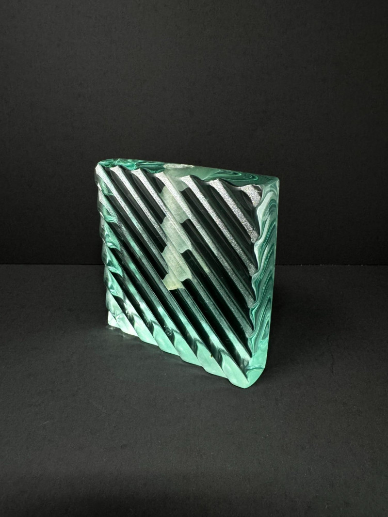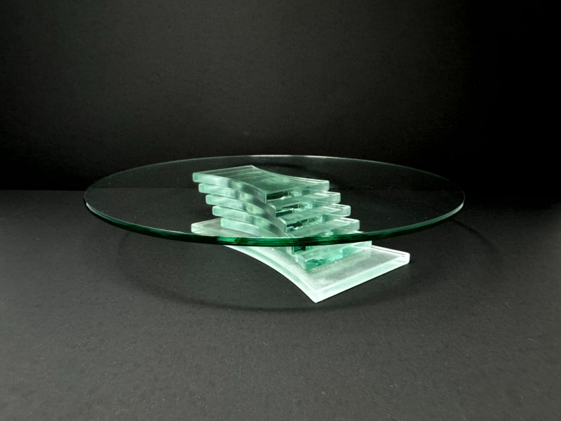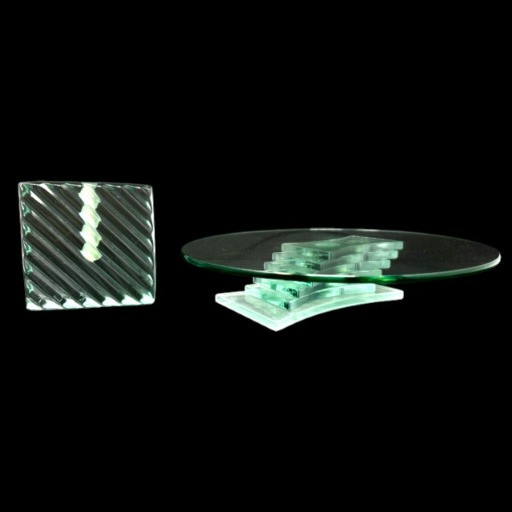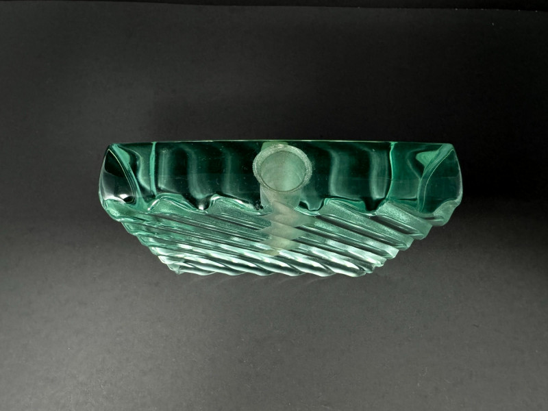 Green Art Glass Serving Plate & Ribbed Candle Holder Display Set. Contemporary green glass display pieces, matching ribbed style similar to Partylite designs. Includes: Round glass serving plate on stacked geometric base — approx. 11” diameter x 5” height Square glass candle holder, ribbed texture — approx. 4¼” x 1” x 4¼”