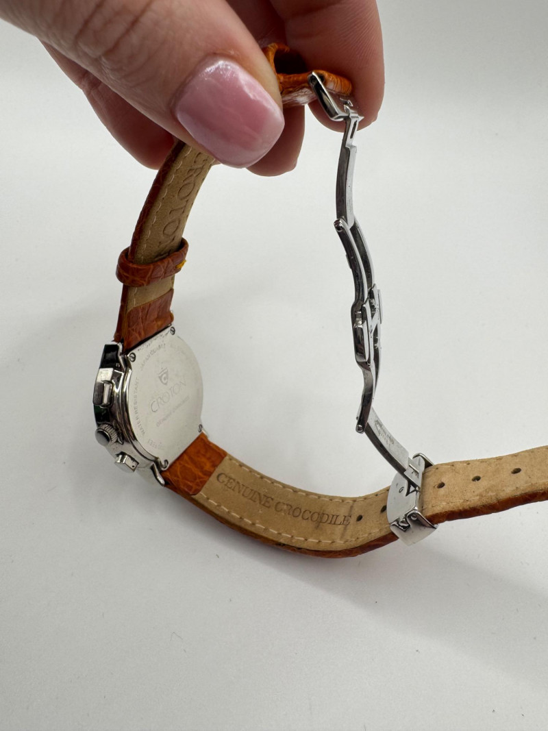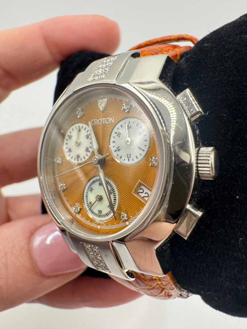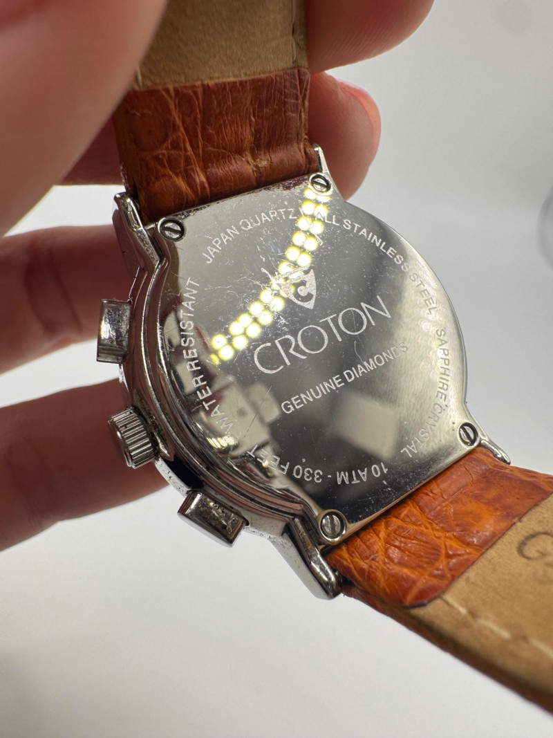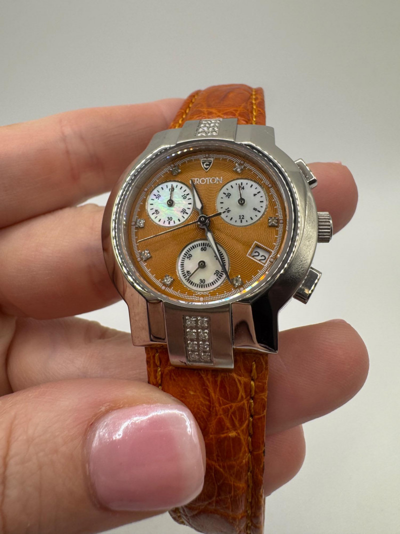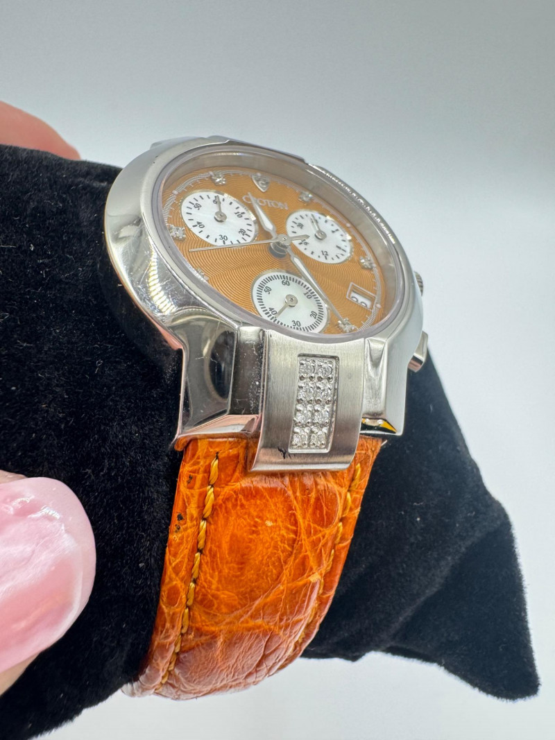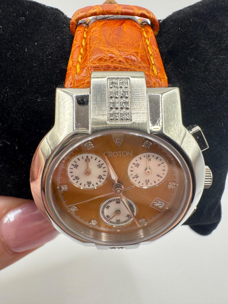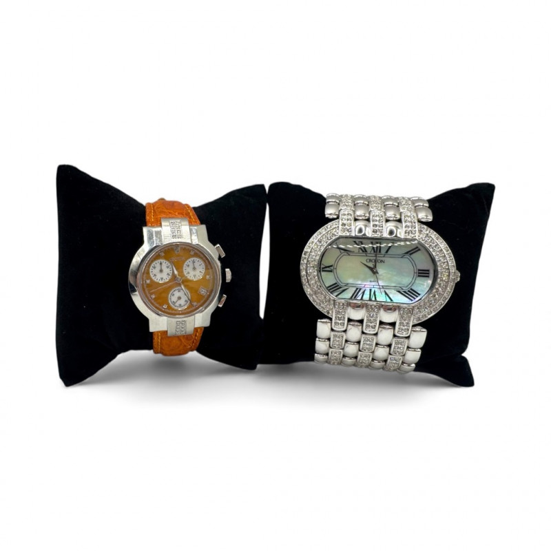 2 Croton Women's Watches – Diamond & Rhodium Plated, MOP Dials. Orange Croton watch: Marked Genuine Diamonds (stones tested positive for diamonds) Stainless steel case, sapphire crystal, Japan quartz movement Orange leather strap with visible wear Silver-tone Croton watch: Rhodium-plated finish with large oval face and Roman numerals Mother-of-pearl dial with pave-style crystal accents (not diamonds) Bracelet-style band, excellent condition Both have mother of pearl watch faces with iridescent sheen . Both watches are untested for time accuracy. General Disclaimer:
