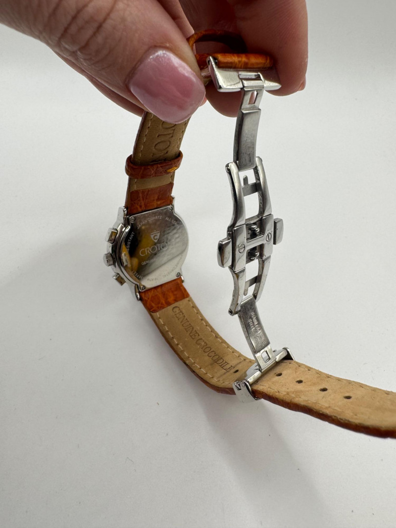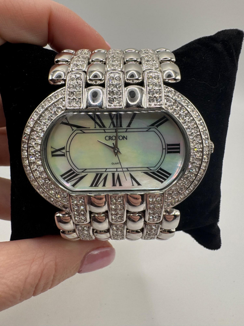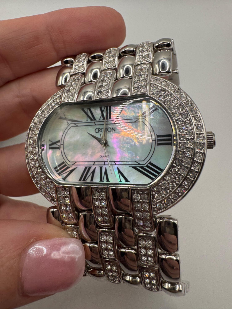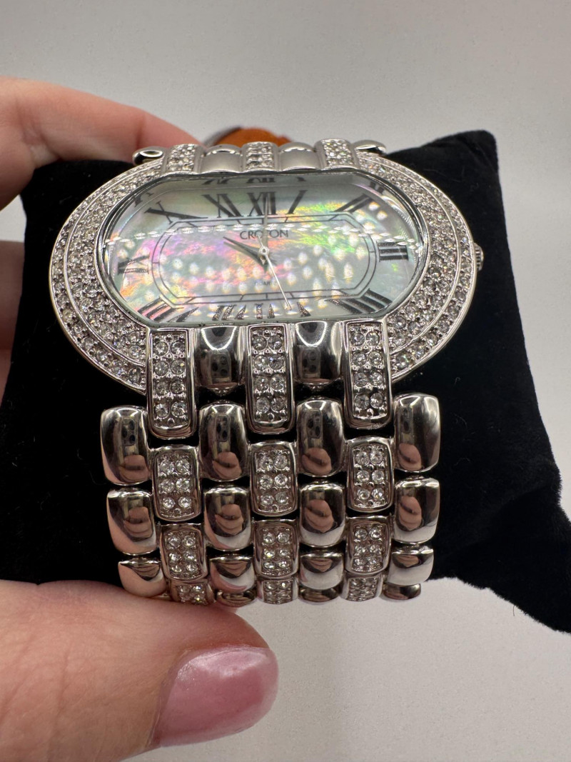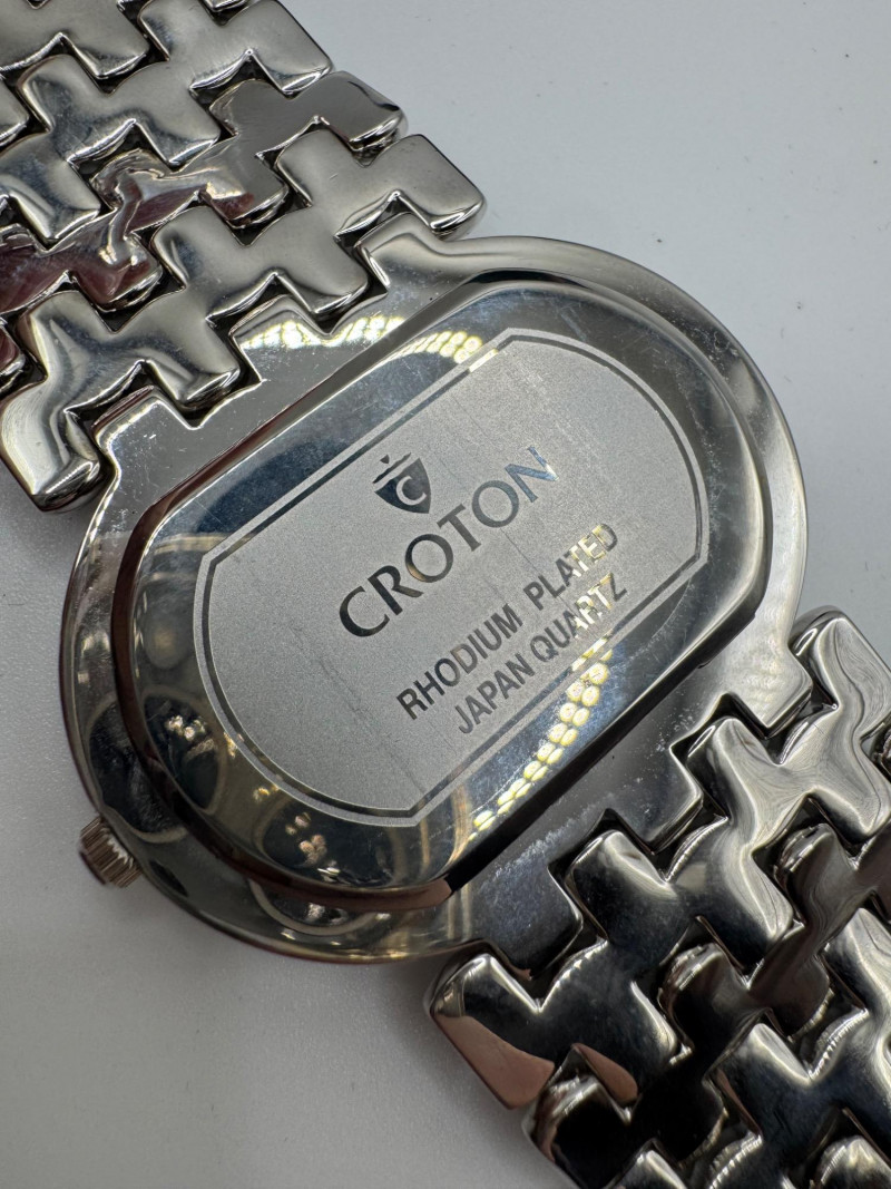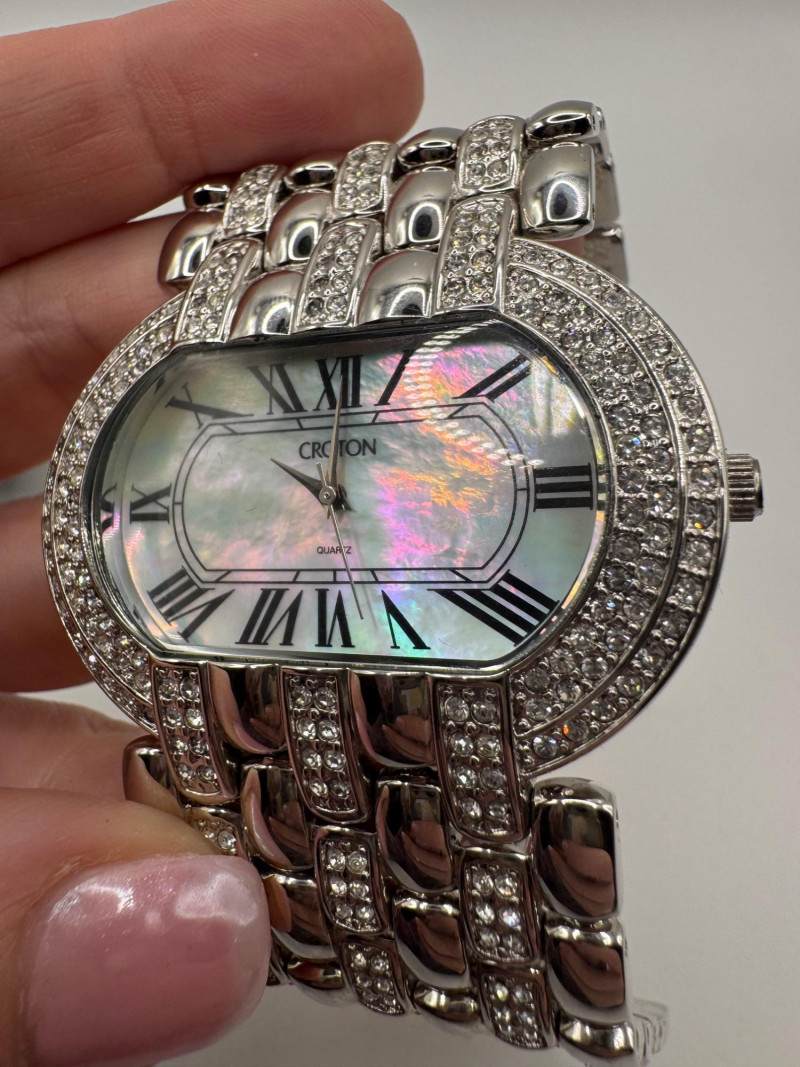 2 Croton Women's Watches – Diamond & Rhodium Plated, MOP Dials. Orange Croton watch: Marked Genuine Diamonds (stones tested positive for diamonds) Stainless steel case, sapphire crystal, Japan quartz movement Orange leather strap with visible wear Silver-tone Croton watch: Rhodium-plated finish with large oval face and Roman numerals Mother-of-pearl dial with pave-style crystal accents (not diamonds) Bracelet-style band, excellent condition Both have mother of pearl watch faces with iridescent sheen . Both watches are untested for time accuracy. General Disclaimer: