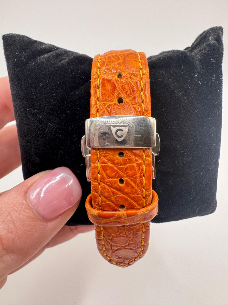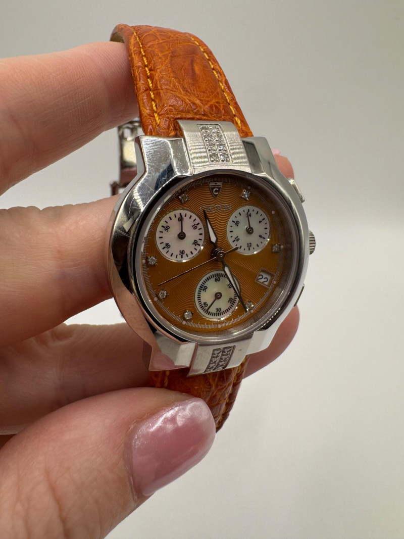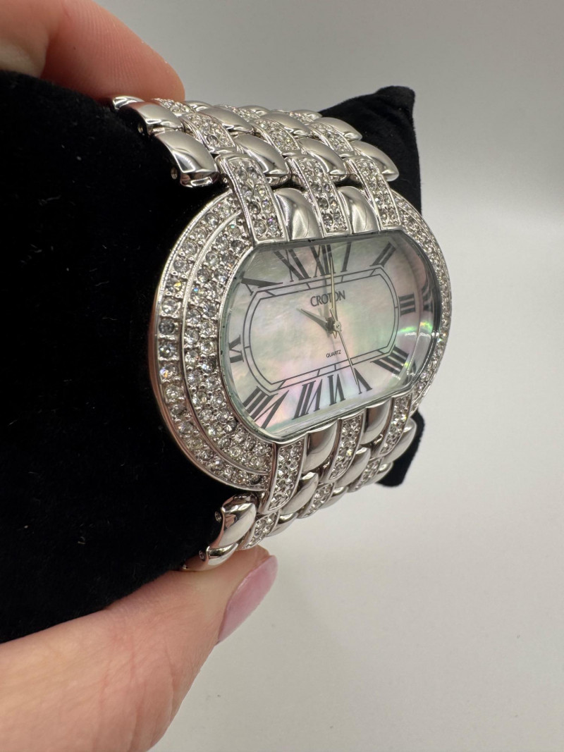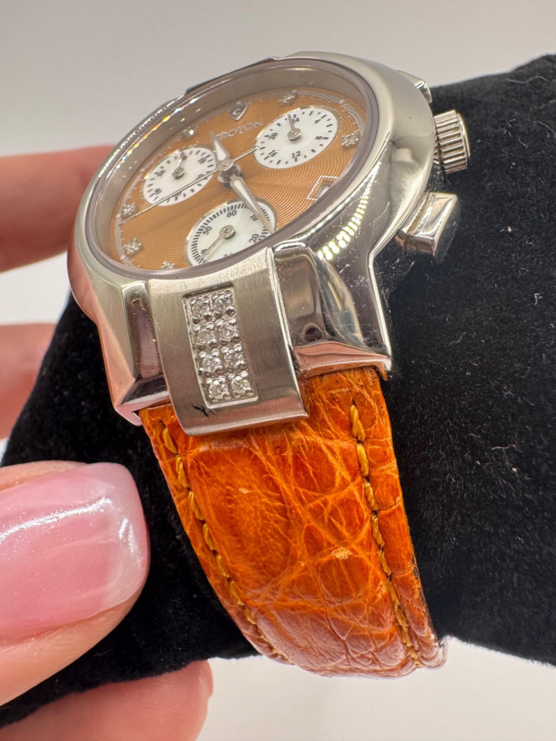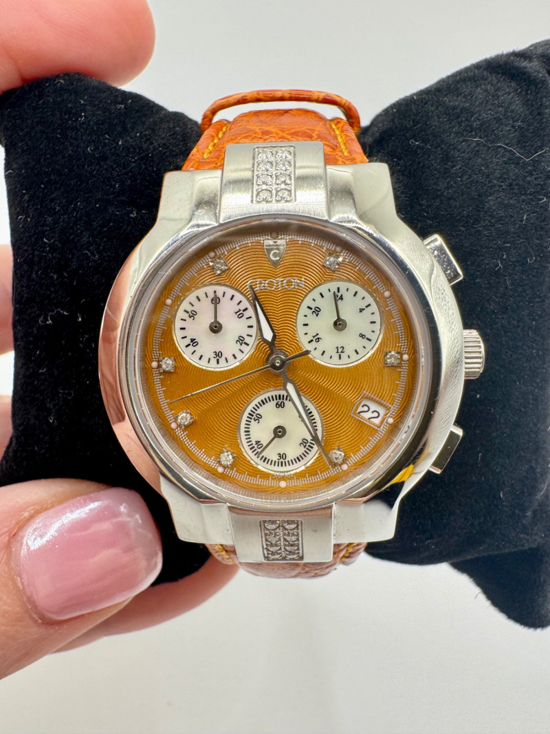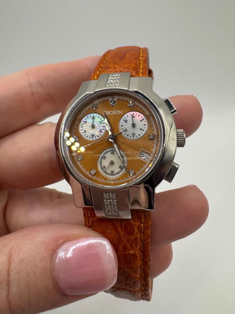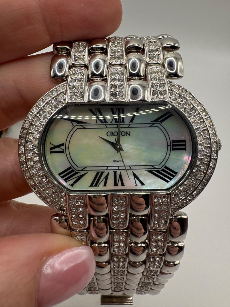 2 Croton Women's Watches – Diamond & Rhodium Plated, MOP Dials. Orange Croton watch: Marked Genuine Diamonds (stones tested positive for diamonds) Stainless steel case, sapphire crystal, Japan quartz movement Orange leather strap with visible wear Silver-tone Croton watch: Rhodium-plated finish with large oval face and Roman numerals Mother-of-pearl dial with pave-style crystal accents (not diamonds) Bracelet-style band, excellent condition Both have mother of pearl watch faces with iridescent sheen . Both watches are untested for time accuracy. General Disclaimer: