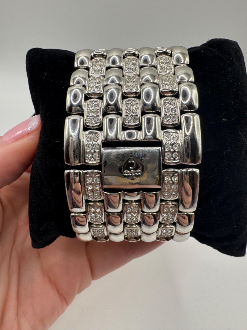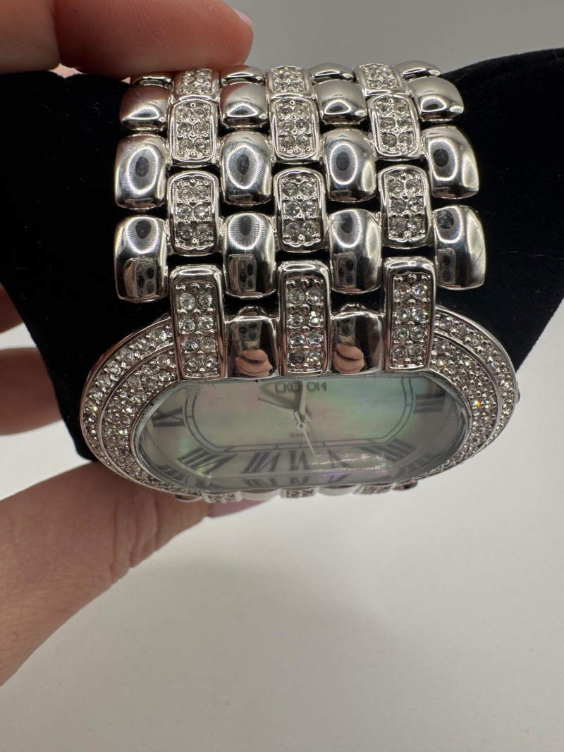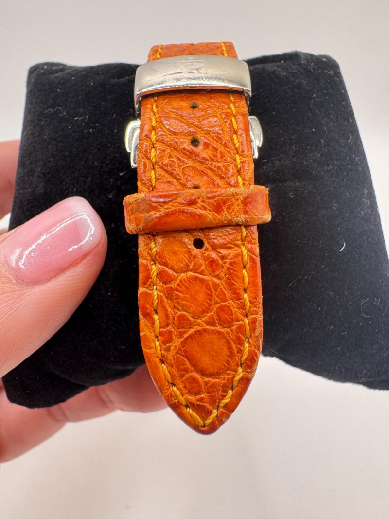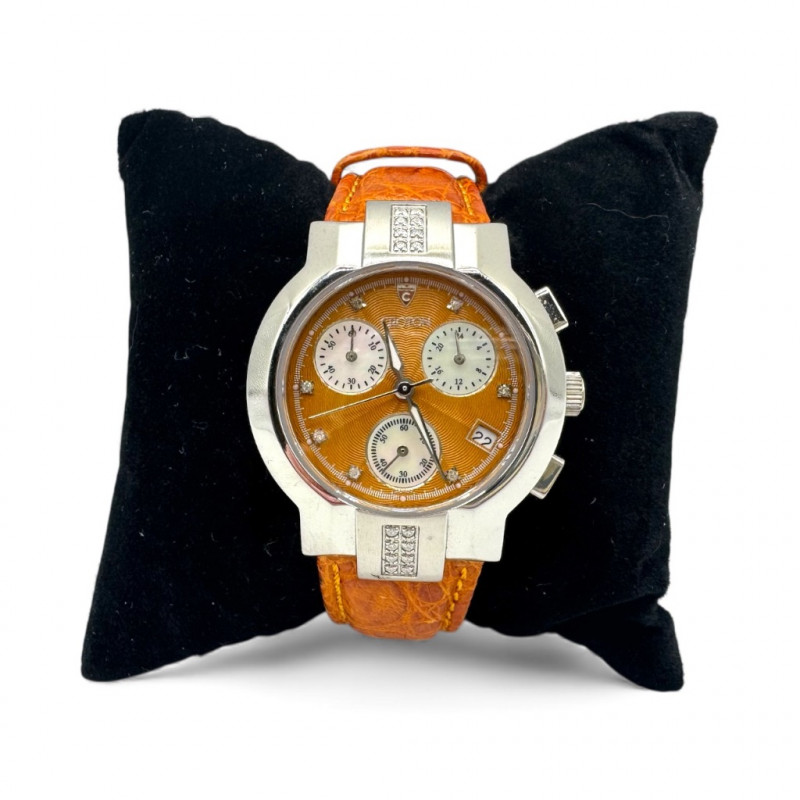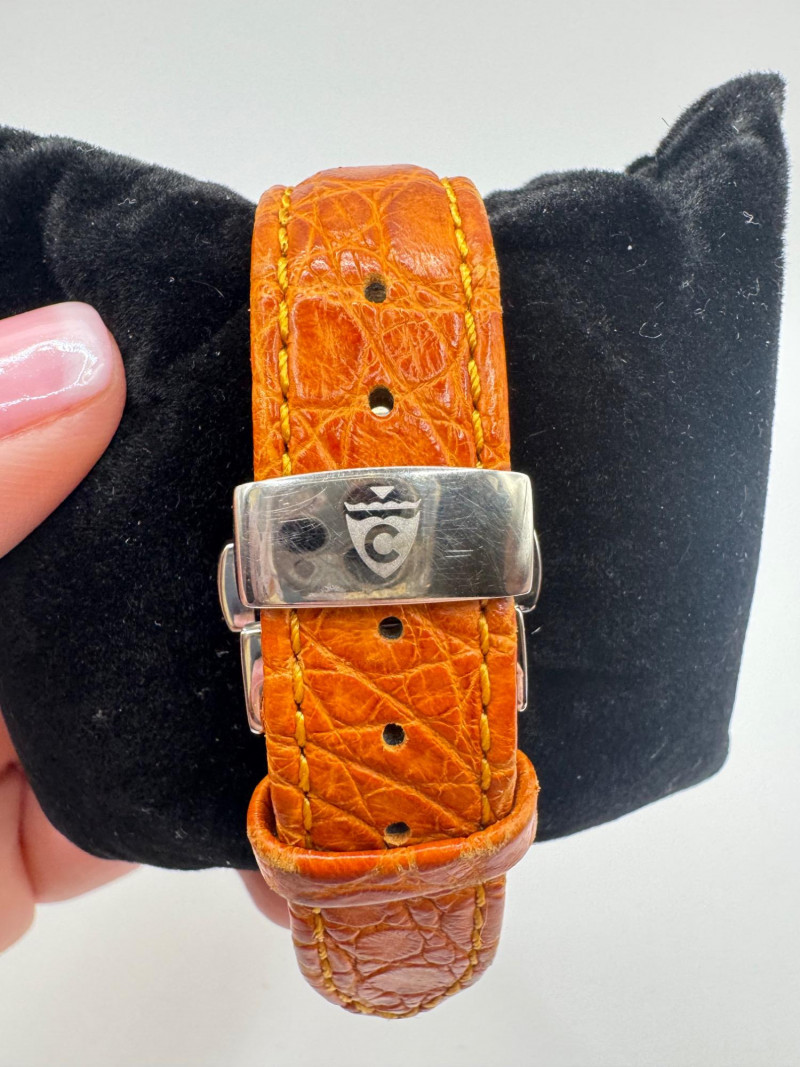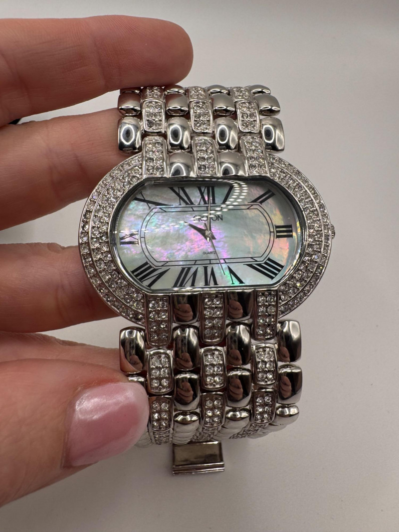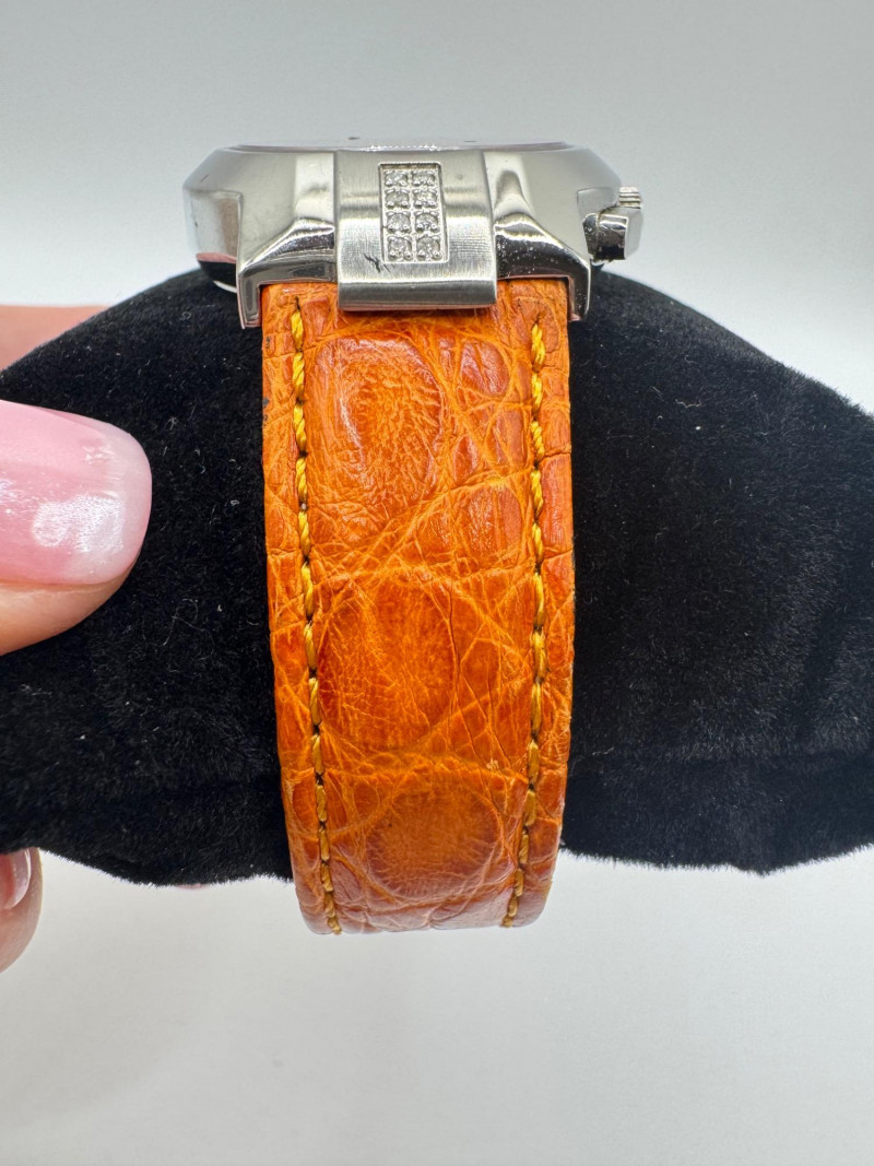 2 Croton Women's Watches – Diamond & Rhodium Plated, MOP Dials. Orange Croton watch: Marked Genuine Diamonds (stones tested positive for diamonds) Stainless steel case, sapphire crystal, Japan quartz movement Orange leather strap with visible wear Silver-tone Croton watch: Rhodium-plated finish with large oval face and Roman numerals Mother-of-pearl dial with pave-style crystal accents (not diamonds) Bracelet-style band, excellent condition Both have mother of pearl watch faces with iridescent sheen . Both watches are untested for time accuracy. General Disclaimer: