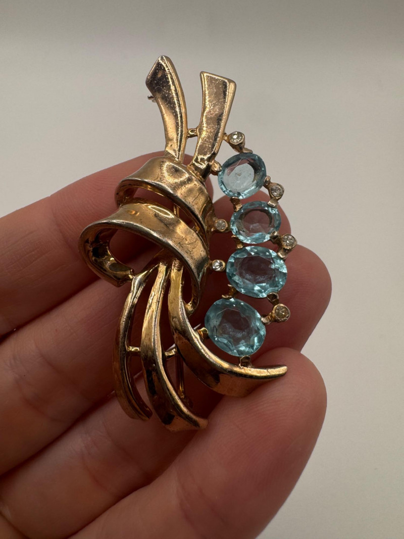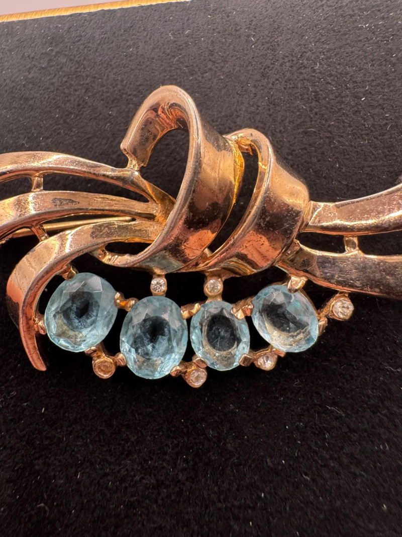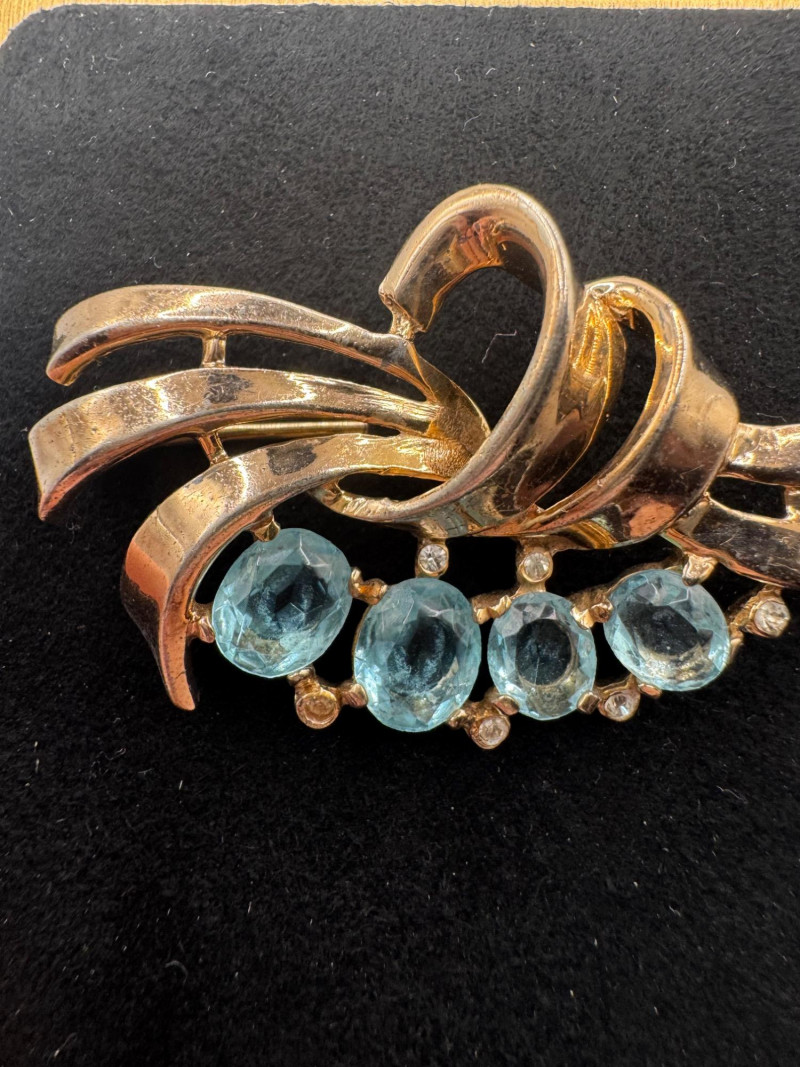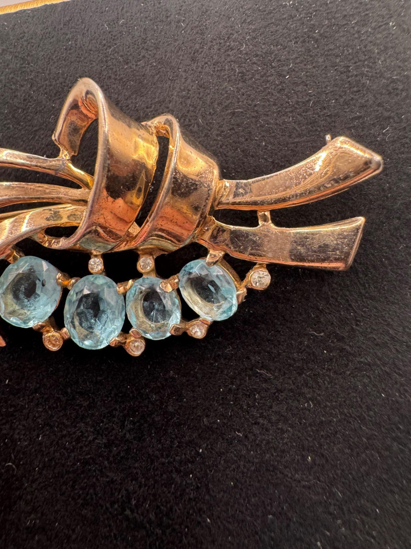 Vintage 1940s Trifari Sterling Brooch Aqua Stones. General Disclaimer:All jewelry in this auction is sold as-is. Metals and gemstones have not been tested unless specified. No guarantees are made regarding metal purity, gemstone authenticity, or origin.