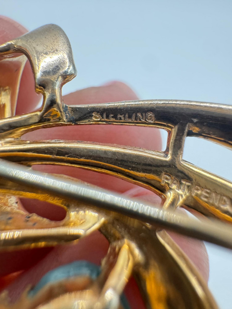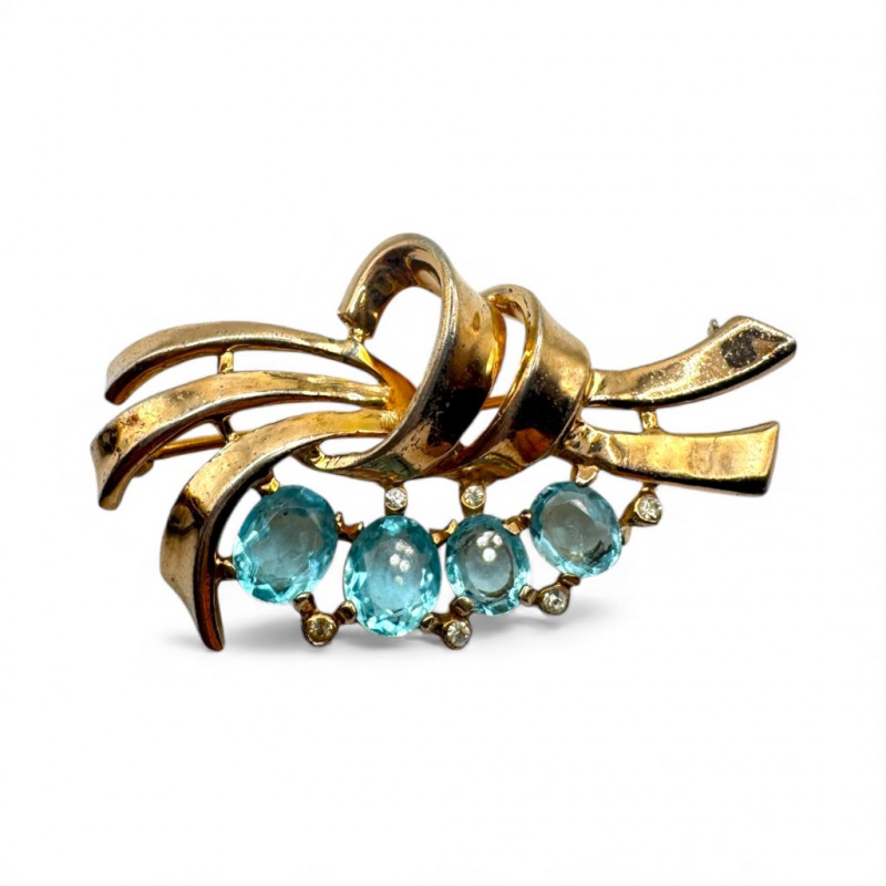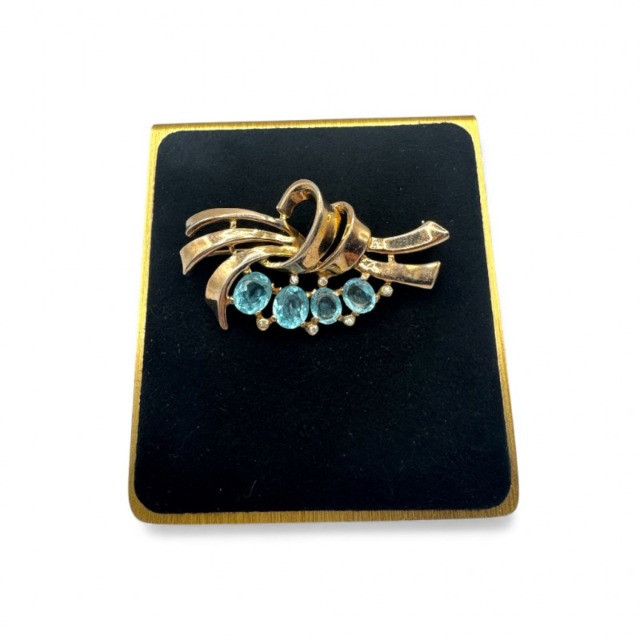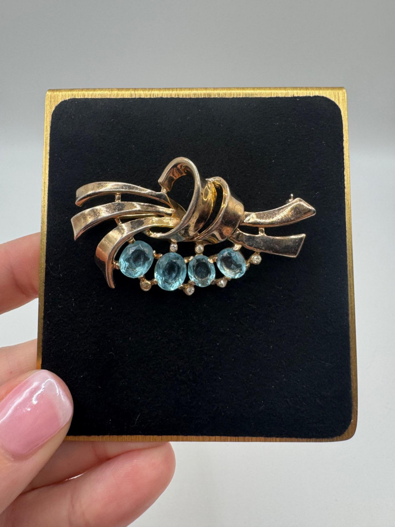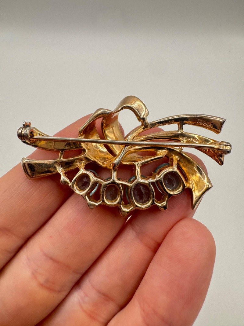 Vintage 1940s Trifari Sterling Brooch Aqua Stones. General Disclaimer:All jewelry in this auction is sold as-is. Metals and gemstones have not been tested unless specified. No guarantees are made regarding metal purity, gemstone authenticity, or origin.