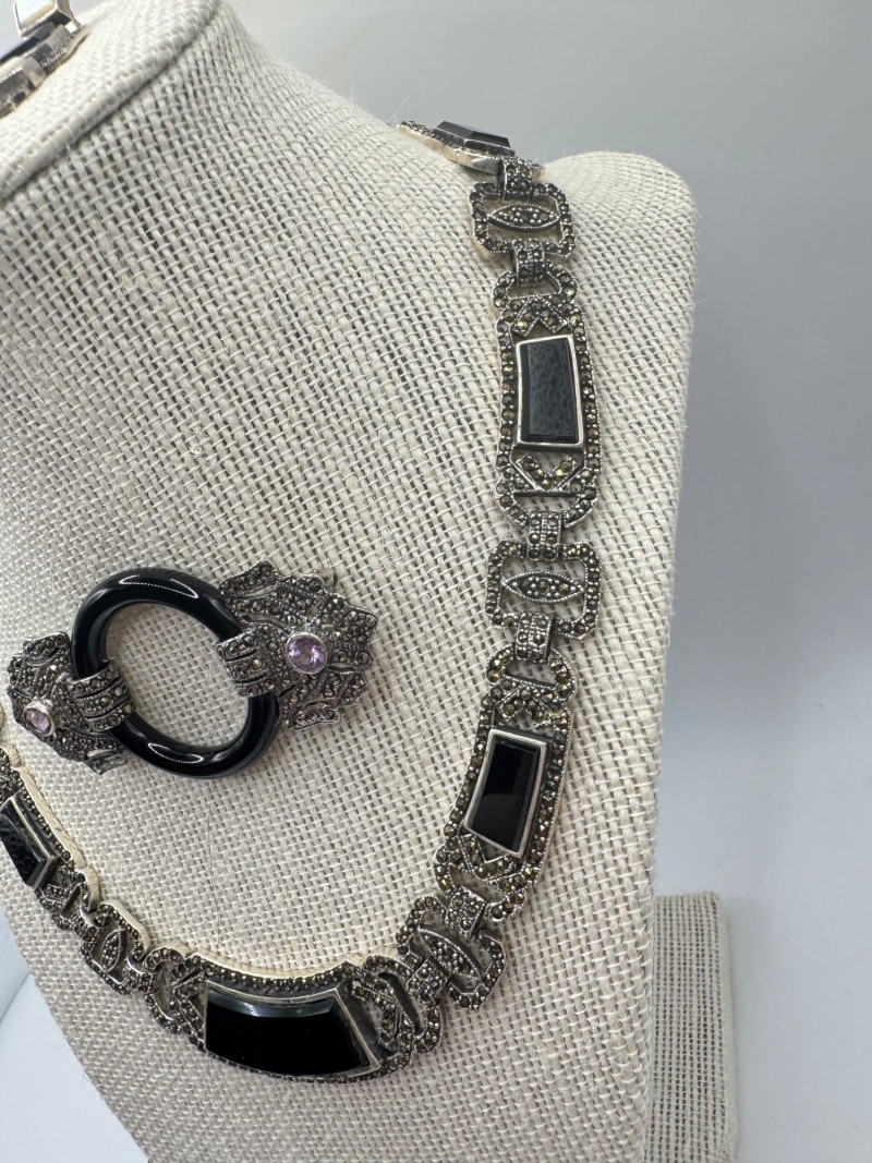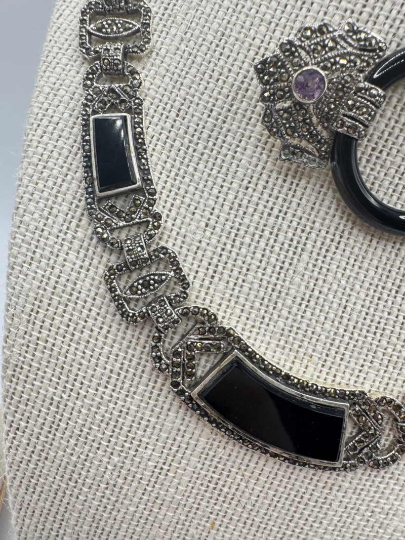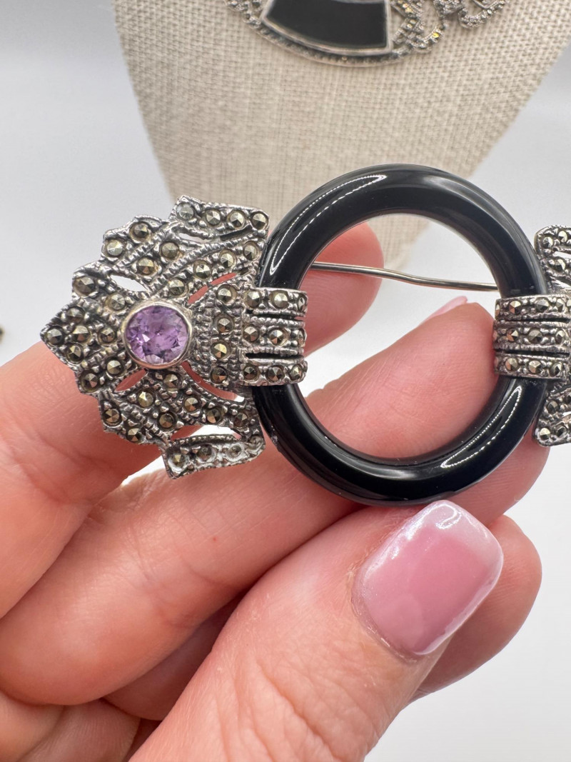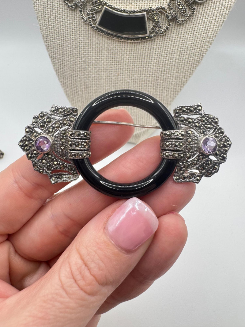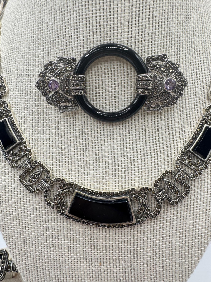 Sterling Silver Marcasite Jewelry Set w/ Onyx, MOP & Amethyst 127.44g
