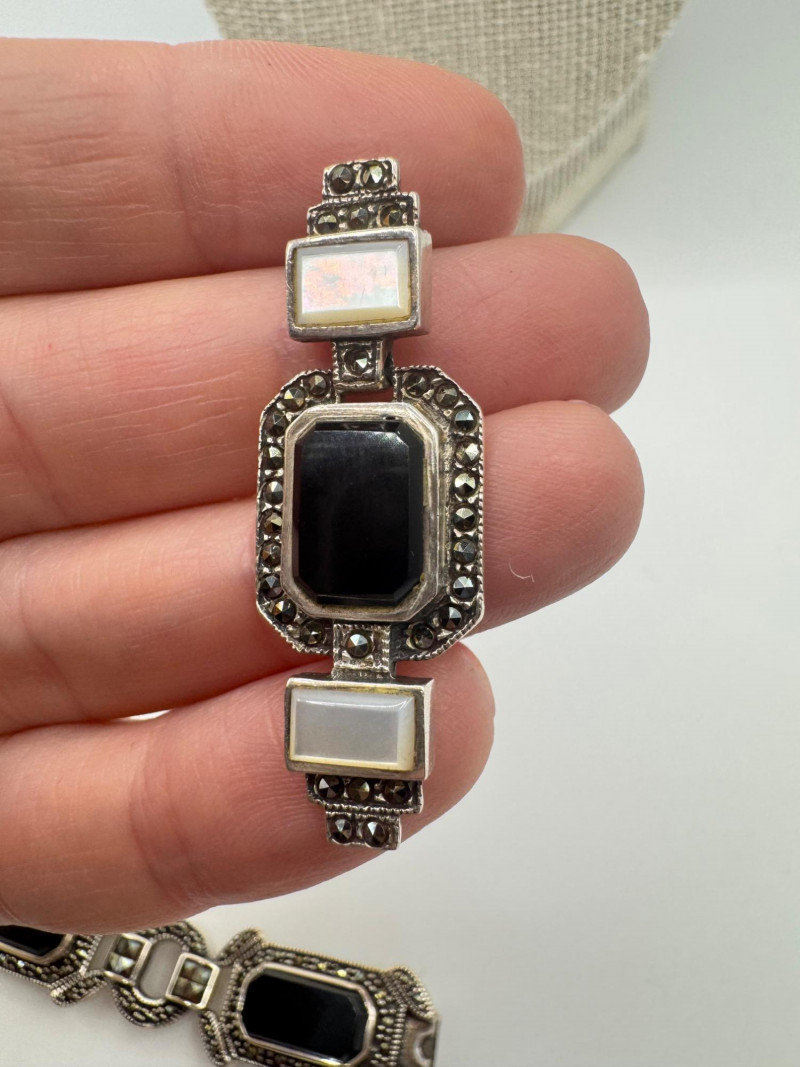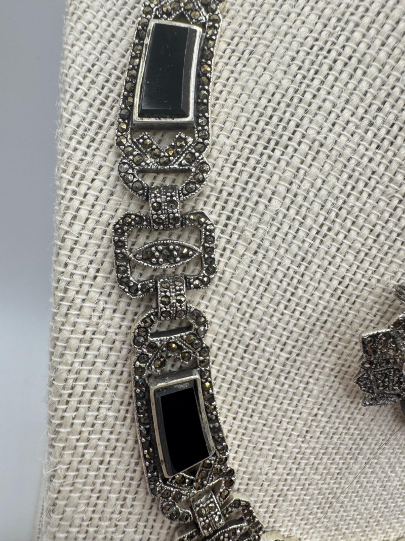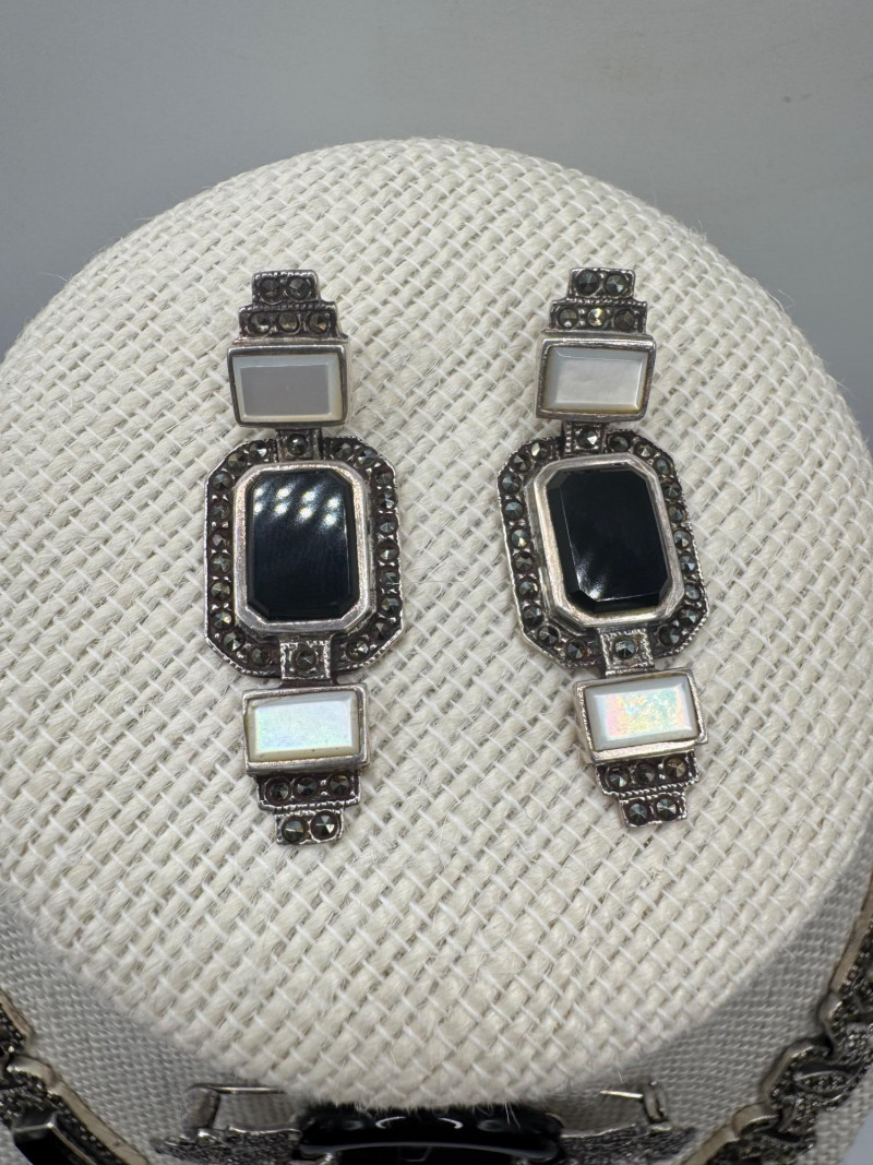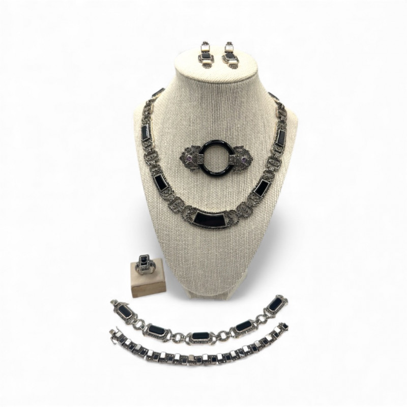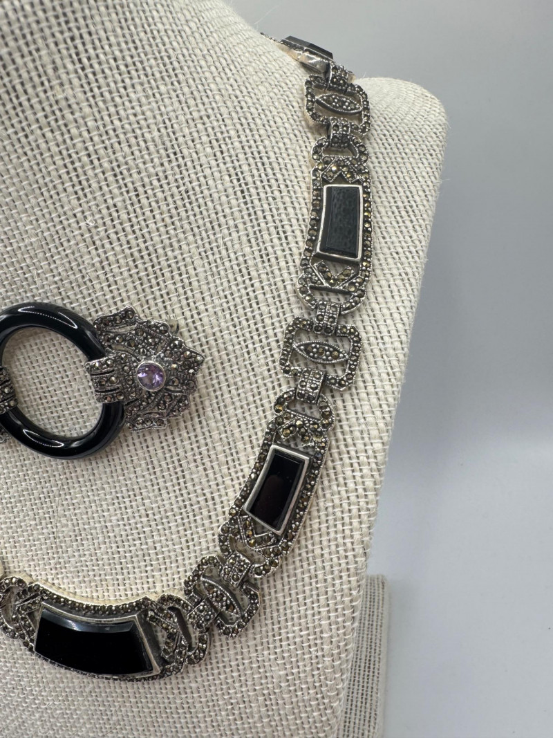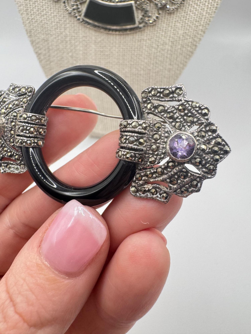 Sterling Silver Marcasite Jewelry Set w/ Onyx, MOP & Amethyst 127.44g