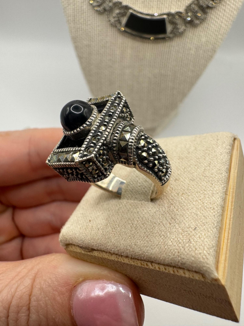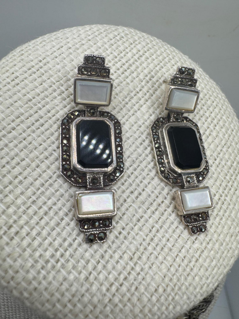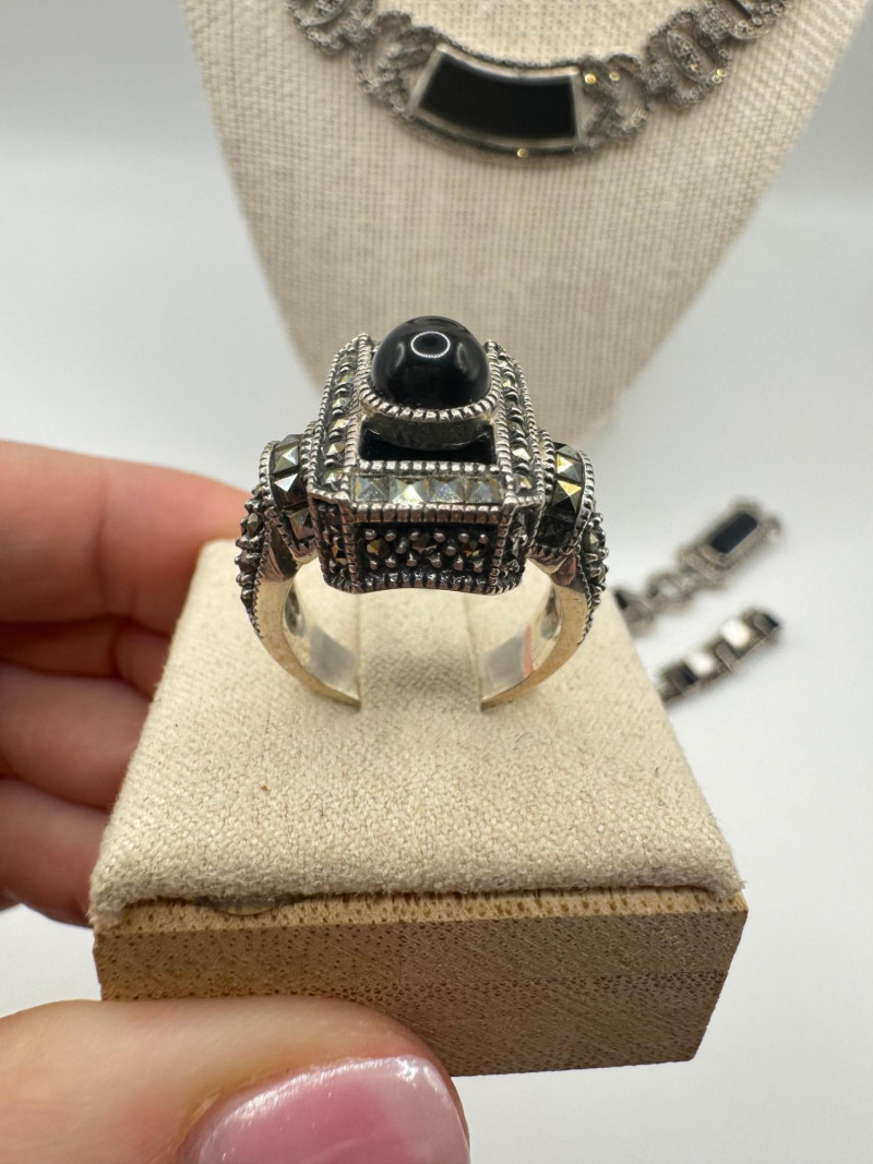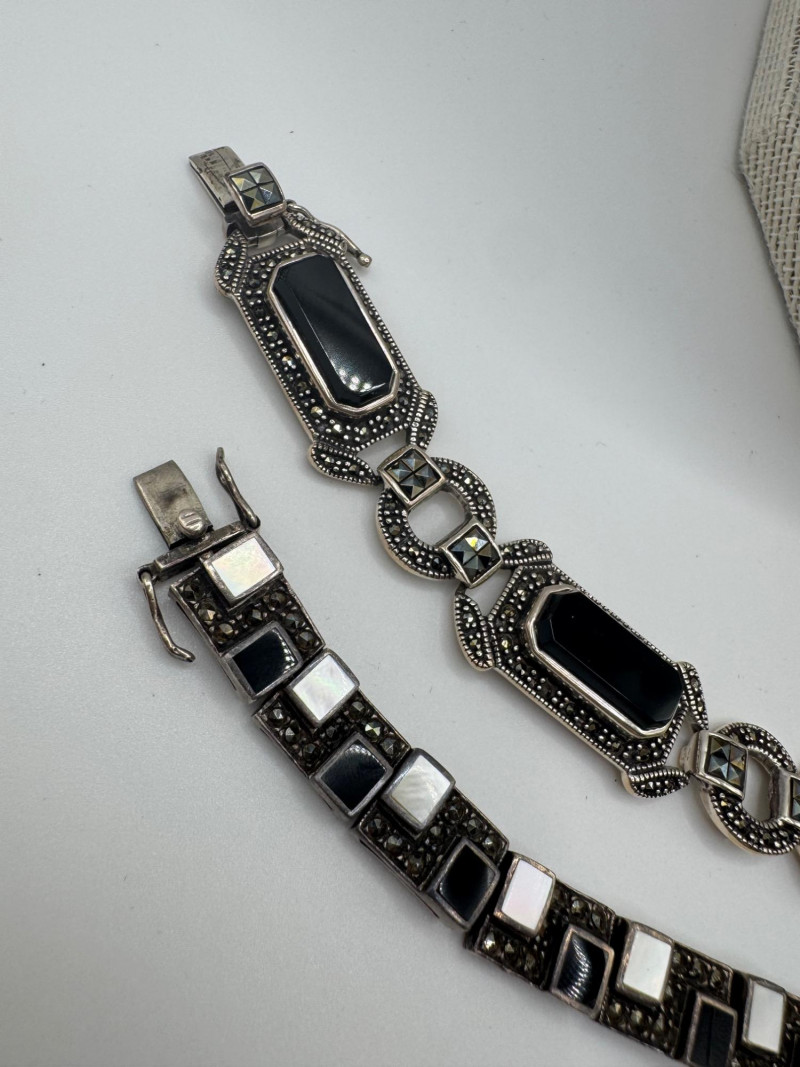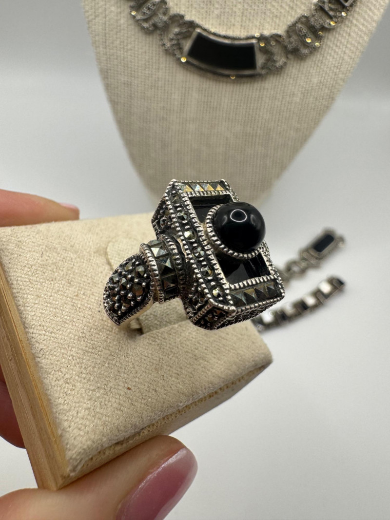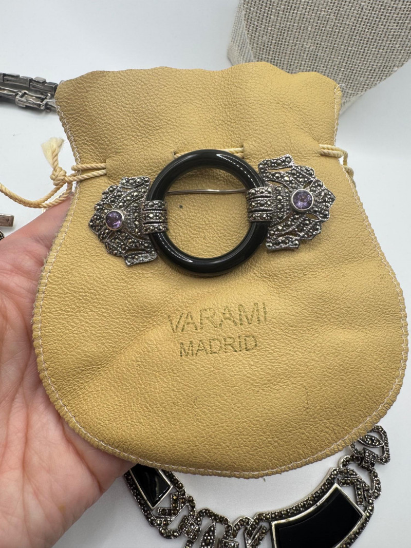 Sterling Silver Marcasite Jewelry Set w/ Onyx, MOP & Amethyst 127.44g