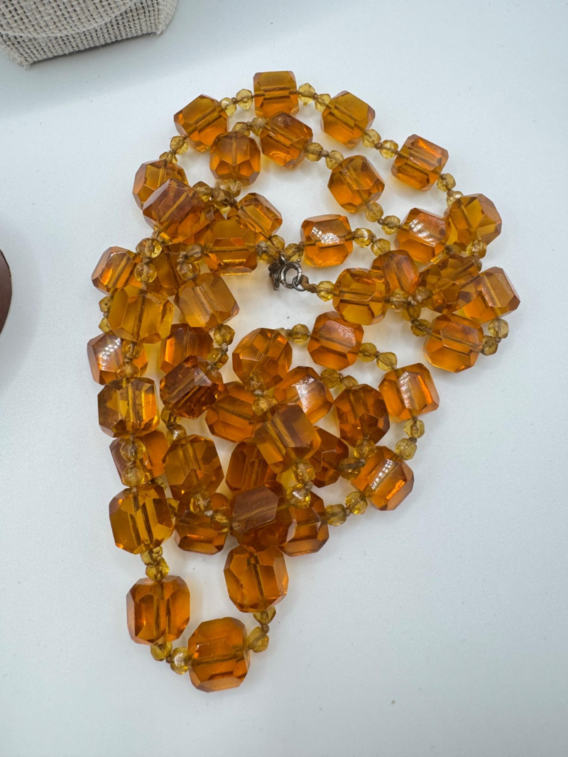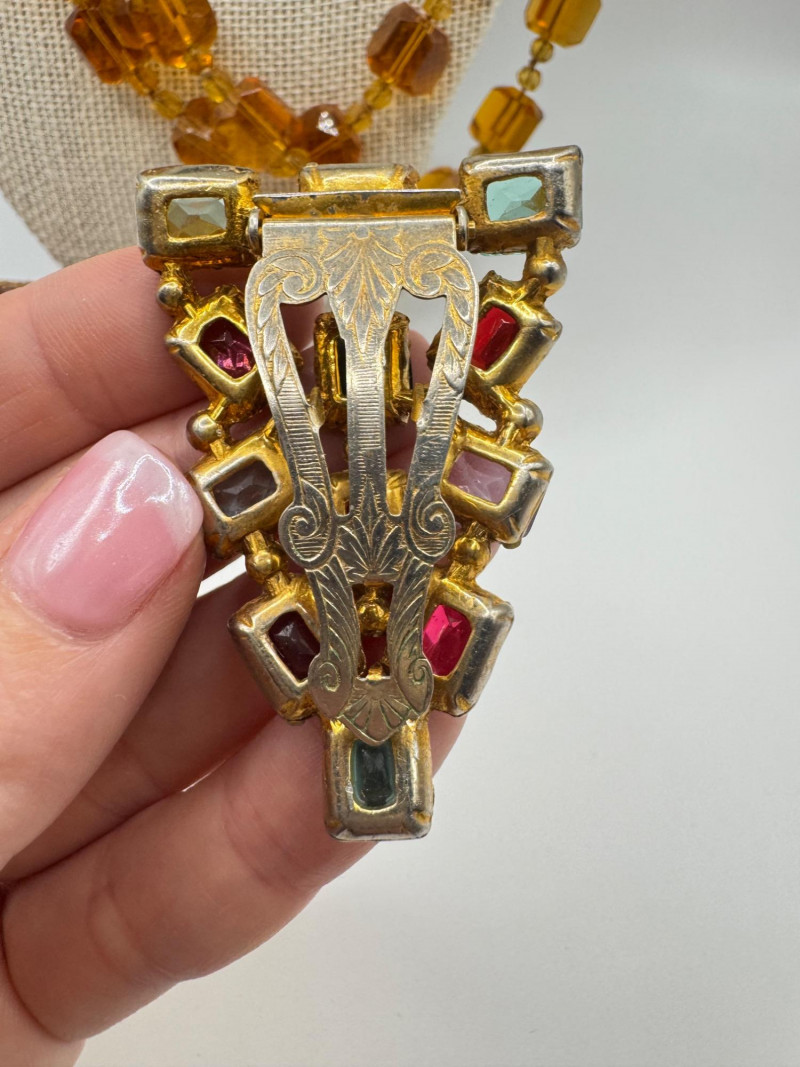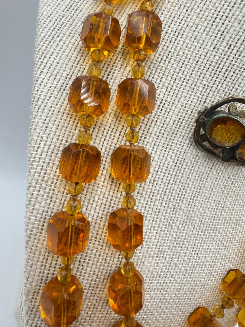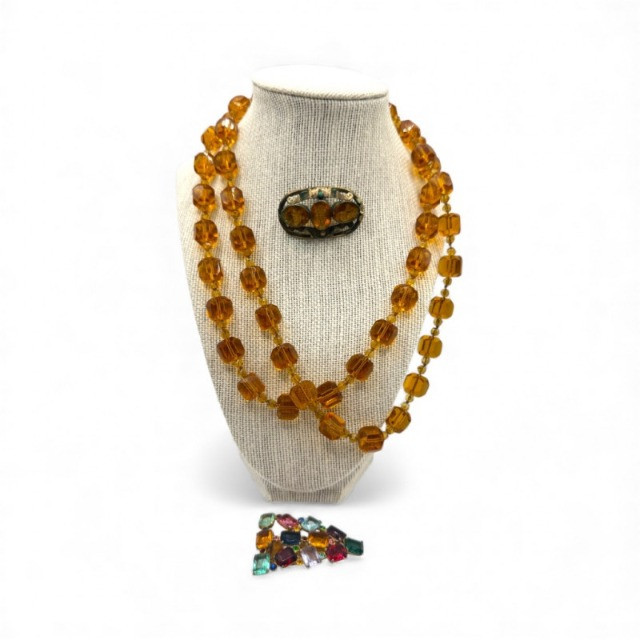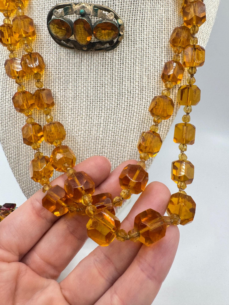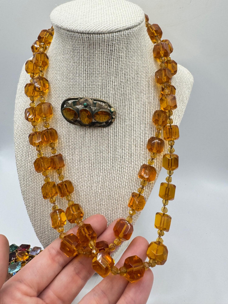 Amber Glass Bead Necklaces, Brooch & Vintage Multigem Shoe Clip.