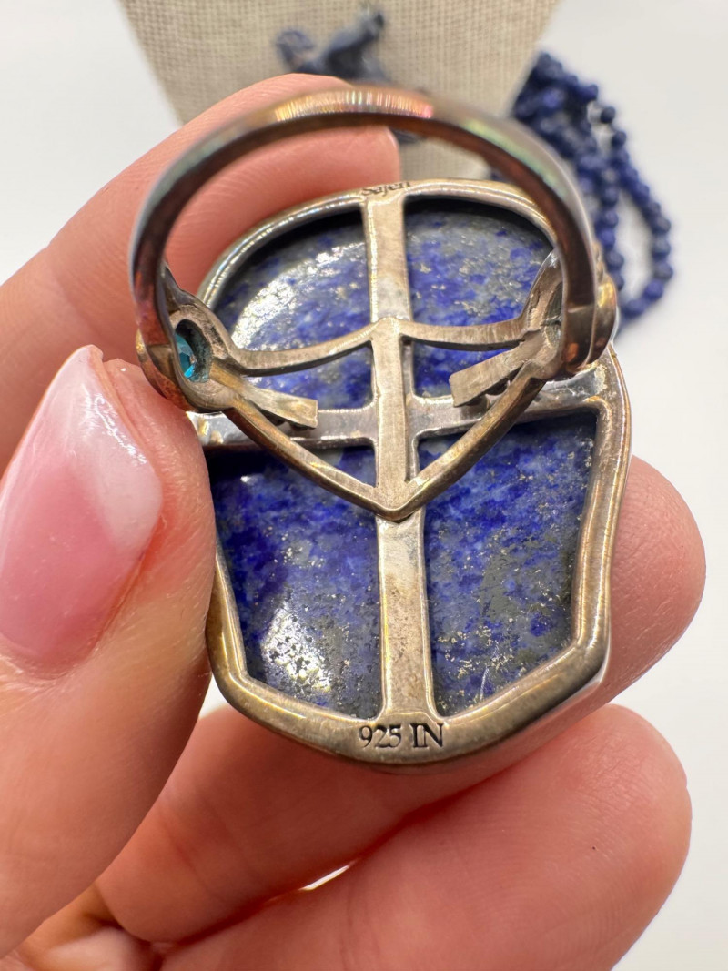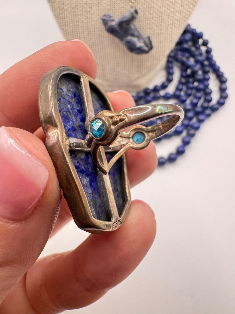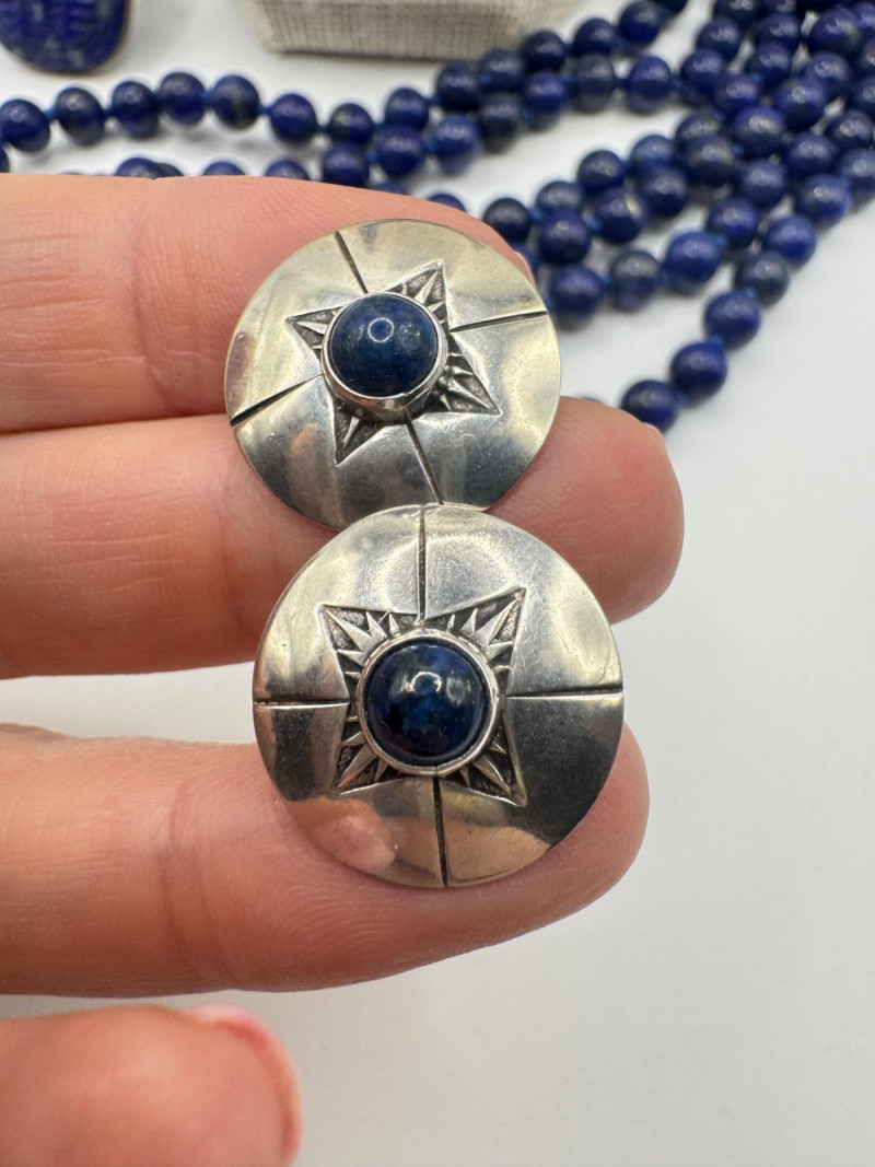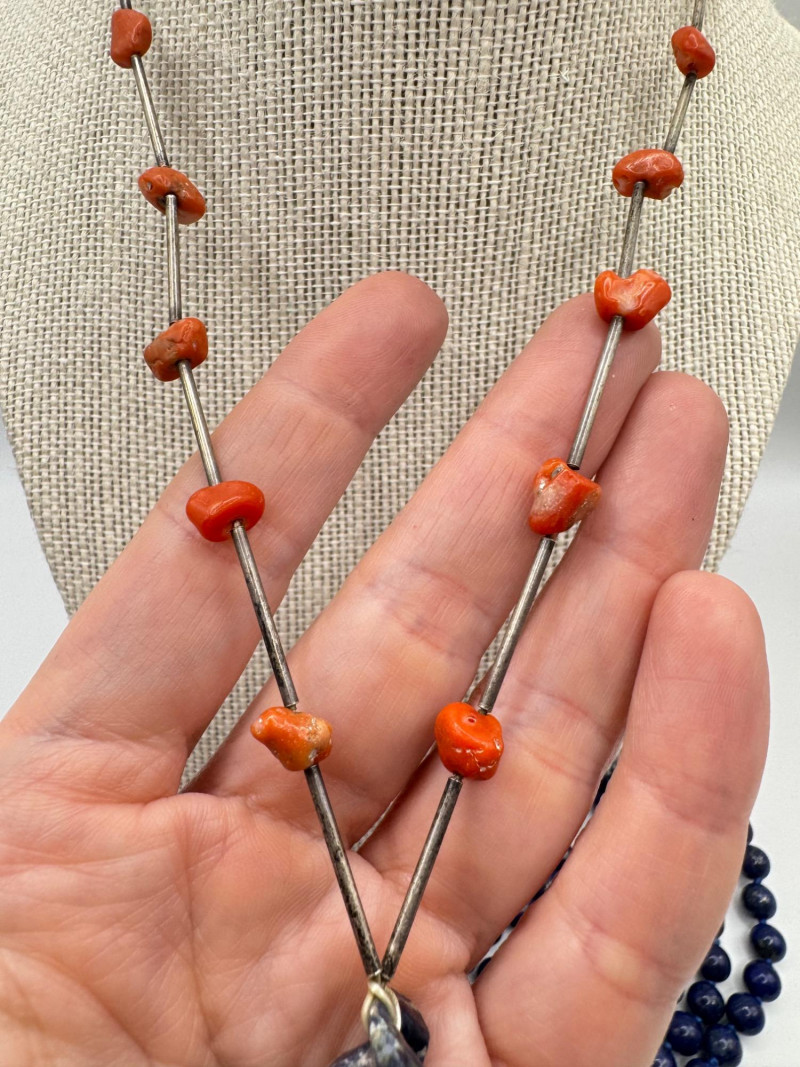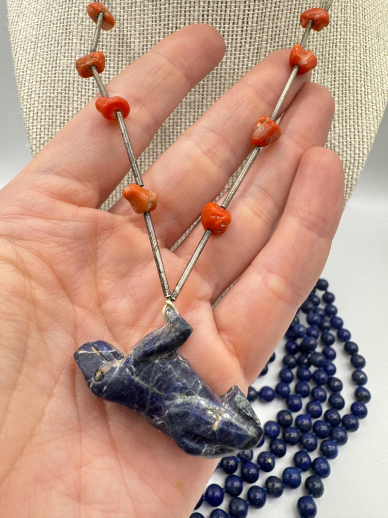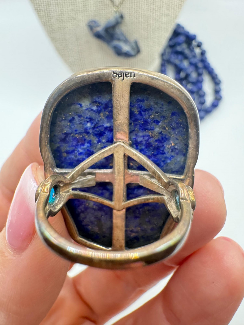 Includes three necklaces: Long strand of lapis-like beads (wrap style, extra long) Navajo-style beaded necklace with coral stones and carved blue fetish pendant Shorter lapis necklace with warm red accents Sajen sterling silver ring featuring carved lapis pharaoh face with blue accent stones Silver-tone earrings with starburst design and blue cabochons (unmarked)