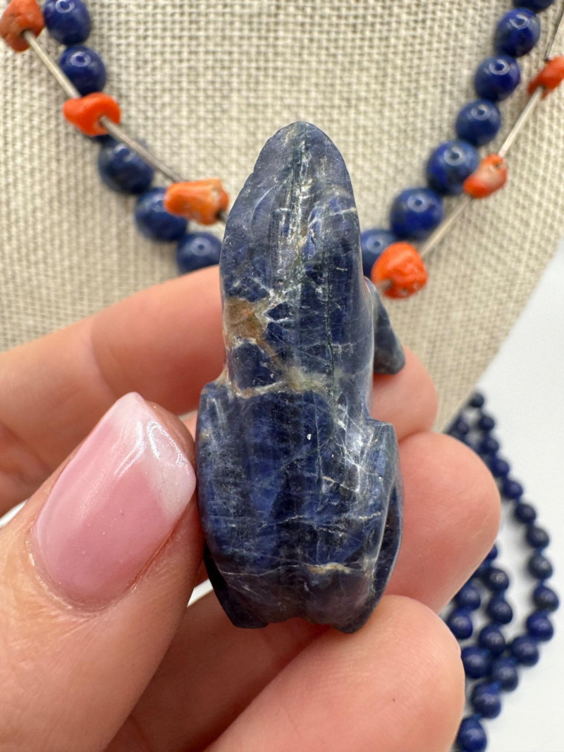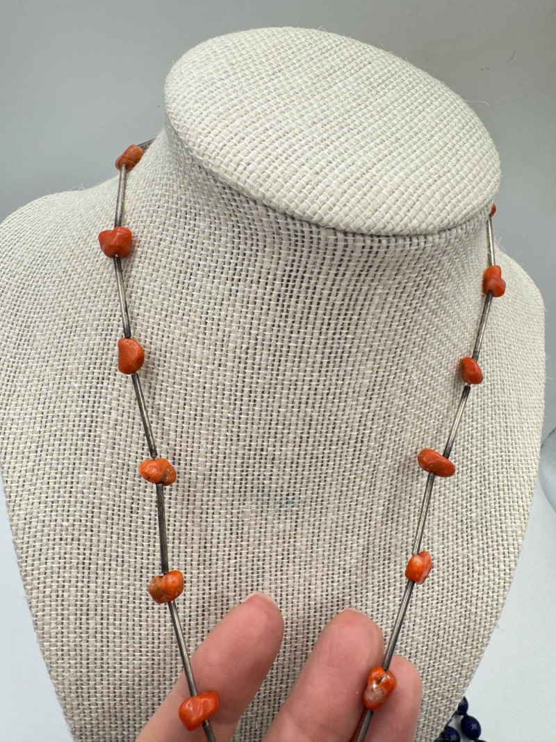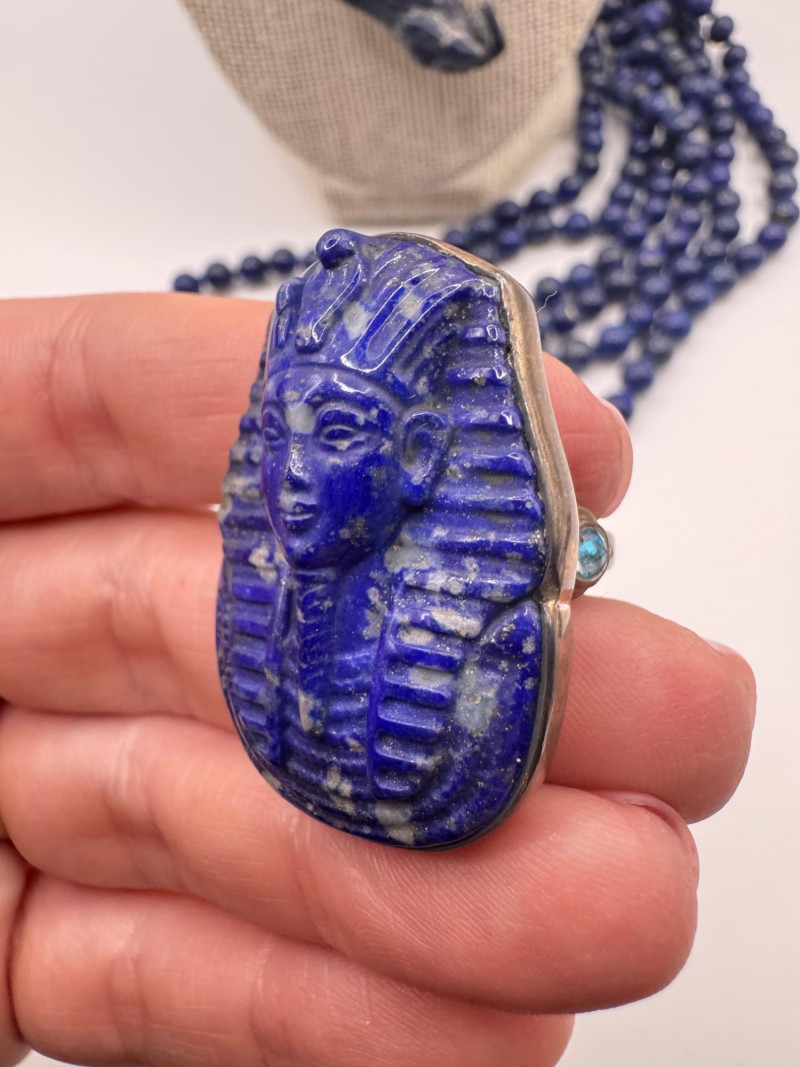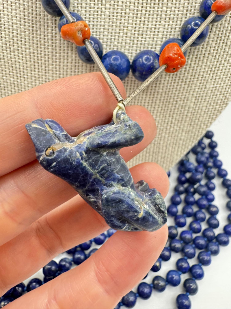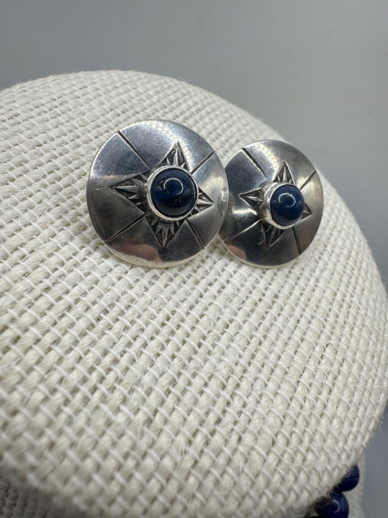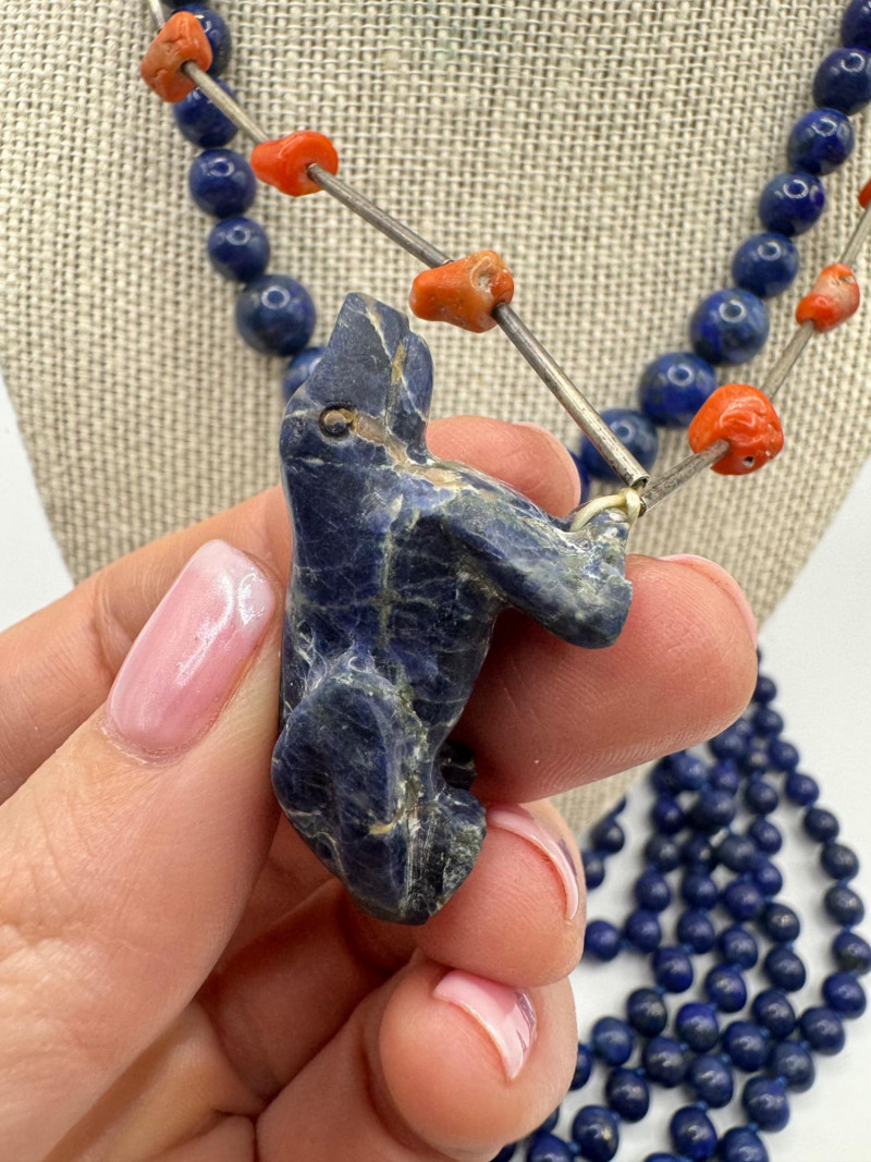 Includes three necklaces: Long strand of lapis-like beads (wrap style, extra long) Navajo-style beaded necklace with coral stones and carved blue fetish pendant Shorter lapis necklace with warm red accents Sajen sterling silver ring featuring carved lapis pharaoh face with blue accent stones Silver-tone earrings with starburst design and blue cabochons (unmarked)