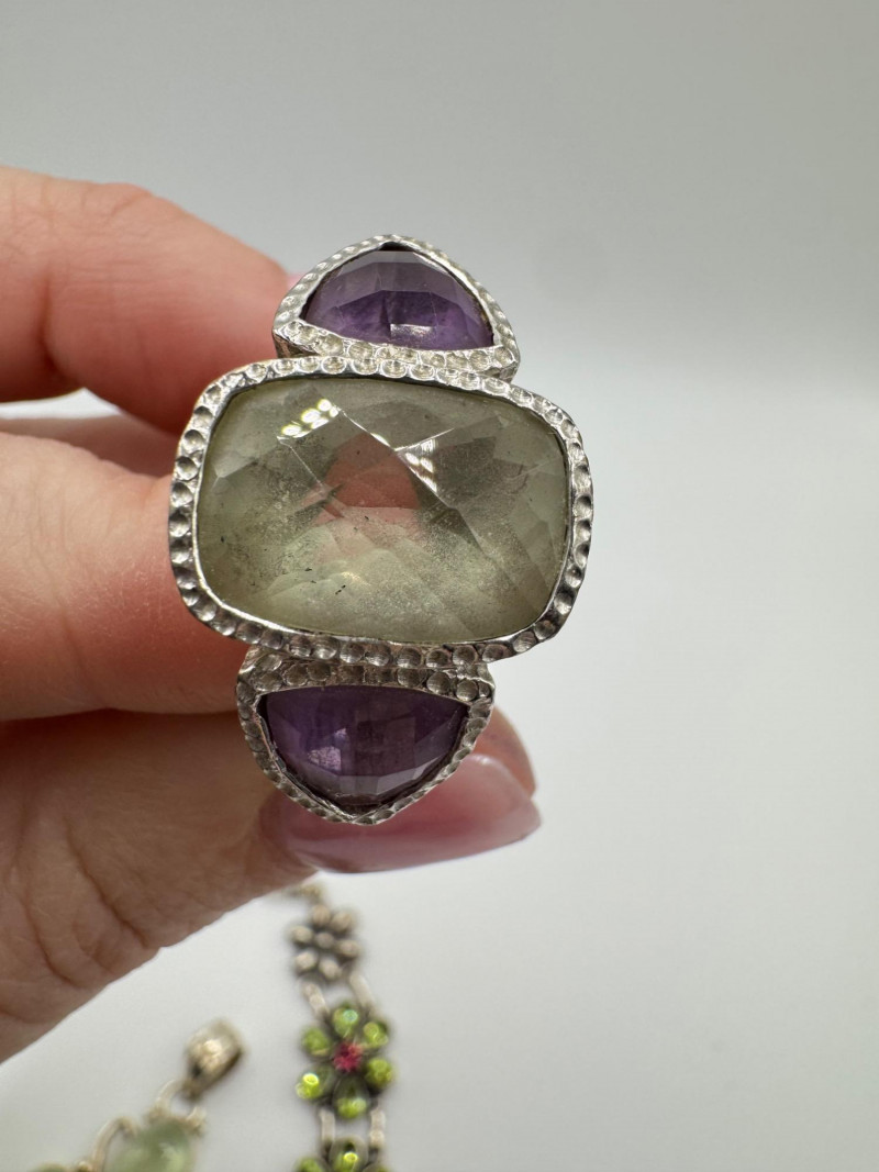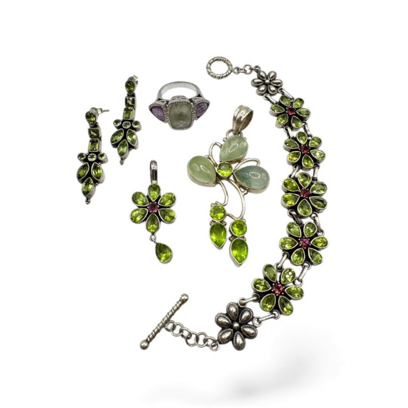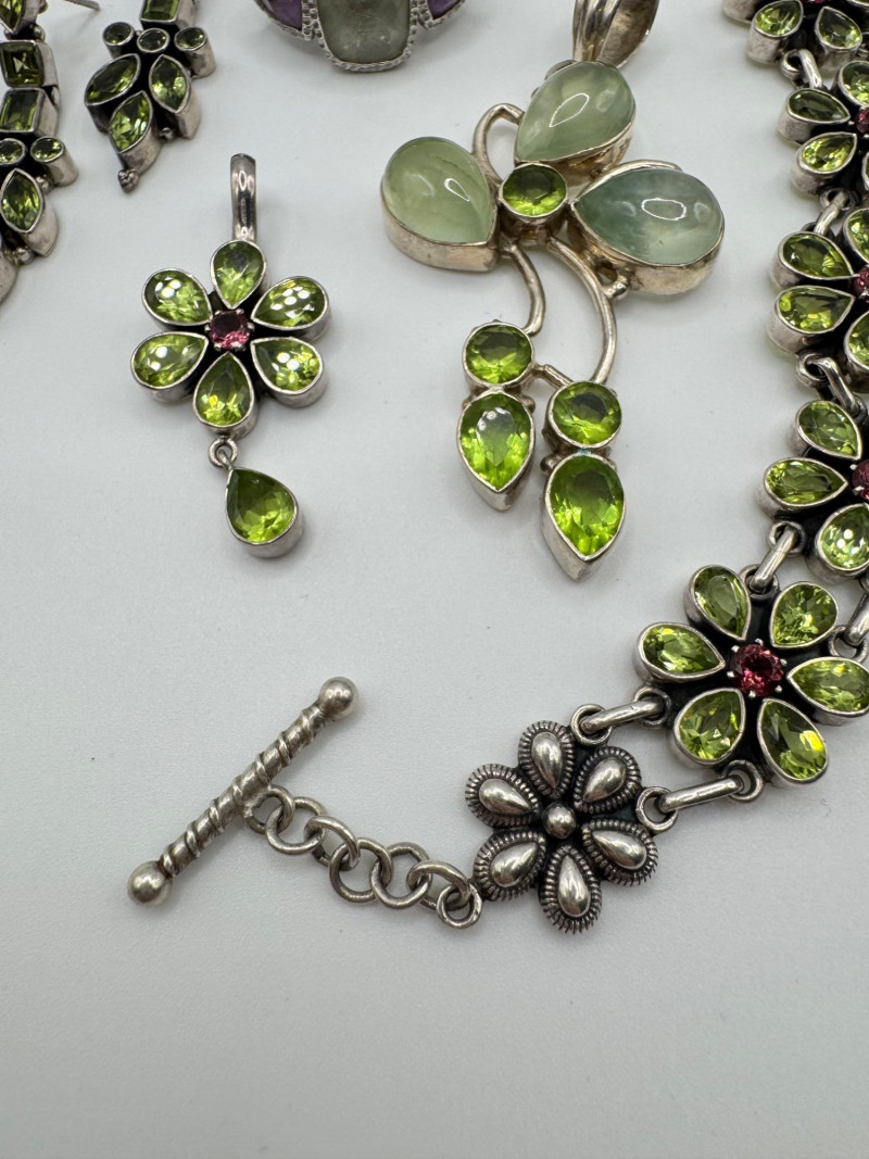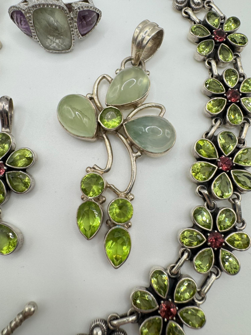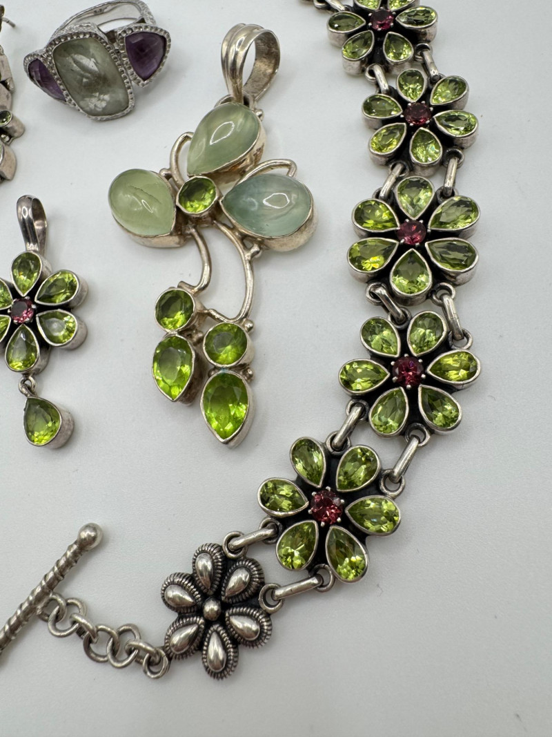Sterling Jewelry Lot – Green & Purple Stones 62.12g. General Disclaimer:All jewelry in this auction is sold as-is. Metals and gemstones have not been tested unless specified. No guarantees are made regarding metal purity, gemstone authenticity, or origin. No refunds based on identification or quality.
