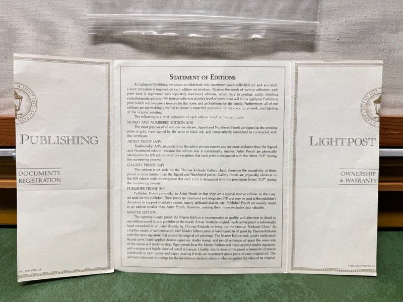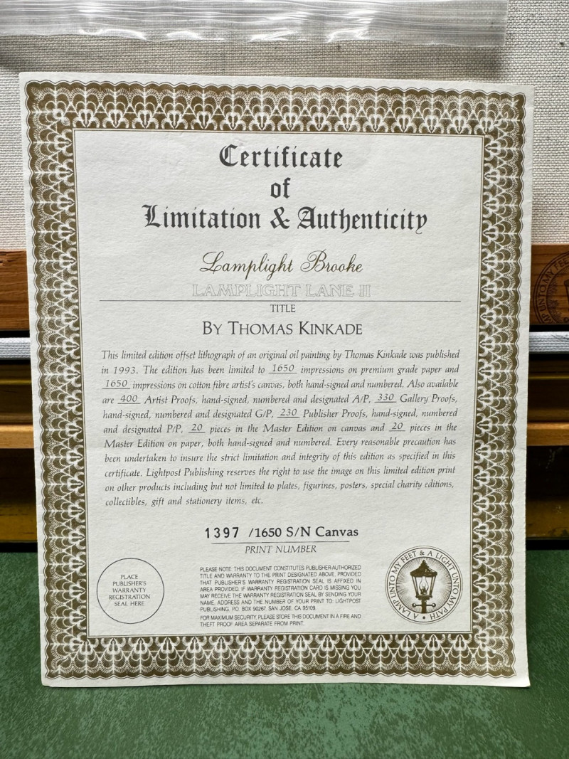 Thomas Kinkade “Lamplight Brooke” - Framed Canvas, Signed w/ COA.
