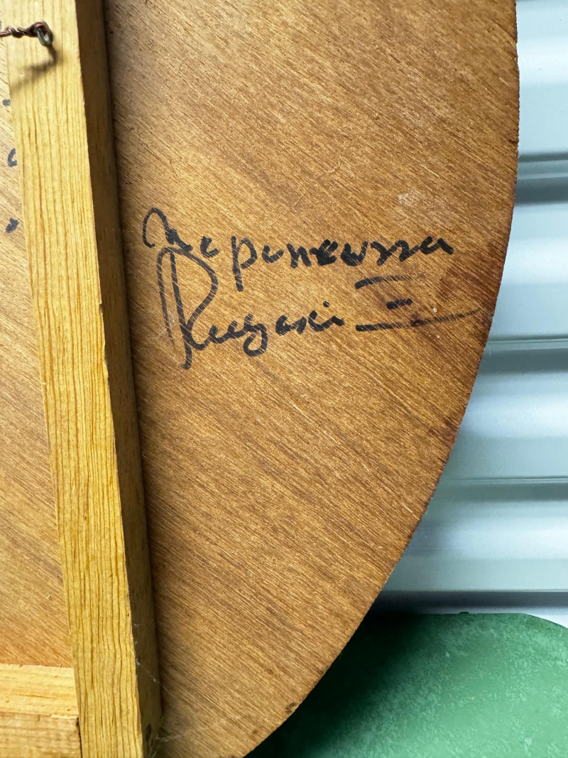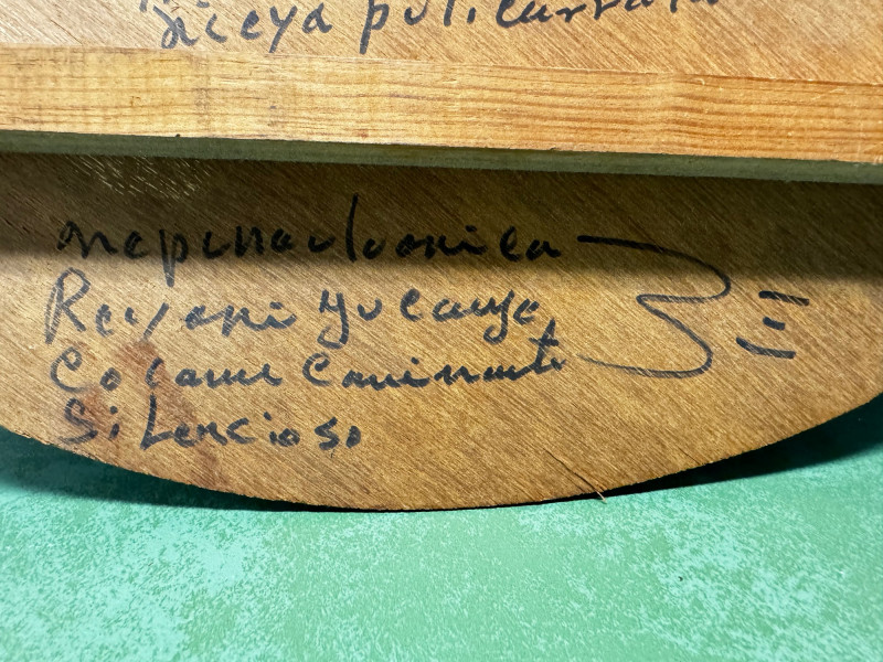 Signed and inscribed on the reverse in Spanish, referencing Huichol cosmology and the “three worlds”