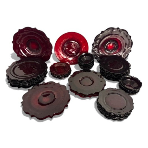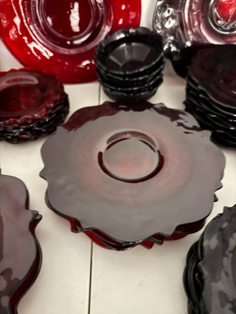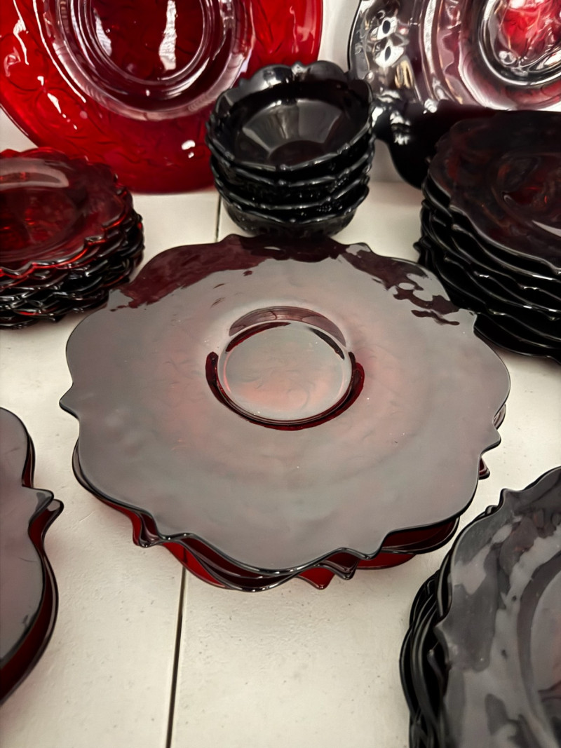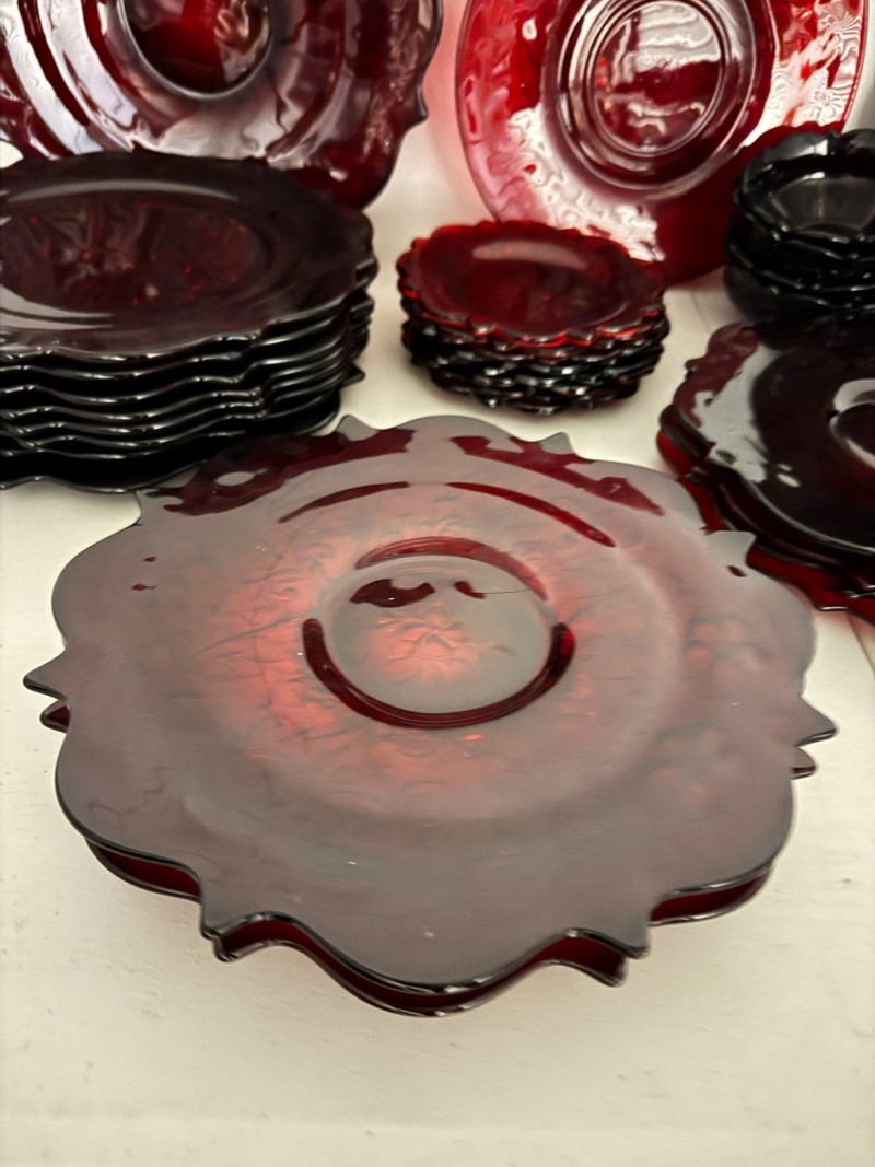 McKee Glass Style Red Rock Ruby Dinnerware – 47 Pc, Est. Value $500+ Large 47-piece red rock crystal dinnerware collection Includes: