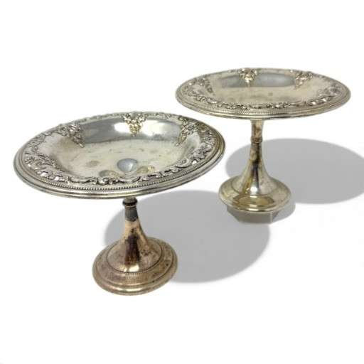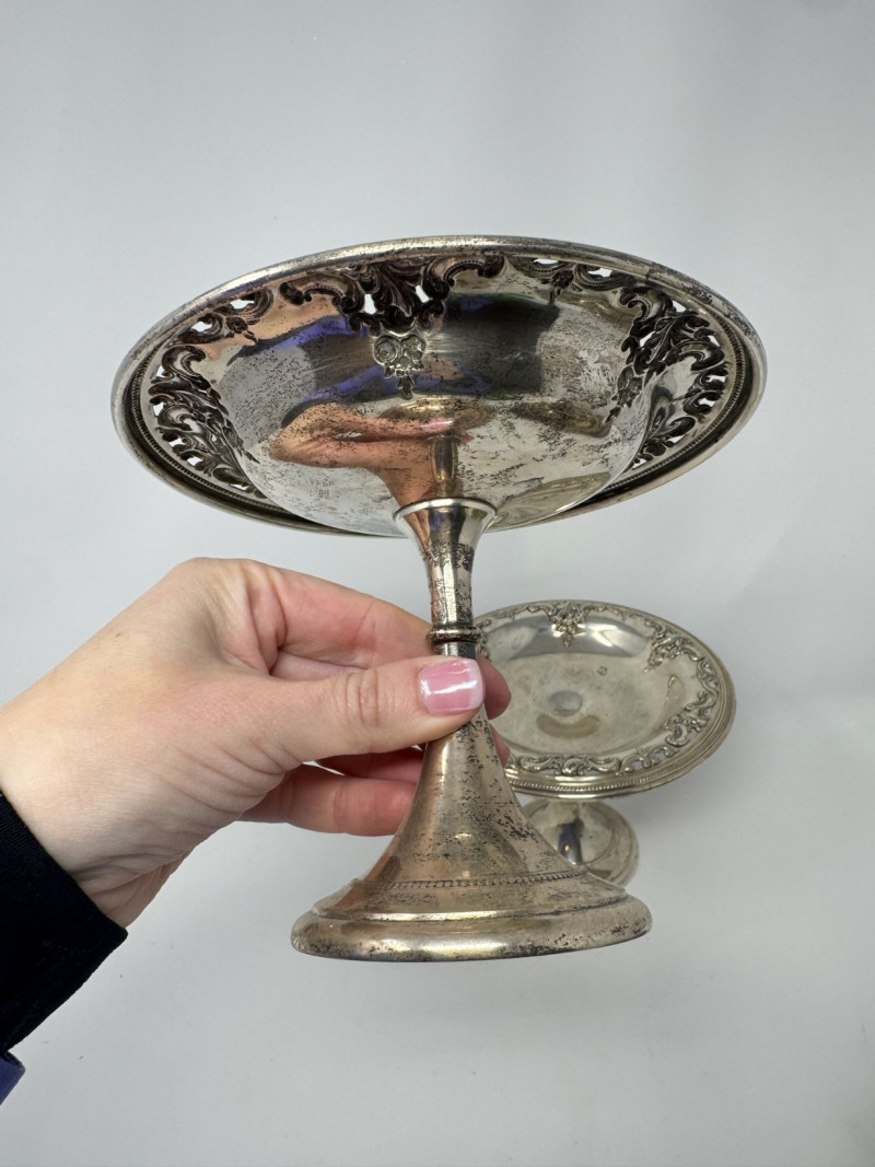 Wallace Sterling Grand Baroque Pedestal Dishes – 463.02g. Disclaimer: Sterling and other metals are not tested. Items are sold as is with no guarantees on metal content or purity. No refunds based on metal quality.