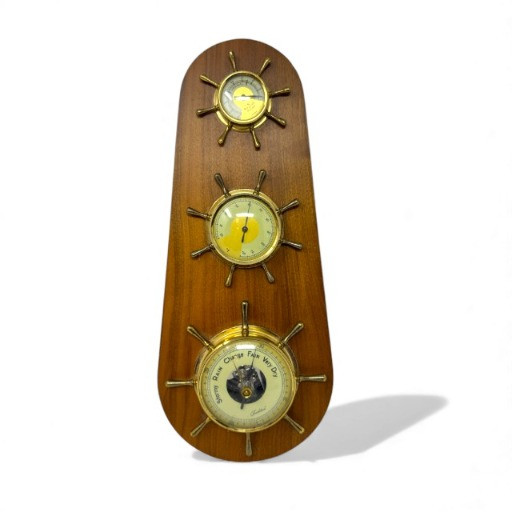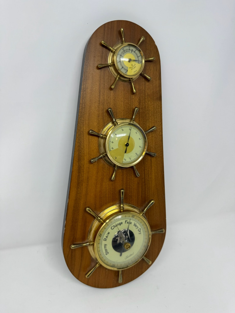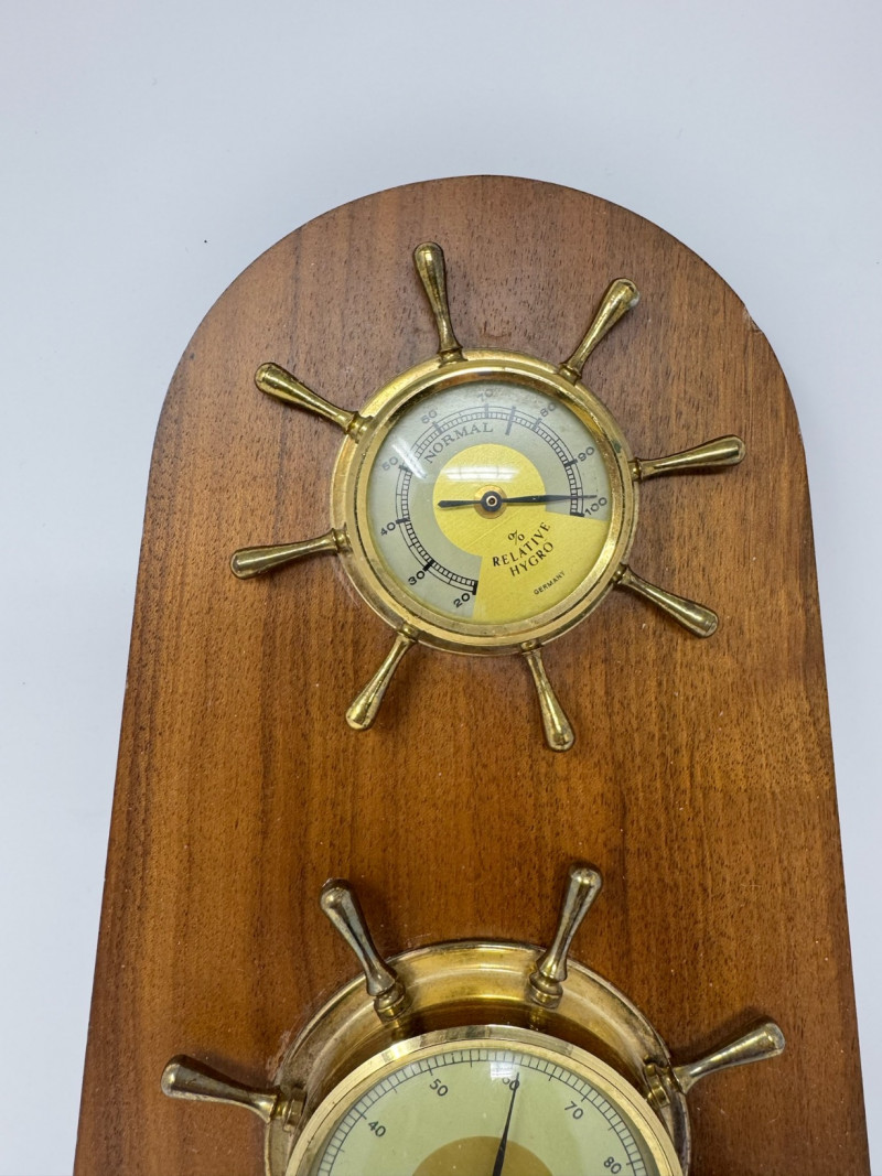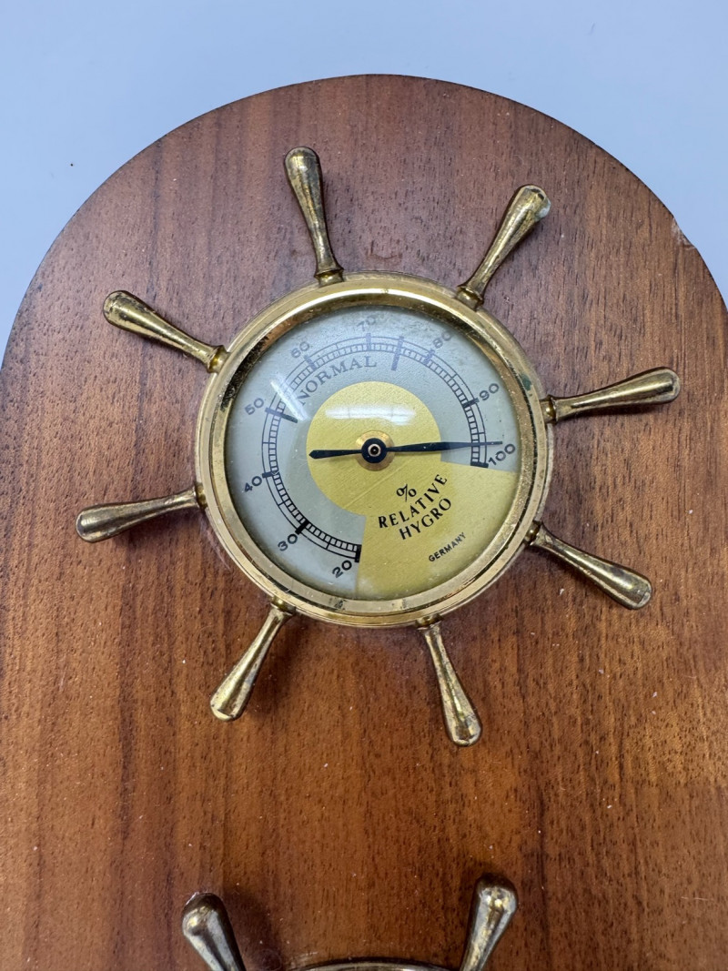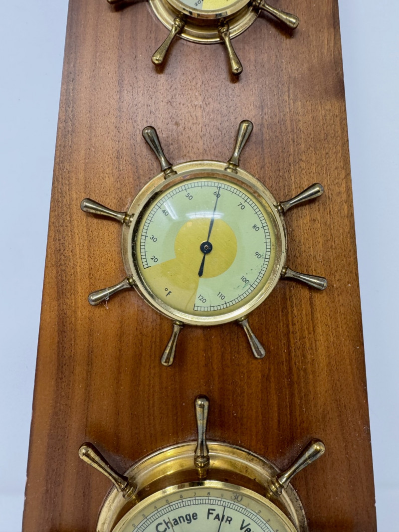 Vintage Nautical Barometer – 15” Tall, Brass & Wood Ship’s Wheel.