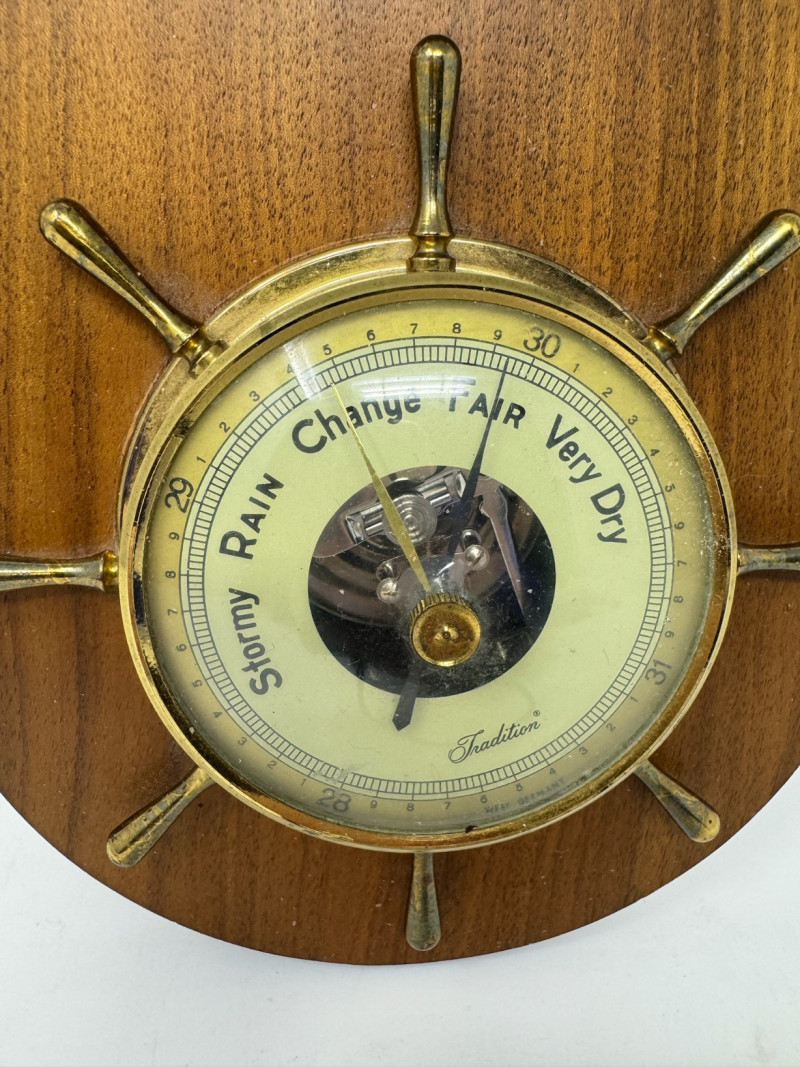 Lot # 160 - Vintage Nautical Barometer – 15” Tall, Brass & Wood Ship’s Wheel