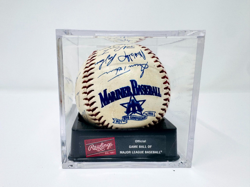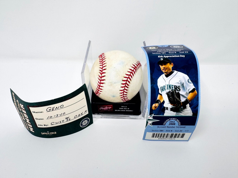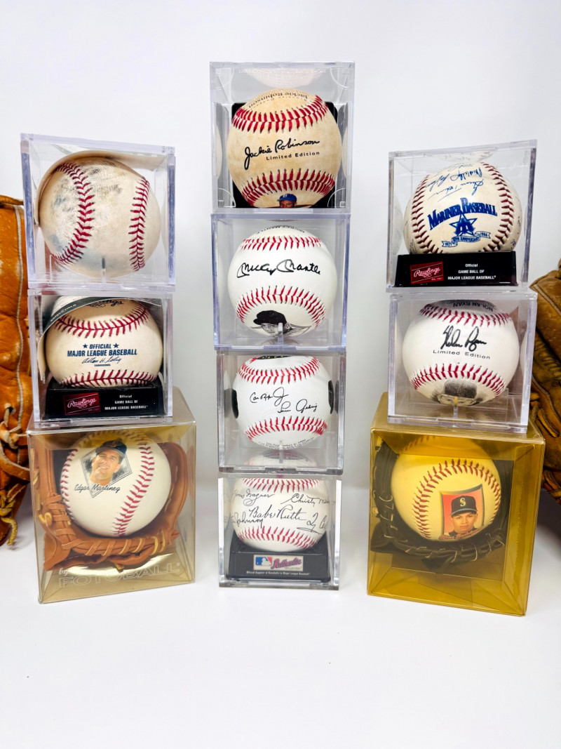 Baseball Memorabilia Lot – Gloves, Safeco/T-Mobile Field Dirt, & Balls. Includes: • Stamped Signature Baseballs (printed/replica signatures): Jackie Robinson Mickey Mantle Nolan Ryan Seattle Mariners 10th Anniversary ball Game Ball – Mariners vs. Texas, 3/28/2007 Foul Ball – Hit by Cust #32, 10/3/2010 (OAK A’s) Cal Ripken Jr. & Lou Gehrig dual-signature ball 1936 First Hall of Fame Inductees (Ruth, Wagner, Cobb, Mathewson, Johnson) Edgar Martinez & Alex Rodriguez collectible baseballs Notes: