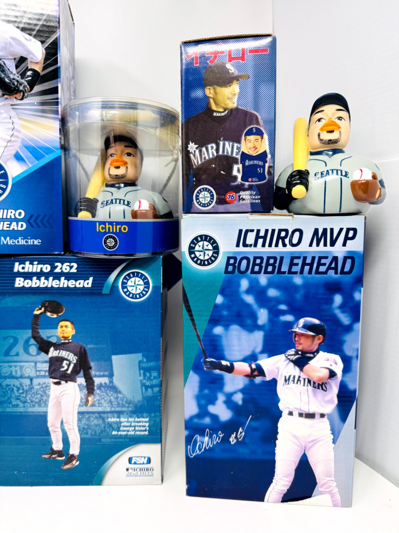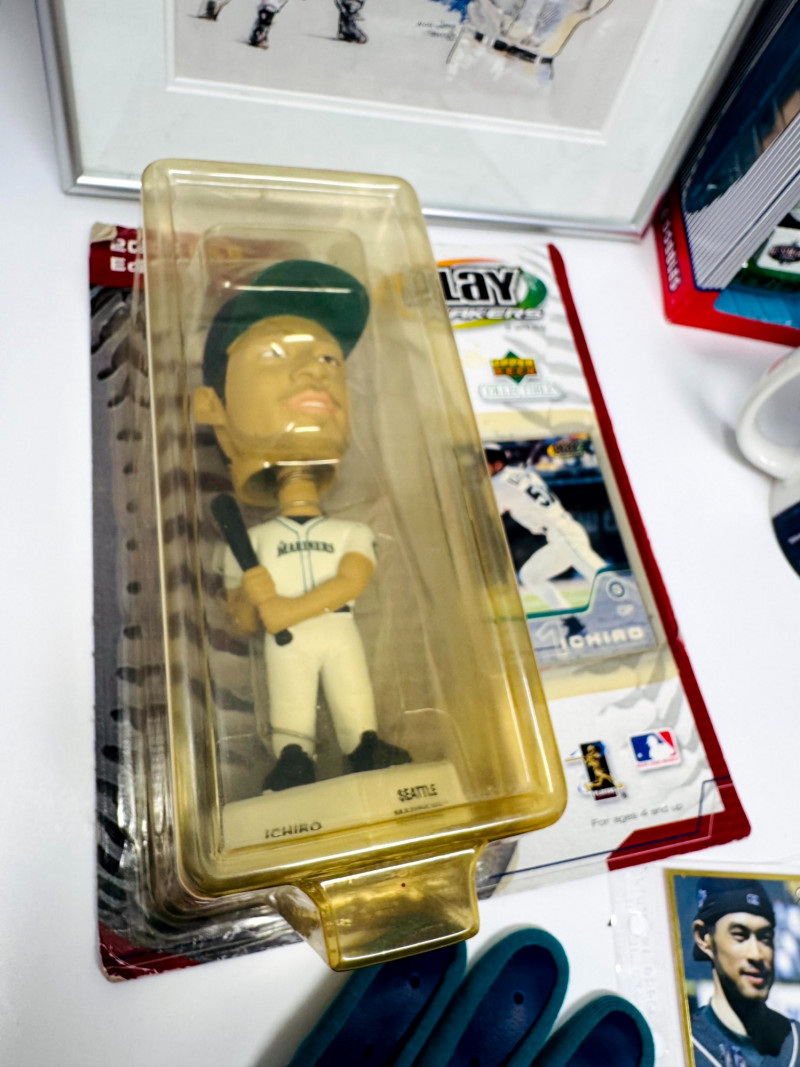 Ichiro Suzuki Collectible Lot – Bobbleheads, Signed Items, Cards & More. Large Ichiro Suzuki collector’s lot featuring a mix of bobbleheads, memorabilia, and fan items. Includes: