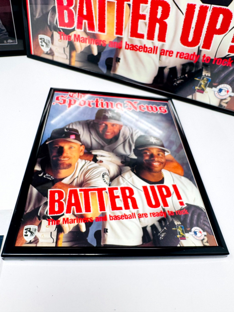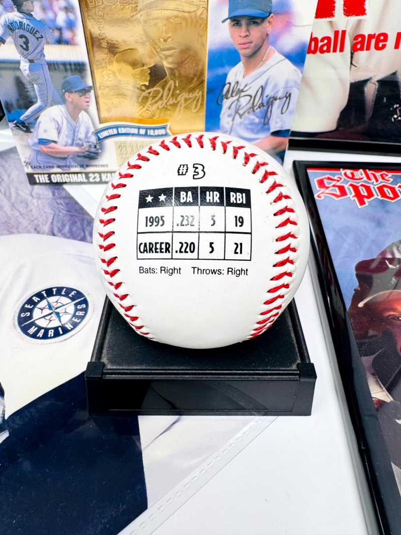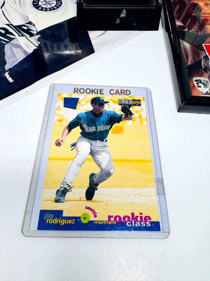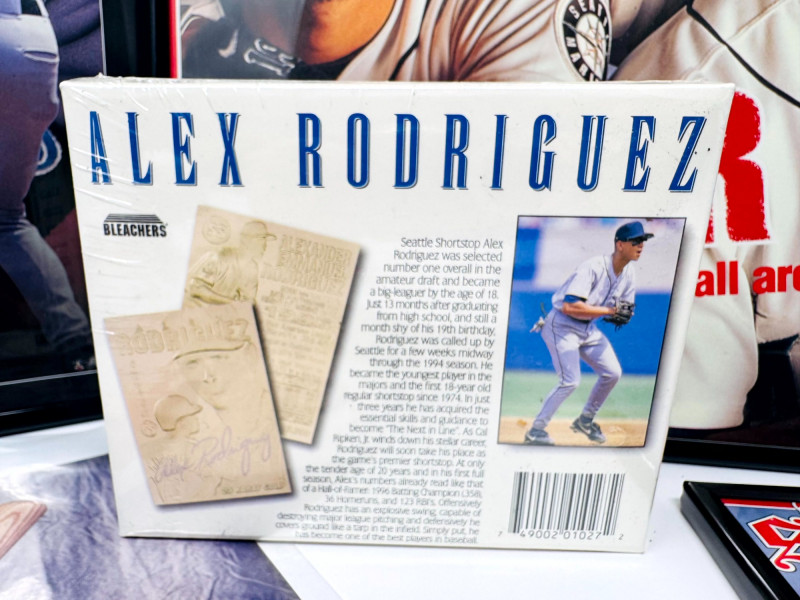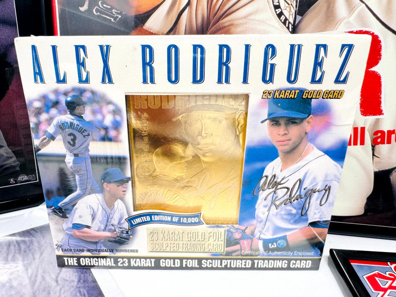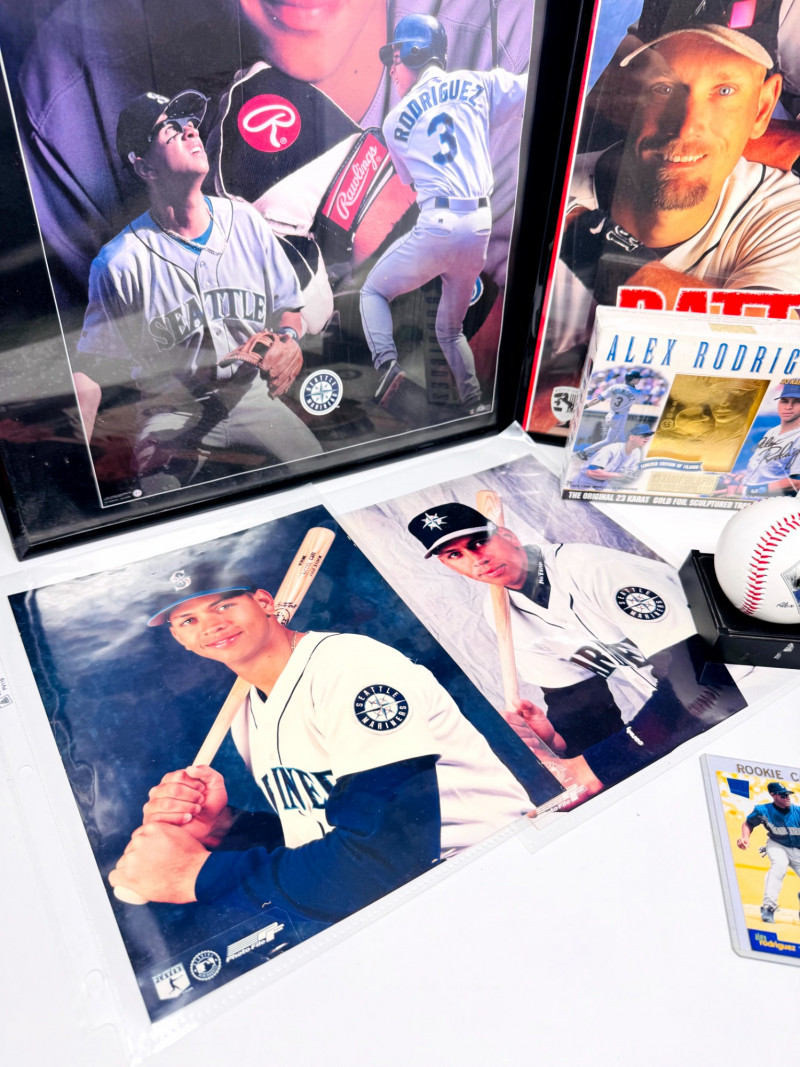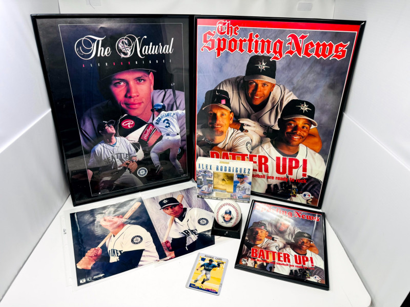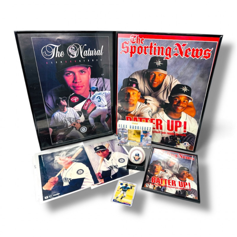 Alex Rodriguez Mariners Collectibles Lot w/ Large Framed Prints. Two framed 16x20" Alex Rodriguez posters The Natural The Sporting News – Batter Up! Sealed Alex Rodriguez 23K gold foil sculpted trading card Limited Edition of 10,000 Certificate of authenticity included Alex Rodriguez collectible printed baseball with stats A-Rod rookie trading card (in protective sleeve) Two unframed A-Rod Mariners posters