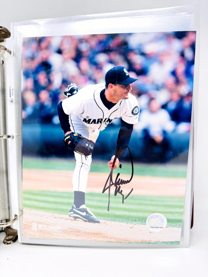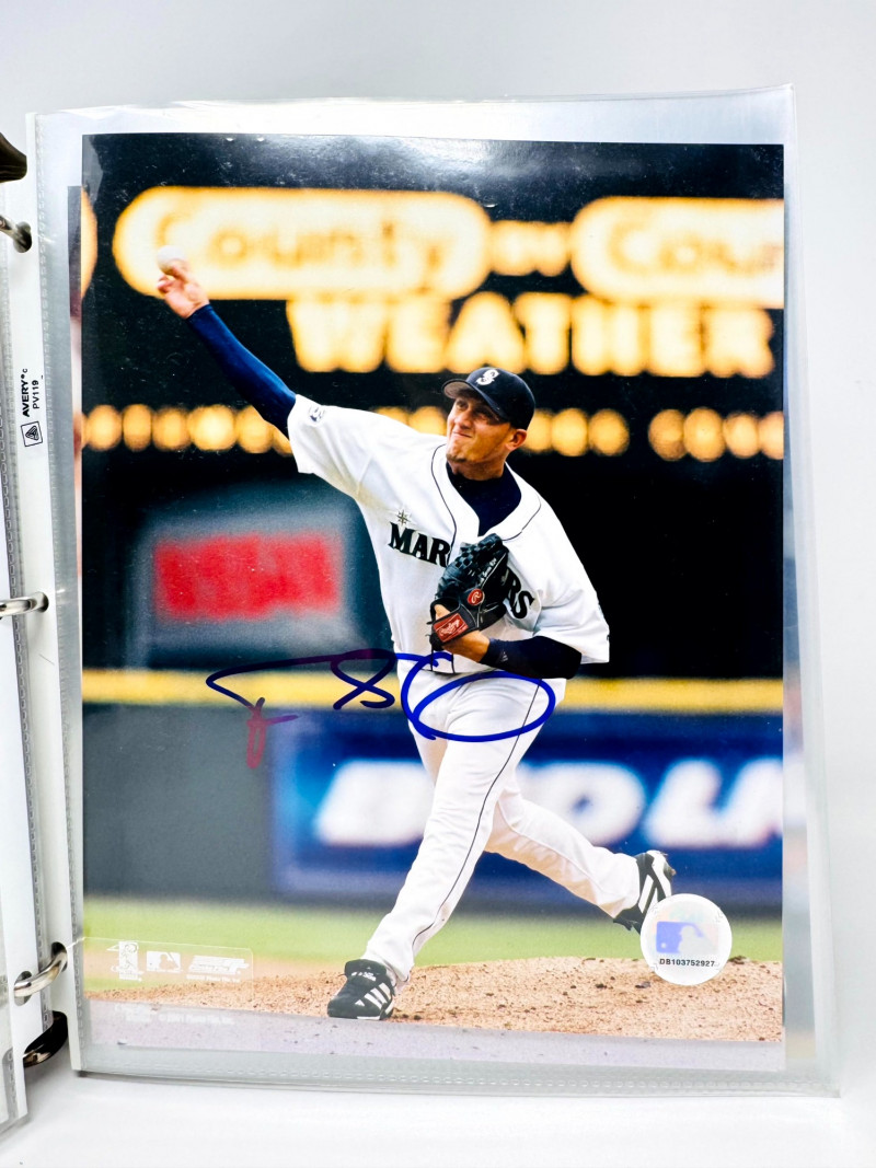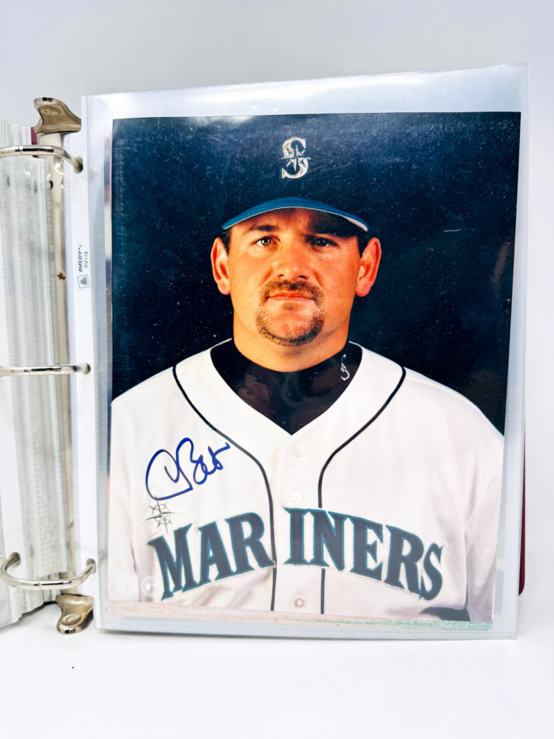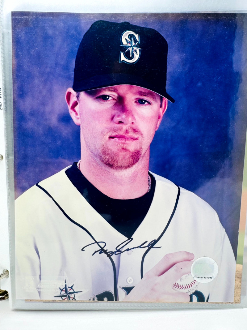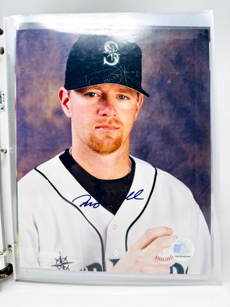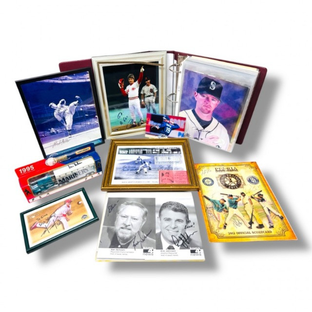 Signed Baseball Photo & Ephemera Lot – Feller, Rose, Larsen & More. Includes autographs from Bob Feller, Pete Rose, Don Larsen, Kyle Kendrick, Jay Buhner, Bobby Madritsch, and others