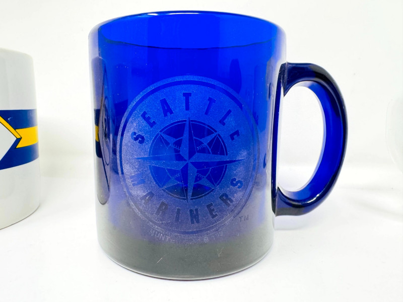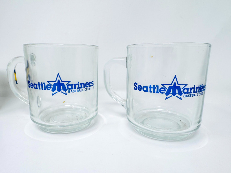 – (2) Clear glass mugs with early Mariners Baseball Club logo